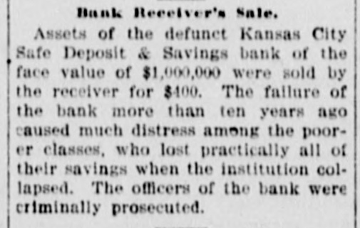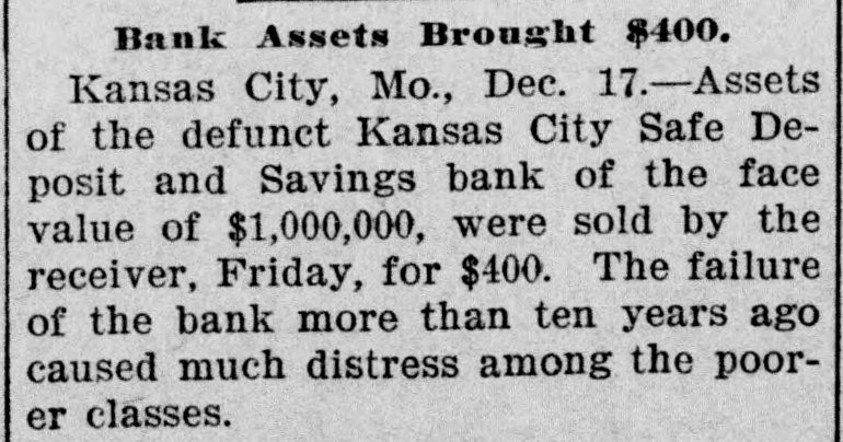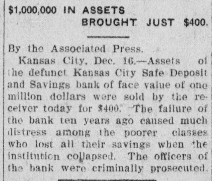$1,000,000 IN ASSETS BROUGHT JUST $400. By the Associated Press. of Kansas City, Dec. 16.-Assets the defunct Kansas City Safe Deposit and Savings bank of face value of one million dollars were sold by the receiver today for $400. -The failure of the bank ten years ago caused much distress among the poorer classes who lost all their savings when the institution collapsed. The officers of the bank were criminally prosecuted.