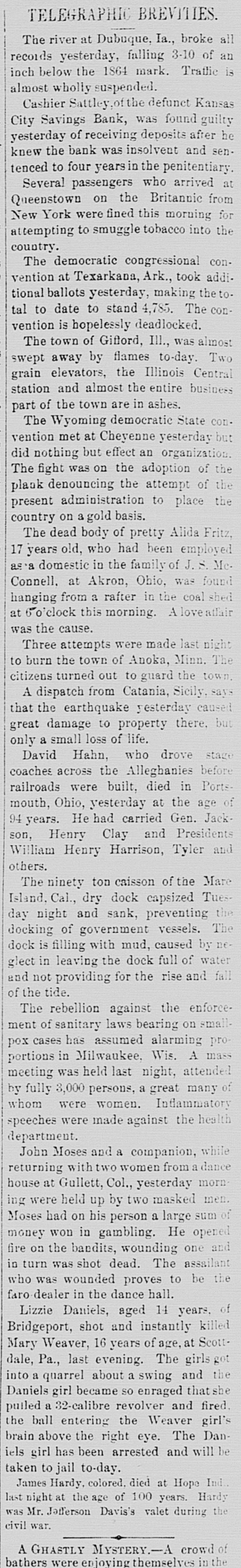 TELEGRAPHIC BREVITIES. The river at Dubuque, Ia., broke all records yesterday, falling 3-10 of an inch below the 1864 mark. Traffic is almost wholly suspended. Cashier Sattley of the defunct Kansas City Savings Bank, was found guilty yesterday of receiving deposits after he knew the bank was insolvent and sentenced to four years in the penitentiary. Several passengers who arrived at Queenstown on the Britannic from New York were fined this morning for attempting to smuggle tobacco into the country. The democratic congressional convention at Texarkana, Ark., took additional ballots yesterday, making the total to date to stand 4,785. The convention is hopelessly deadlocked. The town of Gifford, Ill., was almost swept away by flames to-day. Two grain elevators, the Illinois Central station and almost the entire business part of the town are in ashes. The Wyoming democratic State con. vention met at Cheyenne yesterday but did nothing but effect an organization. The fight was on the adoption of the plank denouncing the attempt of the present administration to place the country on a gold basis. The dead body of pretty Alida Fritz, 17 years old, who had been employed as'a domestic in the family of J.S. McConnell. at Akron, Ohio, was found hanging from a rafter in the coal shed at 6 o'clock this morning. A love affair was the cause. Three attempts were made last night to burn the town of Anoka, Minn. The citizens turned out to guard the town, A dispatch from Catania, Sicily, says that the earthquake yesterday caused great damage to property there, but only a small loss of life. David Hahn, who drove stage coaches across the Alleghanies before railroads were built, died in Portsmouth, Ohio, yesterday at the age of 94 years. He had carried Gen. Jackson, Henry Clay and Presidents William Henry Harrison, Tyler and others. The ninety ton caisson of the Mare Island, Cal., dry dock capsized Tuesday night and sank, preventing the docking of government vessels. The dock is filling with mud, caused by neglect in leaving the dock full of water and not providing for the rise and fall of the tide. The rebellion against the enforcement of sanitary laws bearing on smallpox cases has assumed alarming proportions in Milwaukee, Wis. A mass meeting was held last night, attended by fully 3,000 persons, a great many of whom were women. Inflammatory speeches were made against the health department. John Moses and a companion, while returning with two women from a dance house at Gullett, Col., yesterday morning were held up by two masked men. Moses had on his person a large sum of money won in gambling. He opened fire on the bandits, wounding one and in turn was shot dead. The assailant who was wounded proves to be the faro dealer in the dance hall. Lizzie Daniels, aged 14 years, of Bridgeport, shot and instantly killed Mary Weaver, 16 years of age, at Scottdale, Pa., last evening. The girls got into a quarrel about a swing and the Daniels girl became SO enraged that she puiled a 32-calibre revolver and fired, the ball entering the Weaver girl's brain above the right eye. The Daniels girl has been arrested and will be taken to jail to-day. James Hardy colored. died at Hope Ind. last night at the age of 100 years. Hardy was Mr. Jefferson Davis's valet during the civil war. A GHASTLY MYSTERY.-A crowd of bathers were enjoving themselves in the