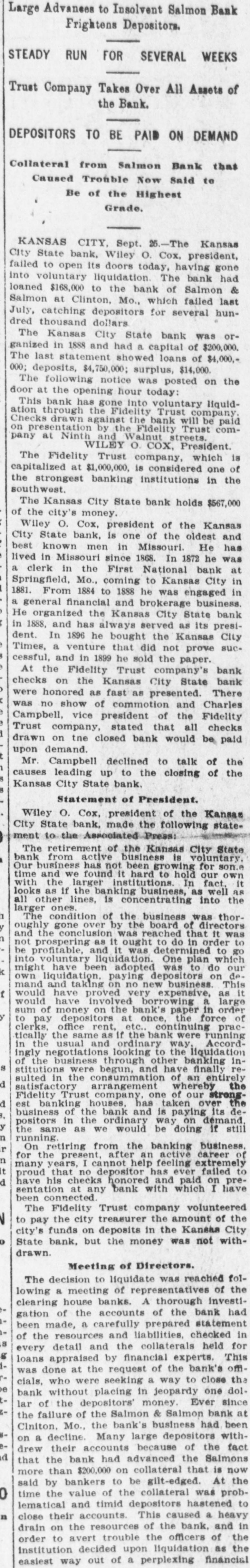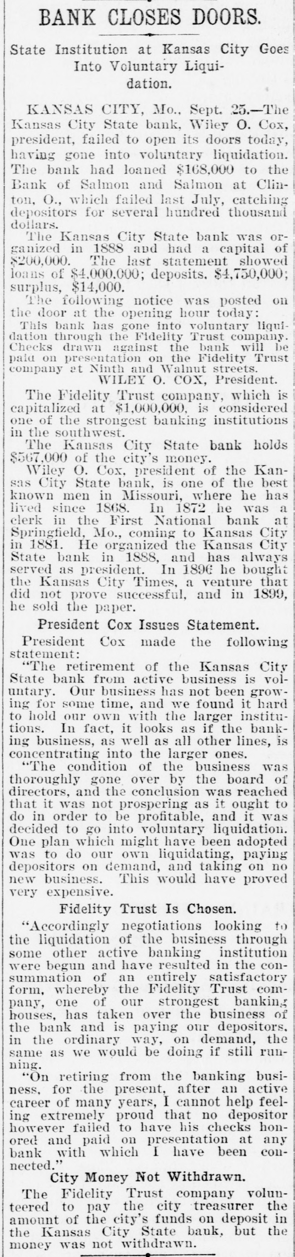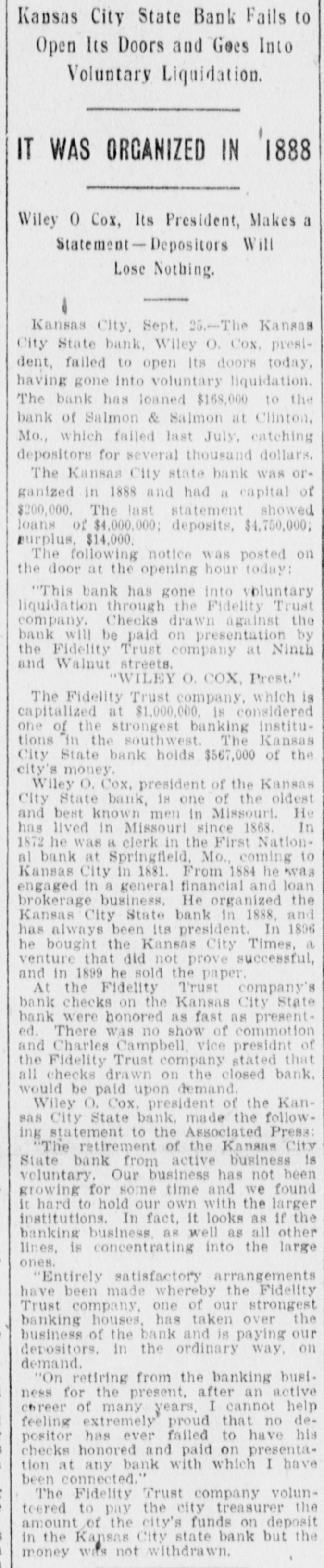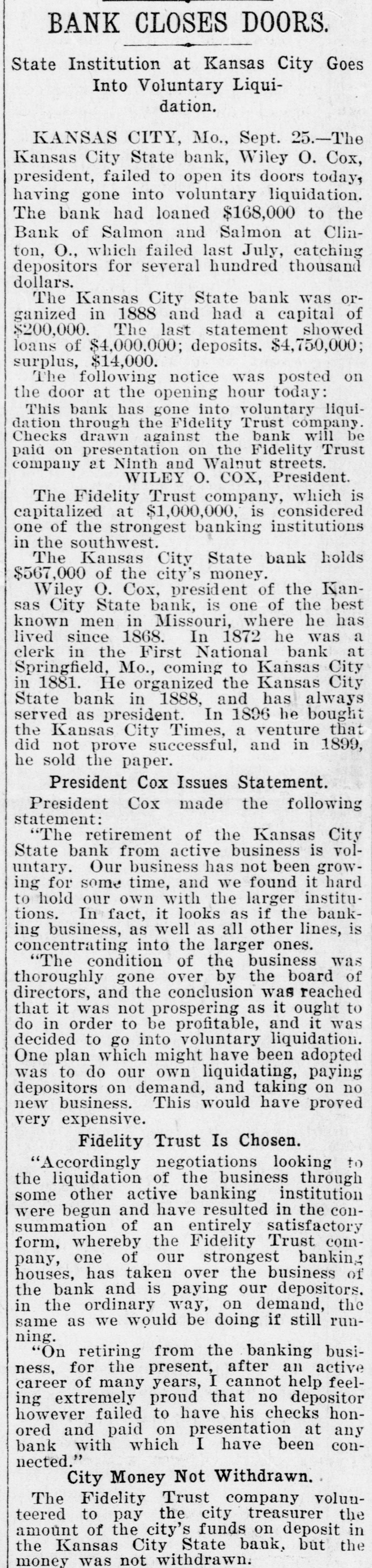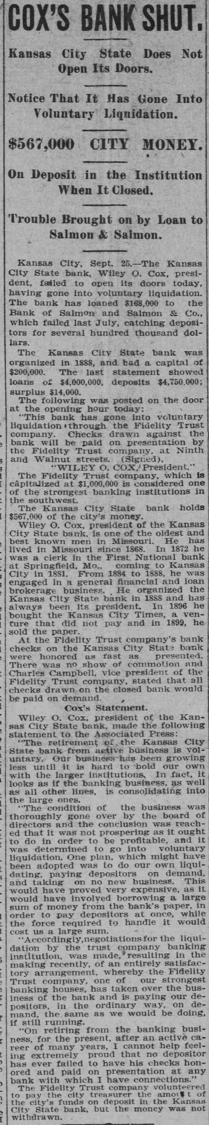 COX'S BANK SHUT. Kansas City State Does Not Open Its Doors. Notice That It Has Gone Into Voluntary Liqnidation. $567,000 CITY MONEY. On Deposit in the Institution When It Closed. Trouble Brought on by Loan to Salmon & Salmon. Kansas City, Sept. 25.-The Kansas City State bank, Wiley O. Cox, president, failed to open its doors today, having gone into voluntary liquidation. The bank has loaned $168,000 to the Bank of Salmon and Salmon & Co., which failed last July, catching depositors for several hundred thousand dollars. The Kansas City State bank was organized in 1888, and had a capital, of $200,000. The last statement showed loans of $4,000,000, deposits $4,750,000; surplus $14,000. The following was posted on the door at the opening hour today: "This bank has gone into voluntary liquidationthrough the Fidelity Trust company. Checks drawn against the bank will be paid on presentation by the Fidelity Trust company, at Ninth s and Walnut streets. (Signed), 'WILEY O. COX. President.' The Fidelity Trust company, which is capitalized at $1,000,000 is considered one of the strongest banking institutions in the southwest. The Kansas City State bank holds 1 $567,000 of the city's money. Wiley O. Cox, president of the Kansas City State bank, is one of the oldest and best known men in Missouri. He has lived in Missouri since 1868. In 1872 he was a clerk in the First National bank at Springfield, Mo., coming to Kansas City in 1881. From 1884 to 1888, he was engaged in a general financial and loan brokerage business. He organized the Kansas City State bank in 1888 and has always been its president. In 1896 he bought the Kansas City Times, a venture that did not pay and in 1899, he sold the paper. At the Fidelity Trust company's bank checks on the Kansas City State bank were honored as fast as presented. There was no show of commotion and Charles Campbell, vice president of the Fidelity Trust company, stated that all checks drawn on the closed bank would be paid on demand. Cox's Statement. Wiley O. Cox, president of the Kansas City State bank, made the following statement to the Associated Press: "The retirement of the Kansas City State bank from active business is voluntary. Our business has been growing less until it is hard to hold our own with the larger institutions, In fact, it looks as if the banking business, as well as all other lines, is consolidating into the large ones. "The condition of the business was thoroughly gone over by the board of directors and the conclusion was reached that it was not prospering as it ought to do in order to be profitable, and it was determined to go into voluntary liquidation. One plan, which might have been adopted was to do our own liquidating, paying depositors on demand, and taking on no new business. This would have proved very expensive, as it would have involved borrowing a large sum of money from the bank's paper, in order to pay depositors at once, while the force required to handle it would cost us a large sum. "Accordingly,negotiationsfor the liquidation by the trust company banking institution, was made, resulting in the making recently, of an entirely satisfactory arrangement, whereby the Fidelity Trust company. one of our strongest banking houses, has taken over the business of the bank and is paying our depositors, in the ordinary way, on demand, the same as we would be doing, if still running. "On retiring from the banking busi: ness, for the present, after an active career of many years, I cannot help feeling extremely proud that no depositor ) has ever failed to have his checks hone ored and paid on presentation at any ) bank with which I have connections." The Fidelity Trust company volunteered to pay the city treasurer the amount of ! the city's funds on deposit in the Kansas City State bank, but the money was not withdrawn. i