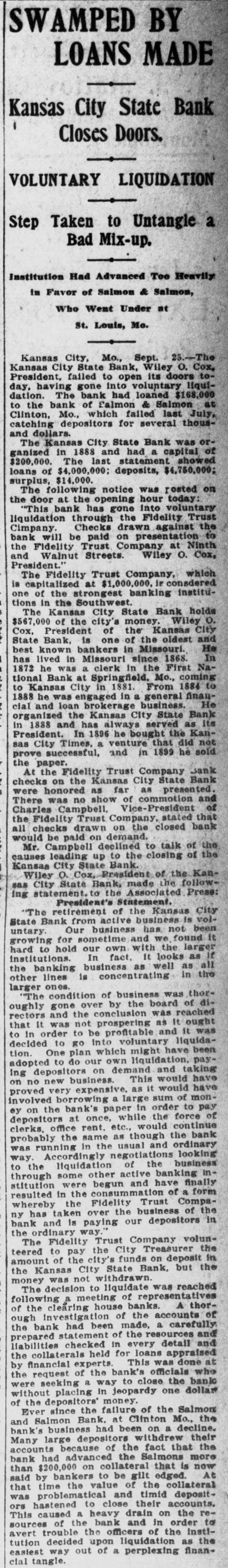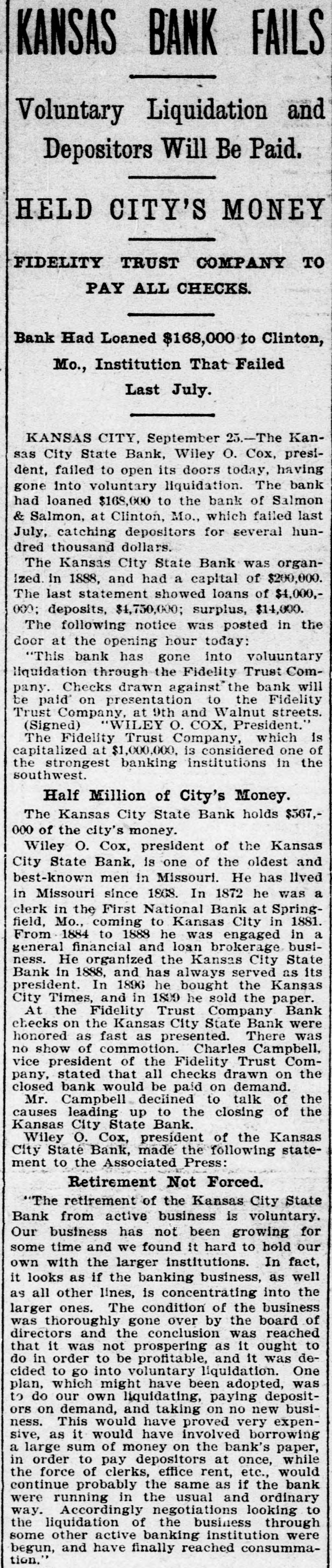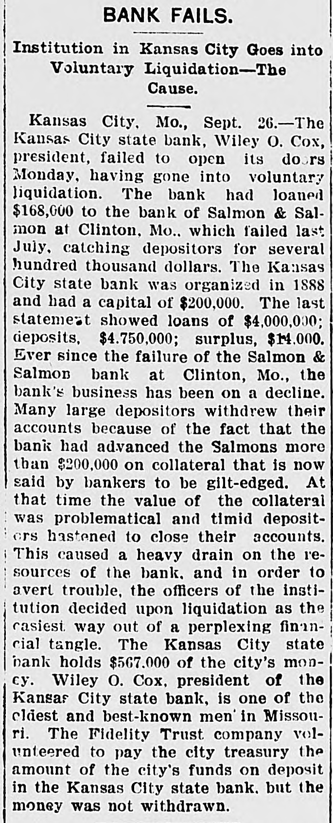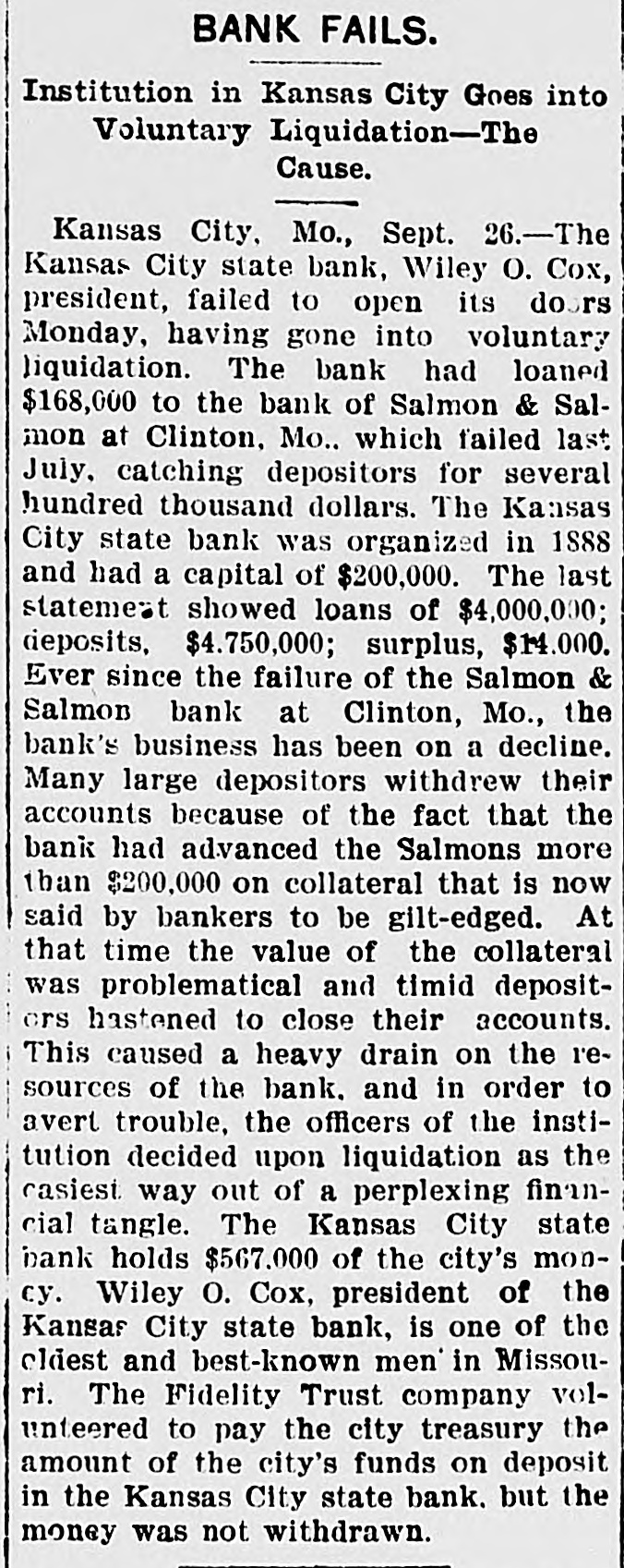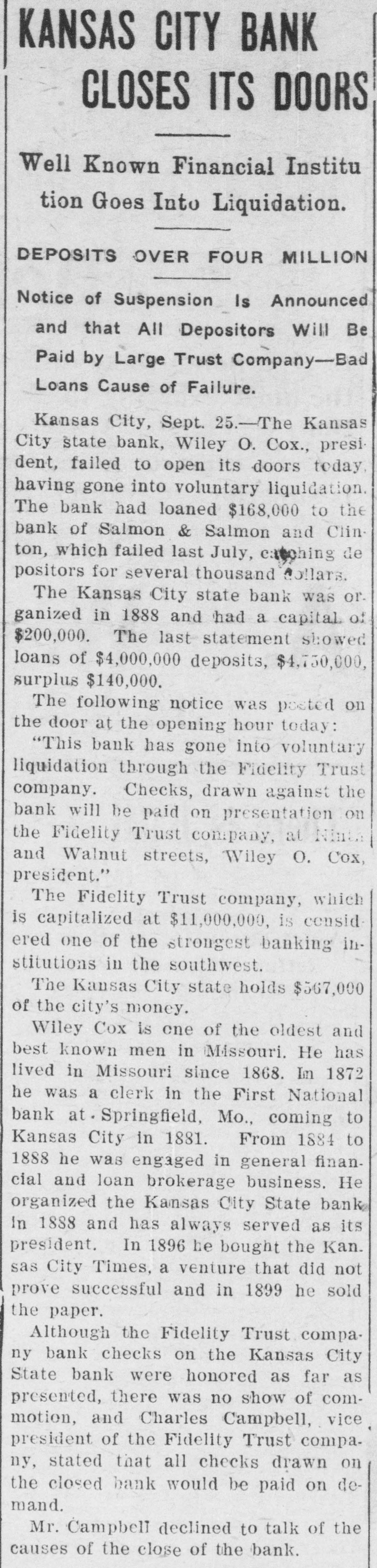 COX'S BANK SHUT. Kansas City State Does Not Open Its Doors. Notice That It Has Gone Into Voluntary Liqnidation. $567,000 CITY MONEY. On Deposit in the Institution When It Closed. Trouble Brought on by Loan to Salmon & Salmon. Kansas City, Sept. 25.-The Kansas City State bank, Wiley O. Cox, president, failed to open its doors today, having gone into voluntary liquidation. The bank has loaned $168,000 to the Bank of Salmon and Salmon & Co., which failed last July, catching depositors for several hundred thousand dollars. The Kansas City State bank was organized in 1888, and had a capital, of $200,000. The last statement showed loans of $4,000,000, deposits $4,750,000; surplus $14,000. The following was posted on the door at the opening hour today: "This bank has gone into voluntary liquidationthrough the Fidelity Trust company. Checks drawn against the bank will be paid on presentation by the Fidelity Trust company, at Ninth s and Walnut streets. (Signed), 'WILEY O. COX. President.' The Fidelity Trust company, which is capitalized at $1,000,000 is considered one of the strongest banking institutions in the southwest. The Kansas City State bank holds 1 $567,000 of the city's money. Wiley O. Cox, president of the Kansas City State bank, is one of the oldest and best known men in Missouri. He has lived in Missouri since 1868. In 1872 he was a clerk in the First National bank at Springfield, Mo., coming to Kansas City in 1881. From 1884 to 1888, he was engaged in a general financial and loan brokerage business. He organized the Kansas City State bank in 1888 and has always been its president. In 1896 he bought the Kansas City Times, a venture that did not pay and in 1899, he sold the paper. At the Fidelity Trust company's bank checks on the Kansas City State bank were honored as fast as presented. There was no show of commotion and Charles Campbell, vice president of the Fidelity Trust company, stated that all checks drawn on the closed bank would be paid on demand. Cox's Statement. Wiley O. Cox, president of the Kansas City State bank, made the following statement to the Associated Press: "The retirement of the Kansas City State bank from active business is voluntary. Our business has been growing less until it is hard to hold our own with the larger institutions, In fact, it looks as if the banking business, as well as all other lines, is consolidating into the large ones. "The condition of the business was thoroughly gone over by the board of directors and the conclusion was reached that it was not prospering as it ought to do in order to be profitable, and it was determined to go into voluntary liquidation. One plan, which might have been adopted was to do our own liquidating, paying depositors on demand, and taking on no new business. This would have proved very expensive, as it would have involved borrowing a large sum of money from the bank's paper, in order to pay depositors at once, while the force required to handle it would cost us a large sum. "Accordingly,negotiationsfor the liquidation by the trust company banking institution, was made, resulting in the making recently, of an entirely satisfactory arrangement, whereby the Fidelity Trust company. one of our strongest banking houses, has taken over the business of the bank and is paying our depositors, in the ordinary way, on demand, the same as we would be doing, if still running. "On retiring from the banking busi: ness, for the present, after an active career of many years, I cannot help feeling extremely proud that no depositor ) has ever failed to have his checks hone ored and paid on presentation at any ) bank with which I have connections." The Fidelity Trust company volunteered to pay the city treasurer the amount of ! the city's funds on deposit in the Kansas City State bank, but the money was not withdrawn. i