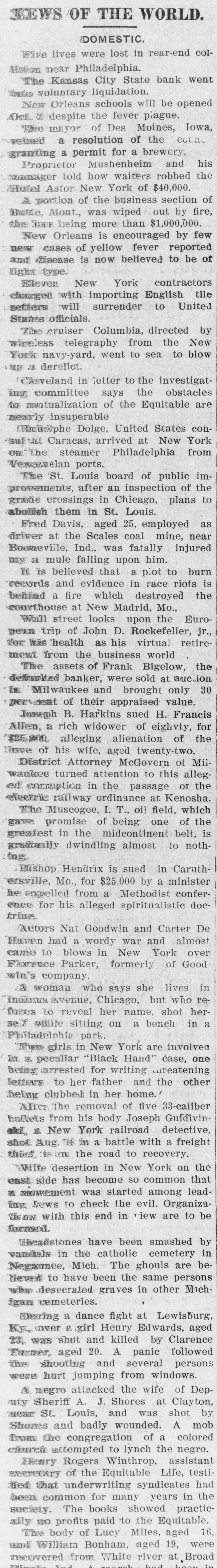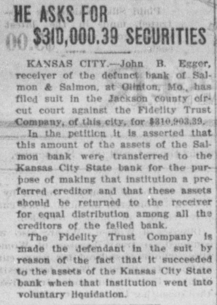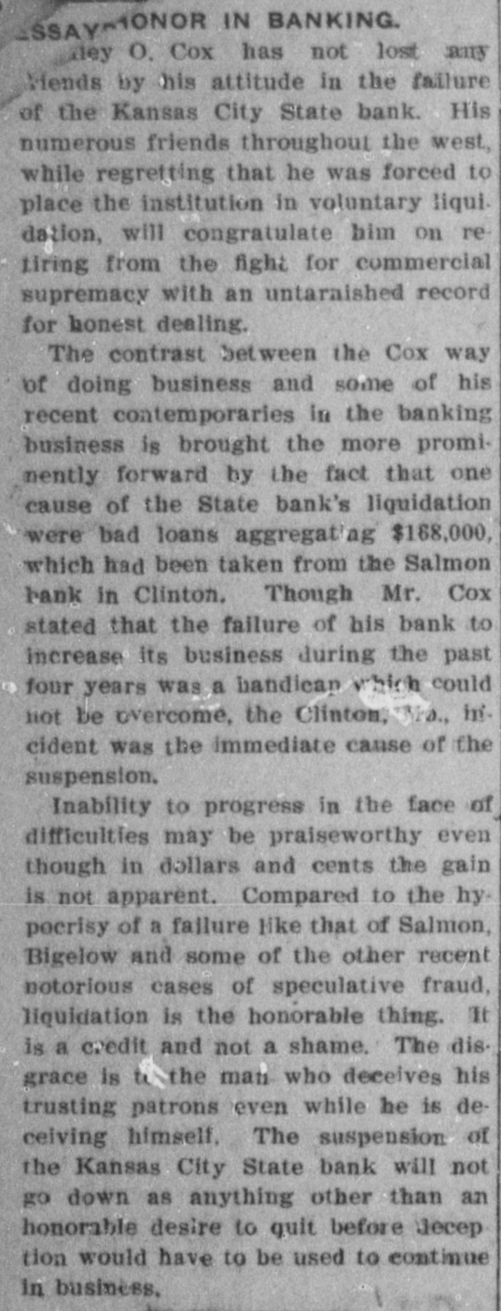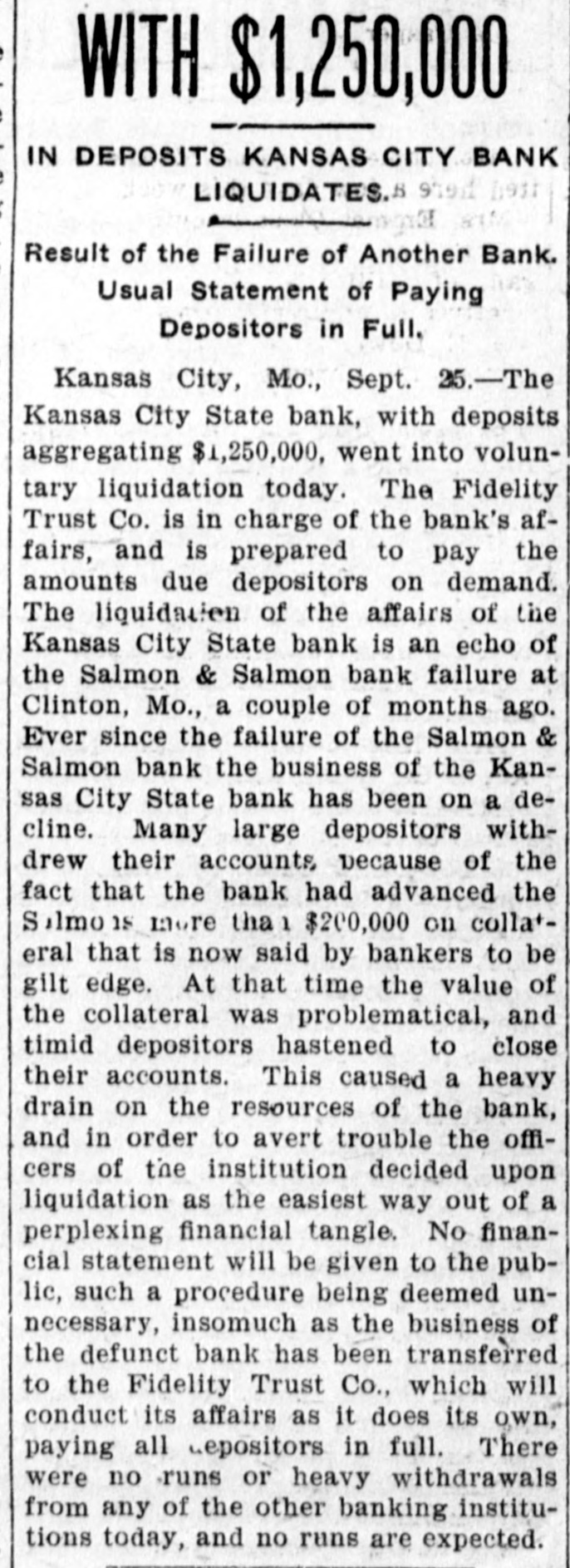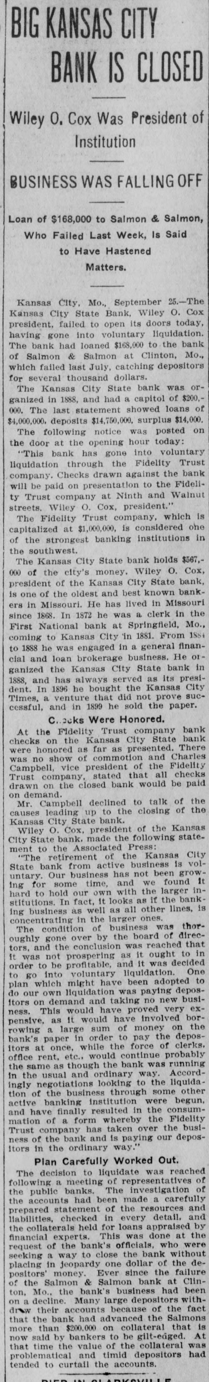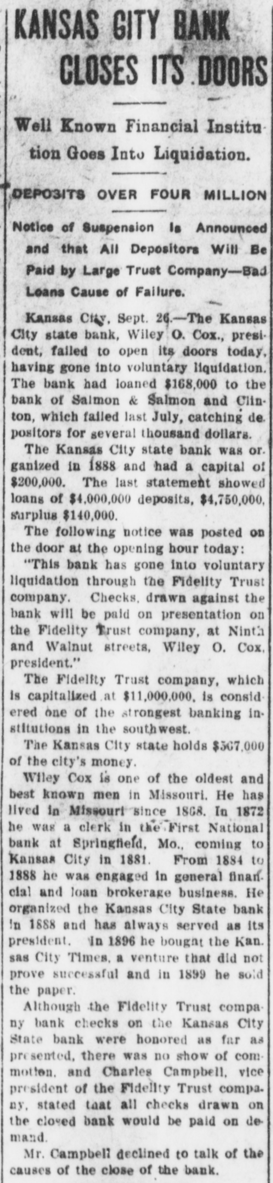 COX'S BANK SHUT. Kansas City State Does Not Open Its Doors. Notice That It Has Gone Into Voluntary Liqnidation. $567,000 CITY MONEY. On Deposit in the Institution When It Closed. Trouble Brought on by Loan to Salmon & Salmon. Kansas City, Sept. 25.-The Kansas City State bank, Wiley O. Cox, president, failed to open its doors today, having gone into voluntary liquidation. The bank has loaned $168,000 to the Bank of Salmon and Salmon & Co., which failed last July, catching depositors for several hundred thousand dollars. The Kansas City State bank was organized in 1888, and had a capital, of $200,000. The last statement showed loans of $4,000,000, deposits $4,750,000; surplus $14,000. The following was posted on the door at the opening hour today: "This bank has gone into voluntary liquidationthrough the Fidelity Trust company. Checks drawn against the bank will be paid on presentation by the Fidelity Trust company, at Ninth s and Walnut streets. (Signed), 'WILEY O. COX. President.' The Fidelity Trust company, which is capitalized at $1,000,000 is considered one of the strongest banking institutions in the southwest. The Kansas City State bank holds 1 $567,000 of the city's money. Wiley O. Cox, president of the Kansas City State bank, is one of the oldest and best known men in Missouri. He has lived in Missouri since 1868. In 1872 he was a clerk in the First National bank at Springfield, Mo., coming to Kansas City in 1881. From 1884 to 1888, he was engaged in a general financial and loan brokerage business. He organized the Kansas City State bank in 1888 and has always been its president. In 1896 he bought the Kansas City Times, a venture that did not pay and in 1899, he sold the paper. At the Fidelity Trust company's bank checks on the Kansas City State bank were honored as fast as presented. There was no show of commotion and Charles Campbell, vice president of the Fidelity Trust company, stated that all checks drawn on the closed bank would be paid on demand. Cox's Statement. Wiley O. Cox, president of the Kansas City State bank, made the following statement to the Associated Press: "The retirement of the Kansas City State bank from active business is voluntary. Our business has been growing less until it is hard to hold our own with the larger institutions, In fact, it looks as if the banking business, as well as all other lines, is consolidating into the large ones. "The condition of the business was thoroughly gone over by the board of directors and the conclusion was reached that it was not prospering as it ought to do in order to be profitable, and it was determined to go into voluntary liquidation. One plan, which might have been adopted was to do our own liquidating, paying depositors on demand, and taking on no new business. This would have proved very expensive, as it would have involved borrowing a large sum of money from the bank's paper, in order to pay depositors at once, while the force required to handle it would cost us a large sum. "Accordingly,negotiationsfor the liquidation by the trust company banking institution, was made, resulting in the making recently, of an entirely satisfactory arrangement, whereby the Fidelity Trust company. one of our strongest banking houses, has taken over the business of the bank and is paying our depositors, in the ordinary way, on demand, the same as we would be doing, if still running. "On retiring from the banking busi: ness, for the present, after an active career of many years, I cannot help feeling extremely proud that no depositor ) has ever failed to have his checks hone ored and paid on presentation at any ) bank with which I have connections." The Fidelity Trust company volunteered to pay the city treasurer the amount of ! the city's funds on deposit in the Kansas City State bank, but the money was not withdrawn. i