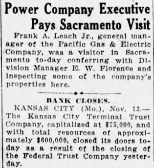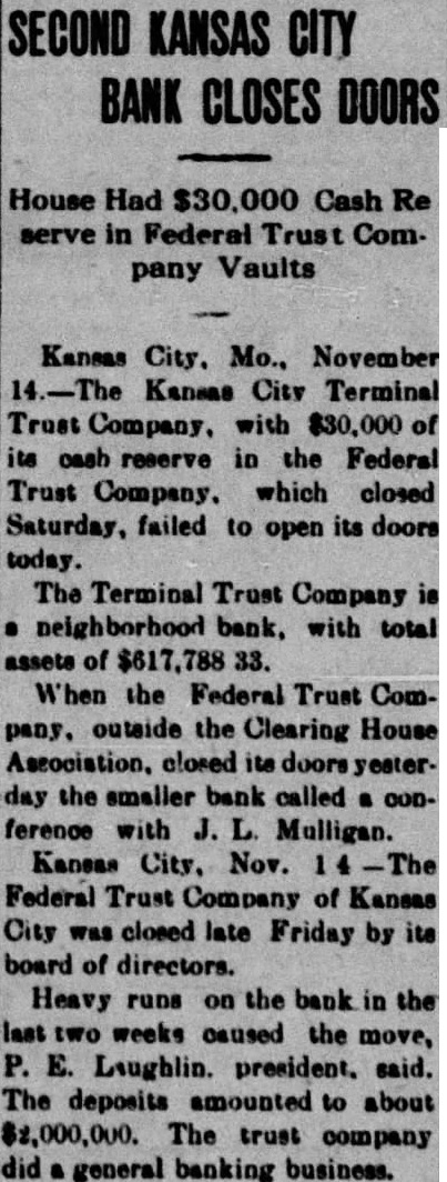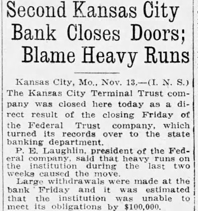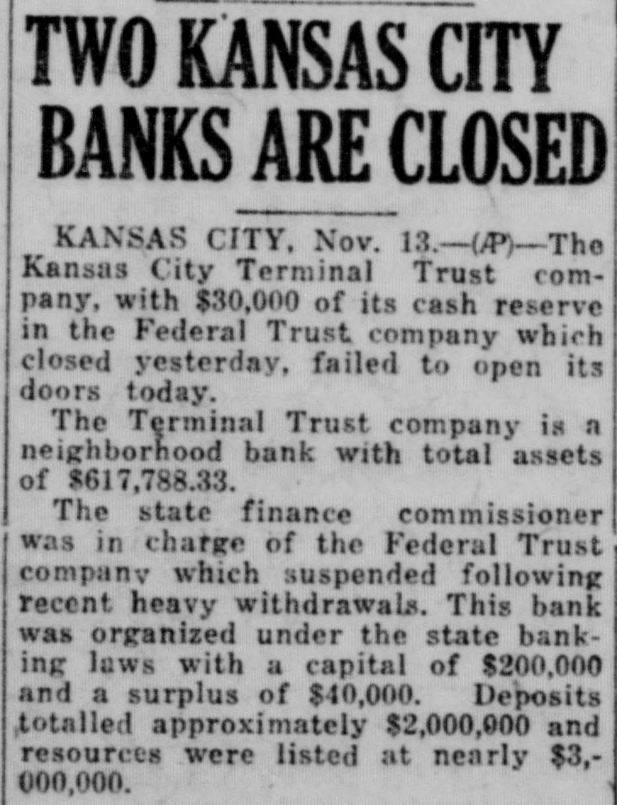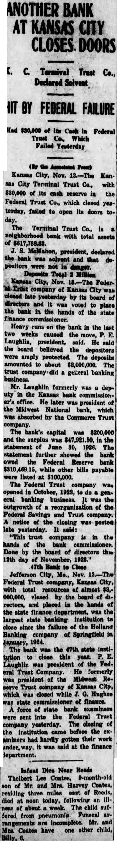 ANOTHER BANK KANSAS CITY C. Termival Trust Declared Selvent FEDERAL FAILURE Had $30,000 of its Cash in Federal Trust Co., Which Failed Yesterday (By the Associated Press) Kansas City, Nov. Kansas City Terminal Trust Co., with $30,000 of its cash reserve in the Federal Trust Co., which closed yesterday, failed to open its doors today. The Terminal Trust Co., is neighborhood bank with total assets of S. McMahon, president, declared the bank was solvent and that positors were not in danger. Deposits Total Million Kansas City, Nov. Federcompany of Kansas City closed late yesterday by its board of directors and it voted was to place the bank in the hands of the state finance commissioner. Heavy runs on the bank in the last two weeks caused the move, Laughlin, president, said. He said the board believed the depositors were amply protected. The deposits amounted to about $2,000,000. The trust general banking business. Mr. Laughlin formerly was deputy in the Kansas bank commissioner's office. He later was president of the Midwest National bank, which was absorbed by the Commerce Trust company. The bank's capital was $200,000 and the surplus was $47,921.50, in the statement of June 30, 1926. The statement further showed the bank owed the Federal Reserve bank $310,469.15, while other bills payable were listed at $100,000. The Federal Trust company was opened in October, 1923, to do a general banking business. was the outgrowth of reorganization of the Federal Savings and Trust company. notice of the closing was posted late yesterday. It said: "This trust company is in the hands of the bank commissioner. Done by the board of directors this 12th day of November, 1926." 47th Bank to Close Jefferson City, Mo., Nov. Federal Trust company, Kansas City, with total resources of almost $3,000,000, closed by the board of rectors, and placed in the hands of the state finance department, was the largest state banking institution to close since the failure of the Holland Banking of Springfield in company January, 1924. The bank was the 47th state institution to close this year. Laughlin was president of the Federal Trust Company. He formerly was president of the Midwest Reserve Trust company of Kansas City, which was closed while G. Hughes was state commissioner of finance. force of state bank examiners were sent into the Federal Trust company yesterday. The closing of the institution came before the examiners had hardly gotten their work it was said at the finance department. Infant Dies Near Reeds Thelbert Lee Coates, 9-month-old son of Mr. and Mrs. Harvey Coates, residing three miles east of Reeds, died at noon today, following an illness of about week. The child suffered from Funeral arpneumonia. rangements are incomplete. Mr. and Mrs. Coates have one other child, Billy,