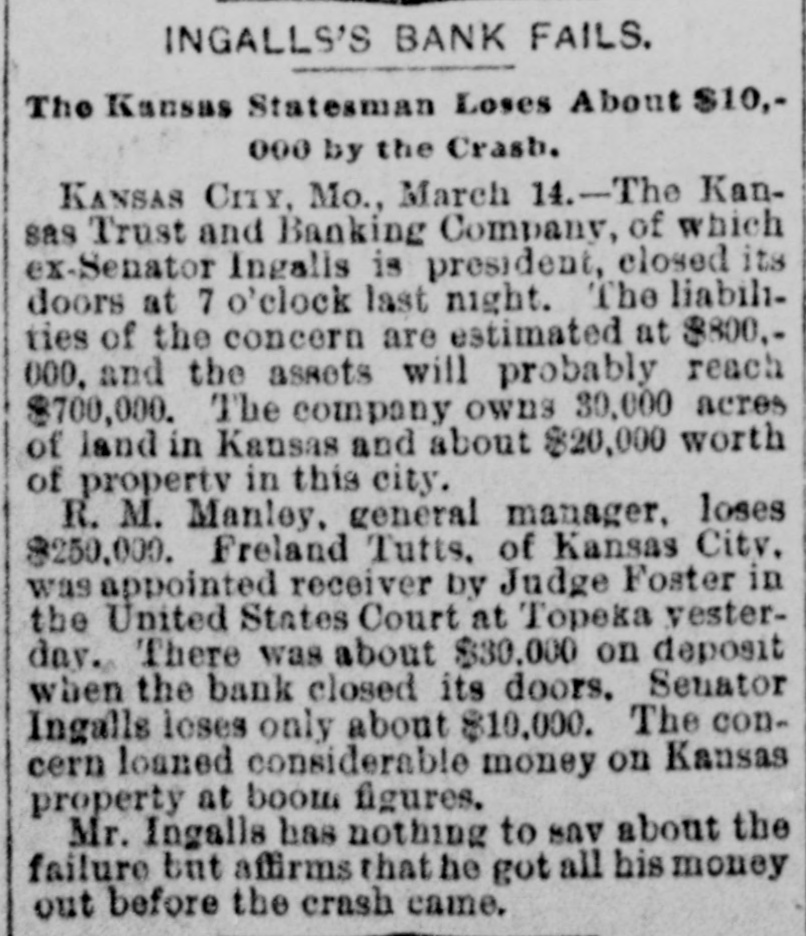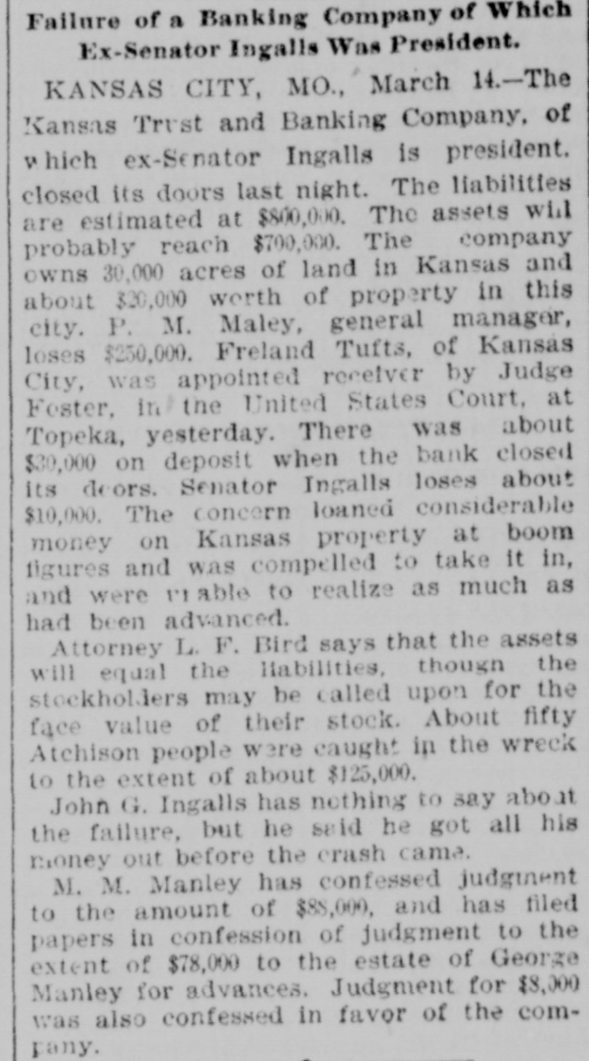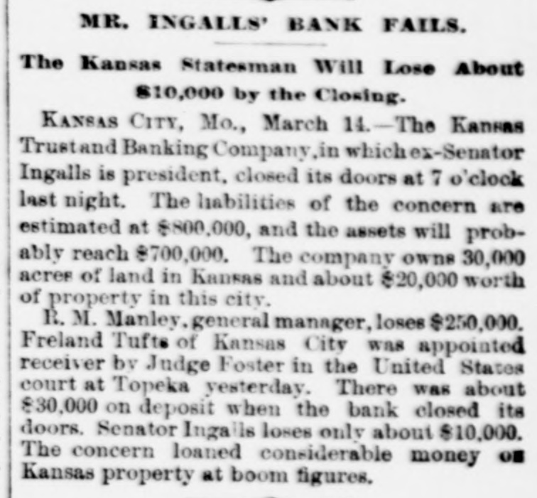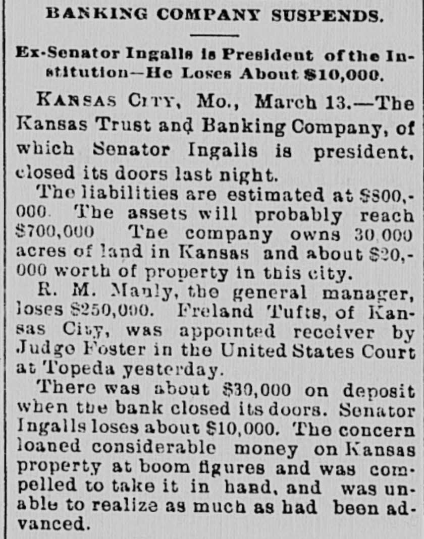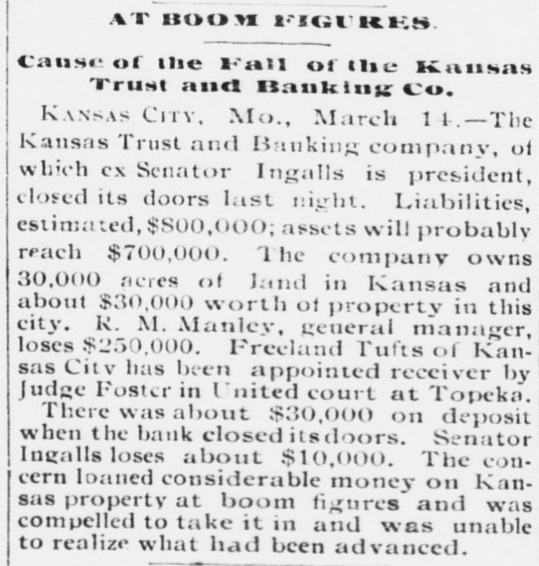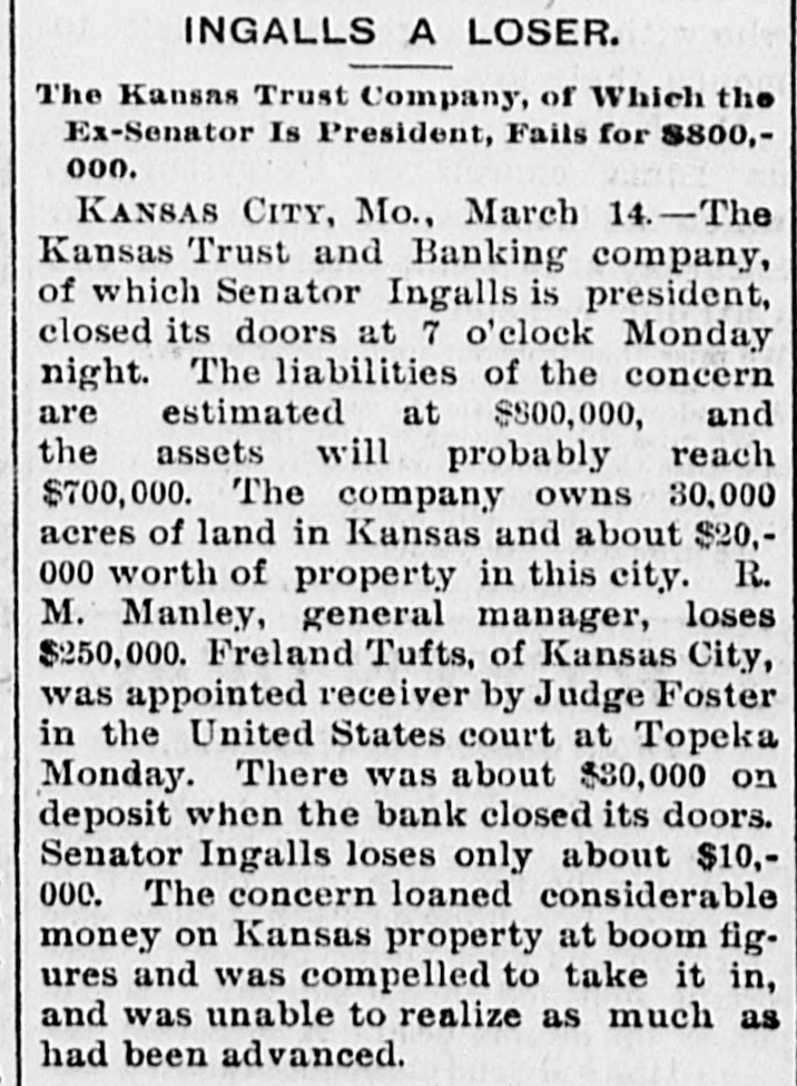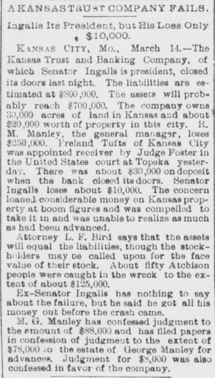 BUSINESS TROUBLES. Some of the Wrecks Caused by the Great Financial Depression. JANUARY. 6. Wickham & Co., wholesale fish dealers of Huron, O., failed for $250,000. FEBRUARY. 2. The First National bank of Little Rock suspended. 8. The banking house of F. V. Rockarellow at Wilkesbarre, Pa., closed its doors. 93. Beaupre, Keogh & Davis, wholesale grocers, assigned in St. Paul: liabilities over $400,000. MARCH. 13. The Atkinson House Furnishing company of Maine assigned in Boston: liabilities, $1,500,000. 14. The Kansas Trust and Banking company, at Kansas City, suspended, with liabilities of $800,000. 23. Dobbins & Dazy, cotton brokers, assigned in Nashville: liabilities, $1,000,000. APRIL. 7. The Northwestern State bank of Sibley, Ia., closed its doors: liabilities, $150,000. 12. The English, Scottish and Australian Chartered bank failed, with liabilities of £8,4 000,000. 20. The Australian Joint Stock bank failed for £13,000,000. 22. The Bank of Milbank, S. D., assigned, with liabilities of $100,000. 25. The Union Loan and Trust company of Sioux City closed its doors: liabilities, $750.00 000. 30. The National Bank of Australasia failed for £7,500,000. MAY. 1. F. H. Weeks, president of the Land and River Improvement company, West Superior, Wis., assigned. 8. H. H. Warner, the patent medicine manufacturer of Rochester, assigned: liabilities estimated at $500,000. 9. The Bank of Victoria, at Melbourne, suspended, with £2,400,000 liabilities. 11. The Capital National bank. at Indianapo lis, suspended. R. R. Robinson & Co., bankers of Wilmington, Del., failed, with liabilities of over $326,000. 12. The Sioux City (la.) Engine works suspended: liabilities, $200,000. Thomas & Sons, whisky dealers in Louis ville, failed owing from $150,000 to $400,000. 13. Bank failures at Orleans and Rossville Ind., at Freeport, O., and Rockford, Mich. Steel company at Bellville, Ills., placed in hands of a receiver. Kendall & Smith, grain dealers of Lincoln, Neb., failed for over $250,000. 15. Erastus Wiman, a New York capitalist, made an assignment. 26. Ex-Secretary of the Treasury Charles Foster of Fostoria, O., assigned, with liabilities of nearly $1,000,000. 28. National banks at Fargo and Lakota, N. D., closed by the comptroller. JUNE. 5. The Kansas Grain company, owning 106 elevators, failed. JULY. 18. Exciting bank panic in Denver. 25. The Erie railway went into the hands of receivers: the floating debt is $6,000,000. AUGUST. 2. The North American Packing and Provision company assigned in Chicago, with $750,000 liabilities. 4. Receivers were appointed for the business of J. H. Walker & Co., dry goods dealers, who succeeded to the Chicago trade or A. T. Stewart & Co.; debts, $2,000,000. N. L. Carte & Co., the old tin plate import. ers, $350,000. assigned in New York city; liabilities, 9. R. H. Coleman, the "Iron King" of Lebanon, Pa., assigned. DECEMBER. 1. Abe Stein & Co., heavy importers of goat skins, hides, etc., failed in New York for over $1,000,000. 4. Green B. Raum. Jr., general merchant and Indian trader at Perry, O. T., failed. The Citizens' National bank of Grand Island, Nob., closed its doors. 5. N. J. Schloss & Co., wholesale clothiers in New York, assigned.