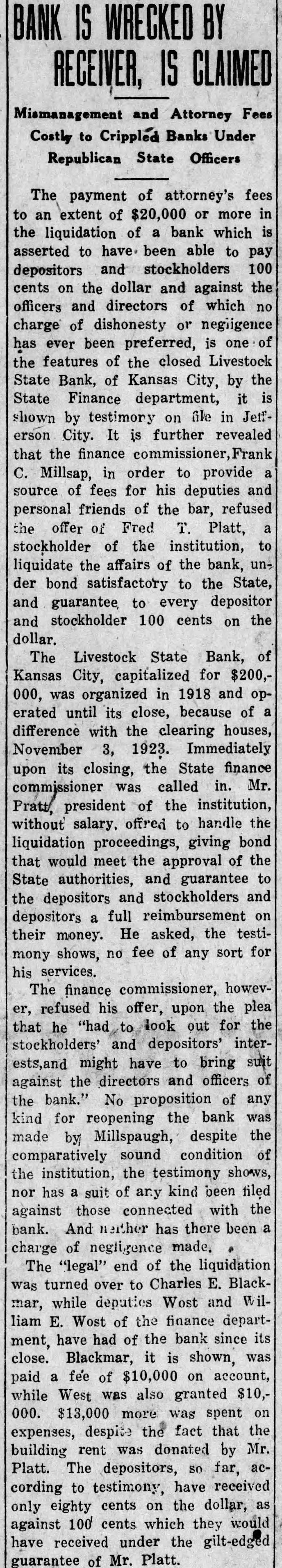 BANK IS WRECKED BY RECEIVER, IS CLAIMED Mismanagement and Attorney Fees Costly to Crippled Banks Under Republican State Officers The payment of attorney's fees to an extent of $20,000 or more in the liquidation of a bank which is asserted to have. been able to pay depositors and stockholders 100 cents on the dollar and against the officers and directors of which no charge of dishonesty or negligence has ever been preferred, is one of the features of the closed Livestock State Bank, of Kansas City, by the State Finance department, it is shown by testimory on file in Jetferson City. It is further revealed that the finance commissioner, Frank C. Millsap, in order to provide a source of fees for his deputies and personal friends of the bar, refused the offer of Fred T. Platt, a stockholder of the institution, to liquidate the affairs of the bank, under bond satisfactory to the State, and guarantee to every depositor and stockholder 100 cents on the dollar. The Livestock State Bank, of Kansas City, capitalized for $200,000, was organized in 1918 and operated until its close, because of a difference with the clearing houses, November 3, 1923. Immediately upon its closing, the State finance commissioner was called in. Mr. Pratt, president of the institution, without salary. offred to handle the liquidation proceedings, giving bond that would meet the approval of the State authorities, and guarantee to the depositors and stockholders and depositors a full reimbursement on their money. He asked, the testimony shows, no fee of any sort for his services. The finance commissioner, however, refused his offer, upon the plea that he "had to look out for the stockholders' and depositors' interests,and might have to bring suit against the directors and officers of the bank." No proposition of any kind for reopening the bank was made by Millspaugh, despite the comparatively sound condition of the institution, the testimony shows, nor has a suit of any kind been filed against those connected with the bank. And nerther has there been a charge of negligence made. The "legal" end of the liquidation was turned over to Charles E. Blackmar, while deputies Wost and William E. Wost of the finance department, have had of the bank since its close. Blackmar, it is shown, was paid a fee of $10,000 on account, while West was also granted $10,000. $13,000 more was spent on expenses, despite the fact that the building rent was donated by Mr. Platt. The depositors, so far, according to testimony, have received only eighty cents on the dollar, as against 100 cents which they would have received under the gilt-edged guarantee of Mr. Platt.