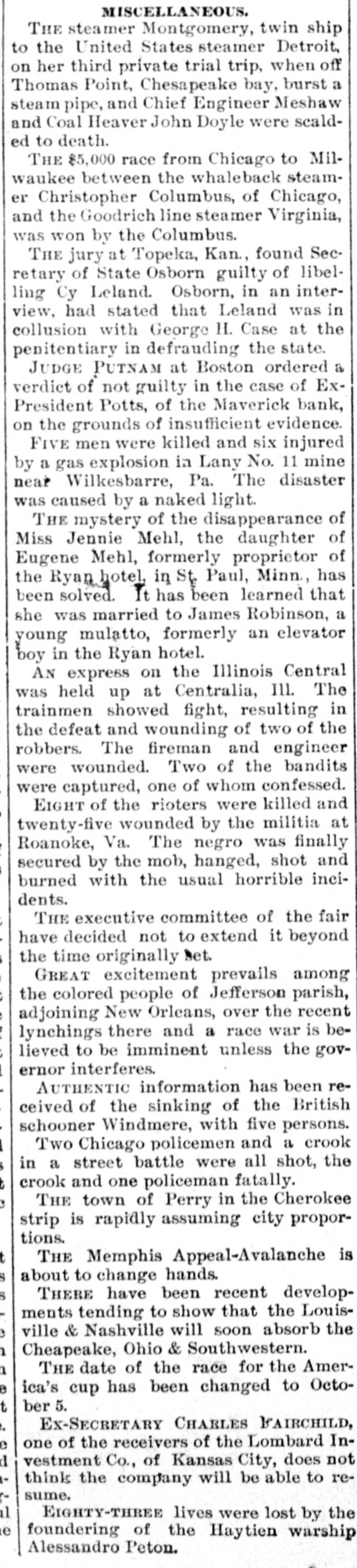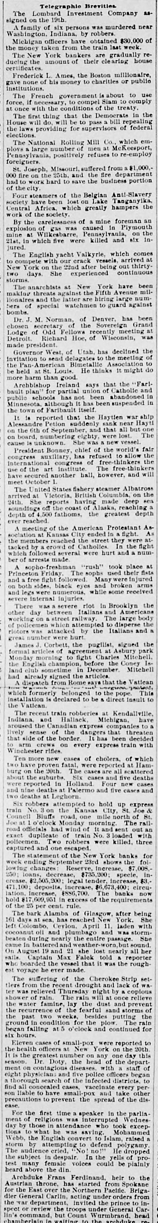 St. Joseph, Missouri, suffered from a $1,000,000 fire on the 25th, and the fire department had to work hard to save the business portion of the city.