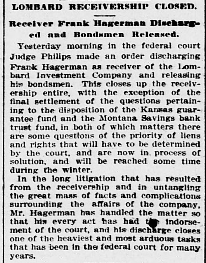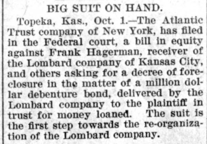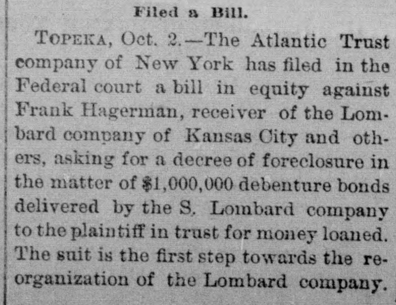 BUSINESS EMBARRASSMENTS. Minneapolis, Minn., Jan. 30.-The Northern Savings and Loan Association went into the hands of a receiver yesterday. Its last statement showed a total of $12,217 assets. The association was lable on its instalment stock of $23,822. Kansas City, Mo., Jan. 30.-Judge Phillips yesterday confirmed the sale of the assets in the case of the New-York Security and Trust Company et al against the Lombard Investment Company et al. The title is invested in the purchasers-James Salman, Frank K. Hipple and William W. Crapo-upon their paving the balance of the purchase price of $200.000. The properties enumerated are the Lombard Investment Company, of Kansis: the Lombard Investment Company, of Missouri: Valley Loan and Trust Company, Alliance Trust Company and City Real Estate Company. The title is Subject to any contracts made by a majority of the five receivers on or before March 18, 1895. or by the sole recelver since that time.