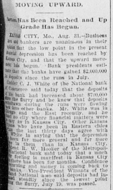 MOVING UPWARD. Bottom Has Been Reached and Up Grade Has Begun. KANSAS CITY, Mo., Aug. 31.-Business are of bankers are unanimous in their viske that the low point in the present Inspelal depression has been reached by City, and that the upward movemeat bas begun. Bank presidents estlnate that the banks have gained $2,000,000 is deposits since the runs in July. Cashier C. J. White of the National bank X Commerce said today that the deposits if Ms bank had Increased about $700,000 the the flurry and he knew that deposits windrawn during the runs were Howing Into other banks. Mr. White was in Oleago and the East recently. and he has no elty where financial matters were as May as in Kansas City, Other Kansas who have been in Eastern cities Pain the last thirty days agree with White in saying that the depression been far more general and far more be in them than in Kansas City. dent R. W. Hooker of the MetropoliNational bank said today that a much to feeling is manifest in Kansas City there has been for months. Confidence murning and money is coming back to banks. Vice-President Winants of the and National also said deposits had inused steadily since the lowest point mg the flurry, July 19, was passed.