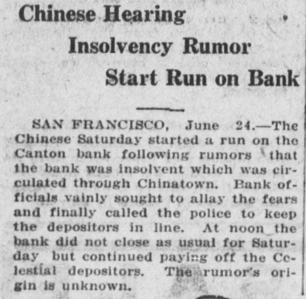 Chinese Hearing Insolvency Rumor Start Run on Bank SAN FRANCISCO, June 24.-The Chinese Saturday started a run on the Canton bank following rumors that the bank was insolvent which was circulated through Chinatown. Bank officials vainly sought to allay the fears and finally called the police to keep the depositors in line. At noon the bank did not close as usual for Saturday but continued paying off the Celestial depositors. The rumor's origin is unknown.
