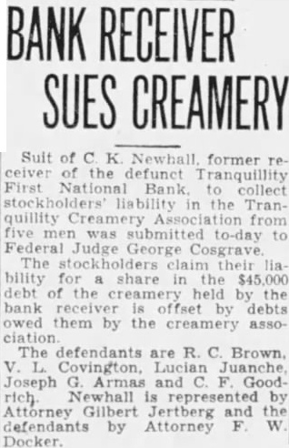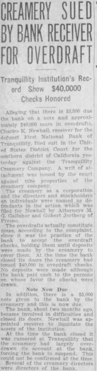 NEWHALL NAMED BANK RECEIVER AT TRANQUILLITY Examiner Says Reported Overdraft Not Shown On Books By ROY G. GOODWIN (Fresno Staff Correspondent) WASHINGTON Feb. First National Bank of Tranquillity, Califormia, was closed by order of its board of directors, effective This the statement made the office of the comptroller currency The office clined comment further upon the cause the action at the Charles K. Newhall, by the comptrol of also the United States National Bank Dinuba which closed its doors in 1927 TALKED Feb. That tentative plans the First National Bank of were being but that definite been done the far the statement to-day National Bank Examiner Price, have charge the bank since falled to open for business yesterday. Price said his examination of the records the bank had not yet the reason the collapse the institution. an rumored street talk as the of the bank's failure did not appear on the bank's books. Any plan for reorganization and the bank Price said, would require the approvof the before it could be put into effect