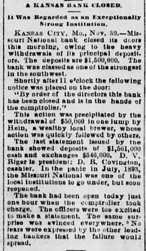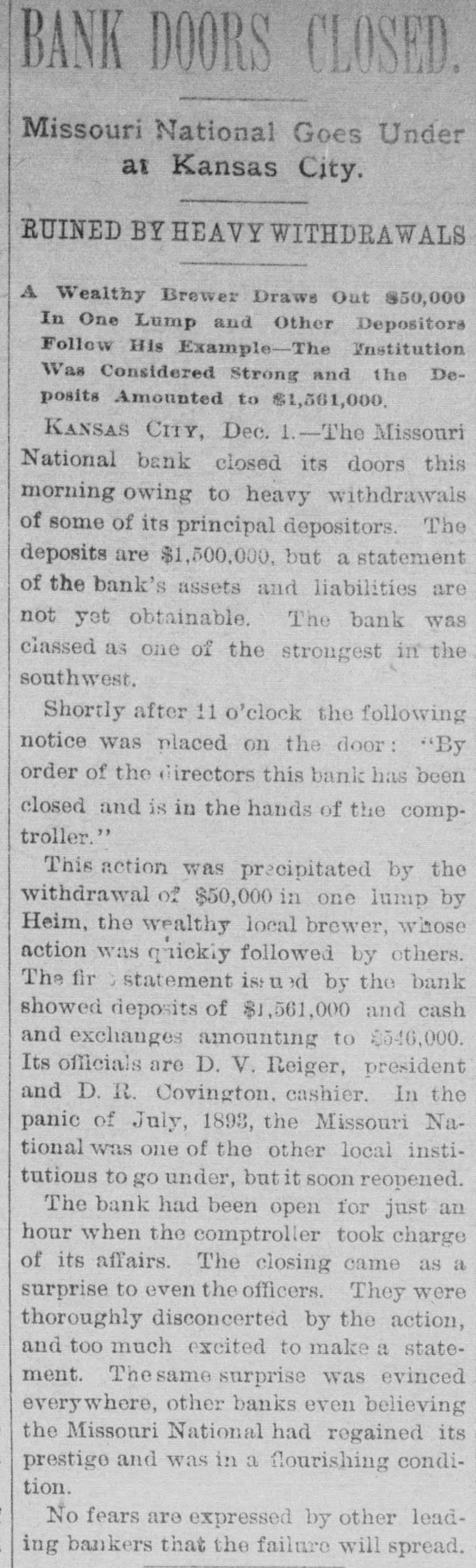 BANK DOORS CLOSED. Missouri National Goes Under at Kansas City. RUINED BY HEAVY WITHDRAWALS A Wealthy Brewer Draws Out $50,000 In One Lump and Other Depositors Follow His Example-The Institution Was Considered Strong and the Deposits Amounted to $1,561,000. KANSAS CITY, Dec. 1.-The Missouri National bank closed its doors this morning owing to heavy withdrawals of some of its principal depositors. The deposits are $1,500,000. but a statement of the bank's assets and liabilities are not yet obtainable. The bank was classed as one of the strongest in the southwest. Shortly after 11 o'clock the following notice was placed on the door : "By order of the directors this bank has been closed and is in the hands of the comptroller." This action was precipitated by the withdrawal of $50,000 in one lump by Heim, the wealthy local brewer, whose action was quickly followed by others. The fir ; statement issued by the bank showed deposits of $1,561,000 and cash and exchanges amounting to $546,000. Its officials are D. V. Reiger, president and D. R. Covington, cashier. In the panic of July, 1893, the Missouri National was one of the other local institutions to go under, butitsoon reopened. The bank had been open for just an hour when the comptroller took charge of its affairs. The closing came as a surprise to even the officers. They were thoroughly disconcerted by the action, and too much excited to make a statement. The same surprise was evinced everywhere, other banks even believing the Missouri National had regained its prestige and was in a flourishing condition. No fears are expressed by other leading bankers that the failure will spread.