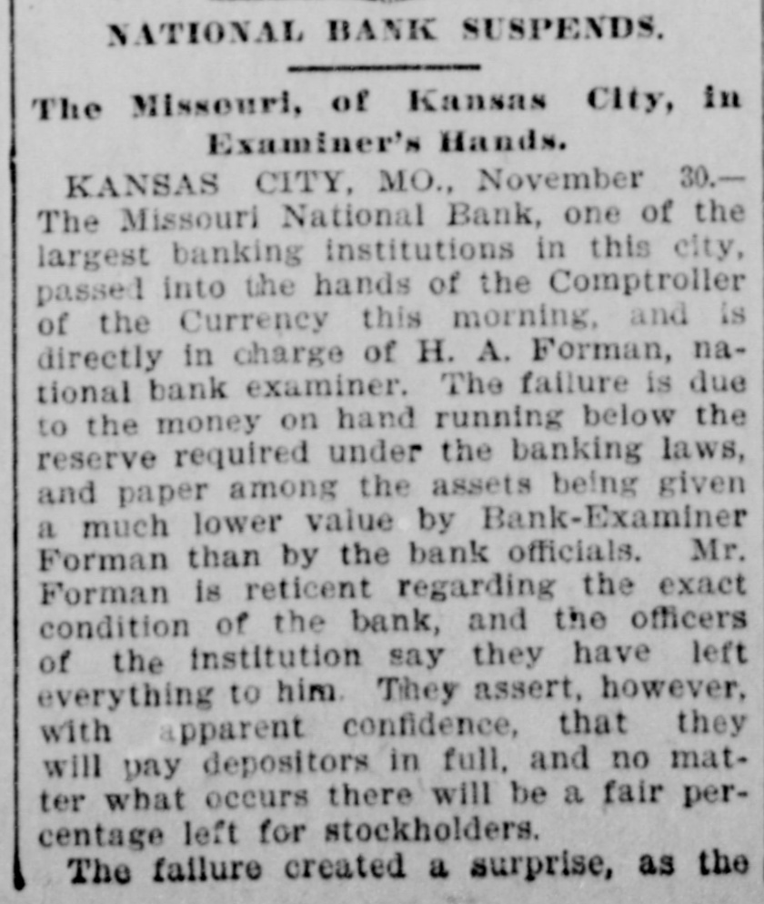 NATIONAL BANK SUSPENDS. The Misseuri, of Kansas City, in Examiner's Hands. KANSAS CITY, MO., November 30.The Missouri National Bank, one of the largest banking institutions in this city, passed into the hands of the Comptroller of the Currency this morning, and is directly in charge of H. A. Forman, national bank examiner. The failure is due to the money on hand running below the reserve required under the banking laws, and paper among the assets being given a much lower value by Bank-Examiner Forman than by the bank officials. Mr. Forman is reticent regarding the exact condition of the bank, and the officers of the institution say they have left everything to him. They assert, however, with apparent confidence, that they will pay depositors, in full, and no matter what occurs there will be a fair percentage left for stockholders. The failure created a surprise, as the