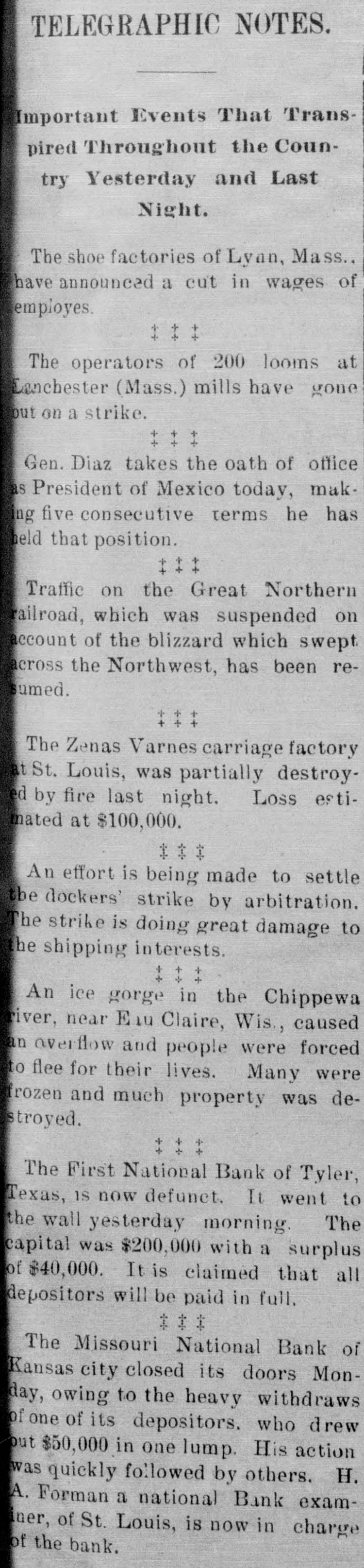 TELEGRAPHIC NOTES. Important Events That Transpired Throughout the Country Yesterday and Last Night. The shoe factories of Lyan, Mass.. have announced a cut in wages of employes. * * * The operators of 200 looms at Lanchester (Mass.) mills have gone but on a strike. * * * Gen. Diaz takes the oath of office as President of Mexico today, making five consecutive terms he has held that position. *** Traffic on the Great Northern railroad, which was suspended on account of the blizzard which swept across the Northwest, has been resumed. +++ The Zenas Varnes carriage factory at St. Louis, was partially destroyed by fire last night. Loss estimated at $100,000. *** An effort is being made to settle the dockers' strike by arbitration. The strike is doing great damage to he shipping interests. * * * An ice gorge in the Chippewa river, near Eau Claire, Wis., caused an overflow and people were forced to flee for their lives. Many were frozen and much property was destroyed. + # + The First National Bank of Tyler, Texas, IS now defunct. It went to the wall yesterday morning. The capital was $200,000 with a surplus of $40,000. It is claimed that all depositors will be paid in full. *** The Missouri National Bank of Kansas city closed its doors Monday, owing to the heavy withdraws of one of its depositors. who drew out $50,000 in one lump. His action was quickly followed by others. H. A. Forman a national Bank examiner, of St. Louis, is now in charge of the bank.
