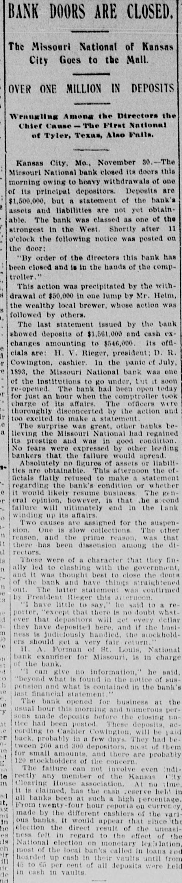 BANK DOORS ARE CLOSED. The Missouri National of Kansas City Goes to the Mall. OVER ONE MILLION IN DEPOSITS Wrangling Among the Directors the Chief Cause - The First National of Tyler, Texas, Also Fails. Kansas City, Mo., November 30.-The Missouri National bank closed its doors this morning owing to heavy withdrawals of one of its principal depositors. Deposits are $1,500,000, but a statement of the bank's assets and liabilities are not yet obtainable. The bank was classed as one of the strongest in the West. Shortly after 11 o'clock the following notice was posted on the door: "By order of the directors this bank has been closed and is in the hands of the comptroller." This action was precipitated by the withdrawal of $50,000 in one lump by Mr. Heim, the wealthy local brewer, whose action was followed by others. The last statement issued by the bank showed deposits of $1,561,000 and cash exchanges amounting to $546,000. Its officials are: H. V. Rieger, president: D. R. r Cowington, cashier. In the panic of July, 1893, the Missouri National bank was one of the Institutions to go under, Lut it soon re-opened. The bank had been open today r for just an hour when the comptroller took charge of its affairs. The officers were thoroughly disconcerted by the action and r too excited to make a statement. e The surprise was great, other banks bea lieving the Missouri National had regained its prestige and was in good condition. No fears were expressed by other leading bankers that the failure would spread. Absolutely no figures of assets or liabilities are obtainable. This afternoon the officials flatly refused to make a statement regarding the bank's condition or whether it would likely resume business. The general opinion, however, is that .he second failure will ultimately end in the Lank winding up its affairs. Two causes are assigned for the suspension. One is slow collections. The other n reason, and the prime reason, was that there has been dissension among the directors. 8 These were of a character that they fin= ally led to clashing with the government, and it was thought best to close the doors of the bank and have things straightened 11 out. The latter statement was confirmed e by President Rieger this atternoon. 3 "I have little to say." he said to a reporter, "except that there IN no doubt whatdi ever that depositors will get every dollar