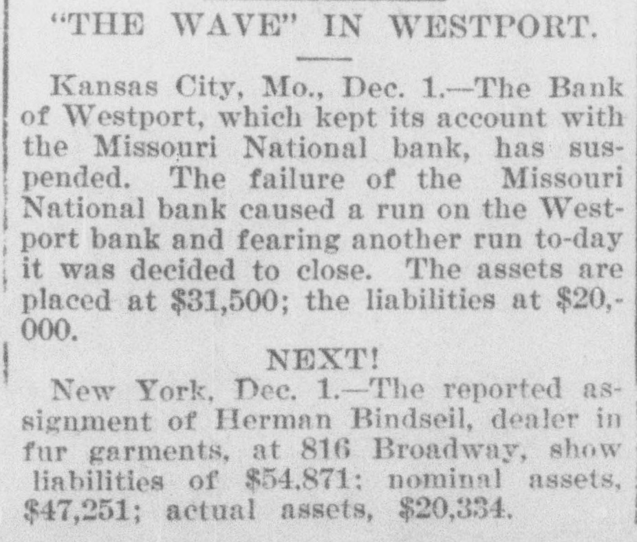 "THE WAVE" IN WESTPORT. Kansas City, Mo., Dec. 1.-The Bank of Westport, which kept its account with the Missouri National bank, has suspended. The failure of the Missouri National bank caused a run on the Westport bank and fearing another run to-day it was decided to close. The assets are placed at $31,500; the liabilities at $20,000. NEXT! New York, Dec. 1.-The reported assignment of Herman Bindseil, dealer in fur garments, at 816 Broadway, show liabilities of $54,871: nominal assets, $47,251; actual assets, $20,334.