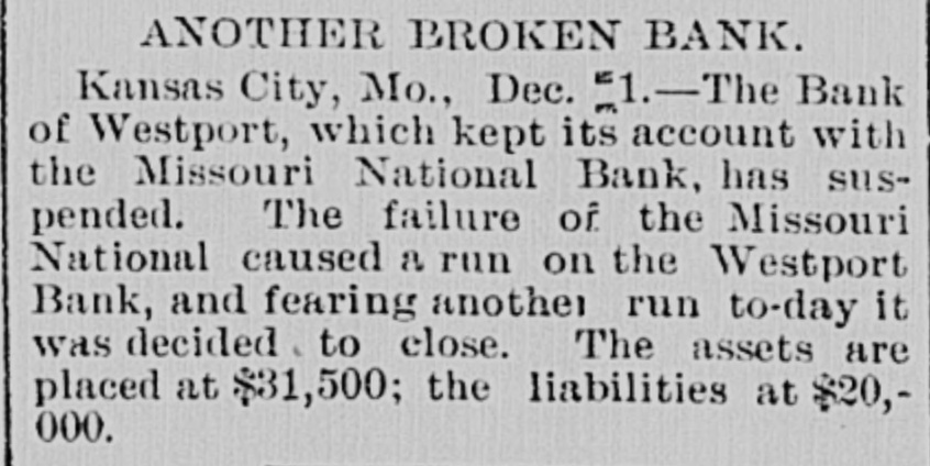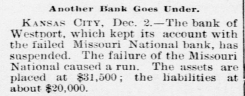 Another Bank Goes Under. KANSAS CITY, Dec. 2.-The bank of Westport, which kept its account with the failed Missouri National bank, has suspended. The failure of the Missouri National caused a run. The assets are placed at $31,500; the liabilities at about $20,000.