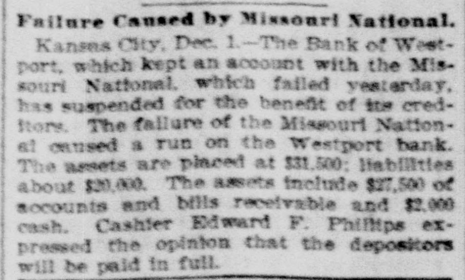 Failure Caused by Missouri National. Kanses City, Dec. 1.-The Bank of Westport, which kept an account with the Missouri National. which failed yesterday, has suspended for the benefit of the credftors. The failure of the Missourt Nationat caused a run on the Westport bank. The assets are placed at $31,500; liabilities about $20,000. The assets include $27,500 of accounts and bills receivable and $2,000 cash. Cashier Edward F. Phillips expressed the opinion that the depositors will be paid in full.