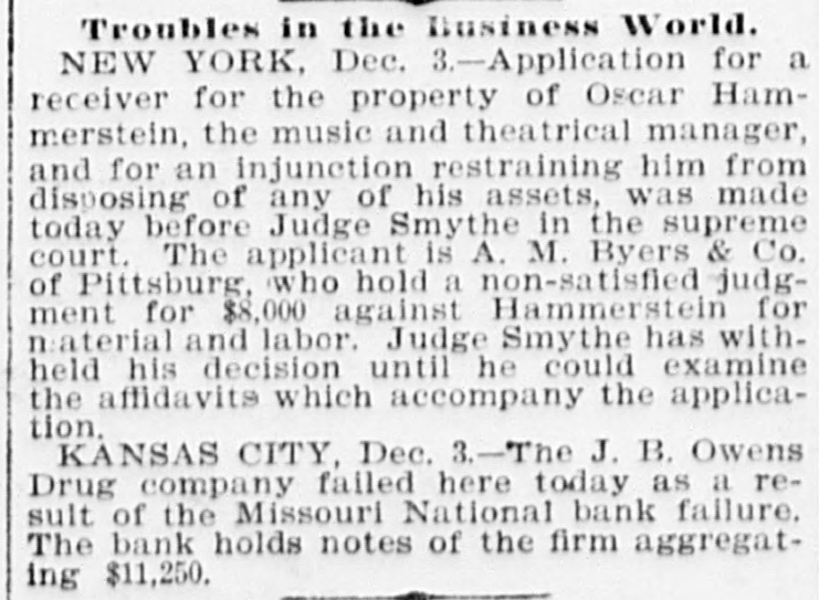 Troubles in the Business World. NEW YORK, Dec. 3.-Application for a receiver for the property of Oscar Hammerstein, the music and theatrical manager, and for an injunction restraining him from disposing of any of his assets, was made today before Judge Smythe in the supreme court. The applicant is A. M. Byers & Co. of Pittsburg, who hold a non-satisfied judgment for $8,000 against Hammerstein for material and labor. Judge Smythe has withheld his decision until he could examine the affidavits which accompany the application. KANSAS CITY, Dec. 3.-The J. B. Owens Drug company failed here today as a result of the Missouri National bank failure. The bank holds notes of the firm aggregating $11,250.