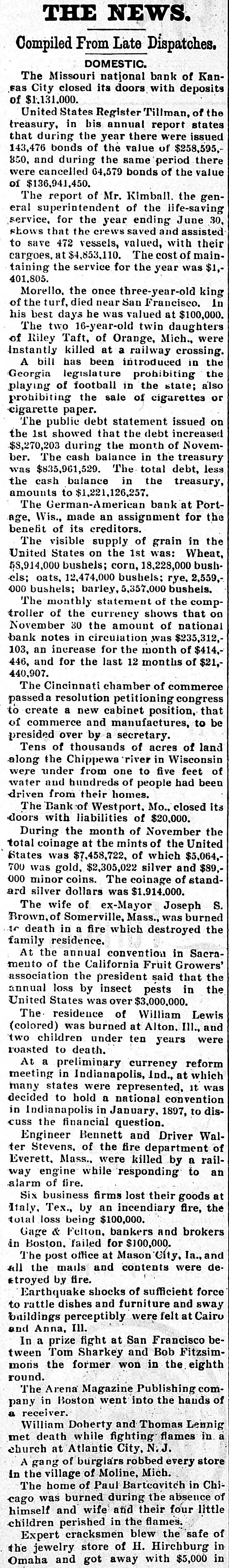 THE NEWS. Compiled From Late Dispatches. DOMESTIC. The Missouri national bank of Kansas City closed its doors with deposits of $1,131,000. United States Register Tillman, of the treasury, in bis annual report states that during the year there were issued 143,476 bonds of the value of $258,595,850, and during the same period there were cancelled 64,579 bonds of the value of $136,941,450. The report of Mr. Kimball. the general superintendent of the life-saving service, for the year ending June 30, shows that the crews saved and assisted to save 472 vessels, valued, with their cargoes, at $4,853,110. The cost of maintaining the service for the year was $1,401.805. Morello, the once three-year-old king of the turf, died near San Francisco. In his best days he was valued at $100,000. The two 16-year-old twin daughters of Riley Taft, of Orange, Mich., were Instantly killed at a railway crossing. A bill has been introduced in the Georgia legislature prohibiting the playing of football in the state; also prohibiting the sale of cigarettes or cigarette paper. The public debt statement issued on the 1st showed that the debt increased $8,270,203 during the month of November. The cash balance in the treasury was $835,961,529. The total debt, less the cash balance in the treasury, amounts to $1,221,126,257. The German-American bank at Portage, Wis., made an assignment for the benefit of its creditors. The visible supply of grain in the United States on the 1st was: Wheat, 58,914,000 bushels; corn, 18,228,000 bushels; oats, 12,474,000 bushels: rye, 2,559,000 bushels; barley, 5,357,000 bushels. The monthly statement of the comptroller of the currency shows that on November 30 the amount of national bank notes in circulation was $235,312,103, an increase for the month of $414,446, and for the last 12 months of $21,440,907. The Cincinnati chamber of commerce passeda resolution petitioning congress to create a new cabinet position, that of commerce and manufactures, to be presided over by a secretary. Tens of thousands of acres of land along the Chippewa river in Wisconsin were under from one to five feet of water and hundreds of people had been driven from their homes. The Bank of Westport. Mo., closed its doors with liabilities of $20,000. During the month of November the total coinage at the mints of the United States was $7,458,722, of which $5,064,700 was gold, $2,305,022 silver and $89,000 minor coins. The coinage of standard silver dollars was $1.914.000. The wife of ex-Mayor Joseph S. Brown.of Somerville, Mass., was burned 10 death in a fire which destroyed the family residence. At the annual convention in Sacramento of the California Fruit Growers' association the president said that the annual loss by insect pests in the United States was over $3,000,000. The residence of William Lewis (colored) was burned at Alton. III., and two children under ten years were roasted to death. At a preliminary currency reform meeting in Indianapolis, Ind., at which many states were represented, it was decided to hold a national convention in Indianapolis in January, 1897, to discuss the financial question. Engineer Bennett and Driver Walter Stevens, of the fire department of Everett, Mass., were killed by a railway engine while responding to an alarm of fire. Six business firms lost their goods at Italy, Tex., by an incendiary fire, the total loss being $100,000. Gage & Felton, bankers and brokers in Boston, failed for $100,000. The post office at Mason City, la., and all the mails and contents were destroyed by fire. Earthquake shocks of sufficient force to rattle dishes and furniture and sway buildings perceptibly were felt at Cairo and Anna, III. In a prize fight at San Francisco between Tom Sharkey and Bob Fitzsimmons the former won in the eighth round. The Arena Magazine Publishing company in Boston went into the hands of a receiver. William Doherty and Thomas Lennig met death while fighting flames in a ehurch at Atlantic City, N.J. A gang of burglars robbed every store in the village of Moline, Mich. The home of Paul Barteovitch in Chicago was burned during the absence of himself and wife and their four little children perished in the flames. Expert cracksmen blew the safe of