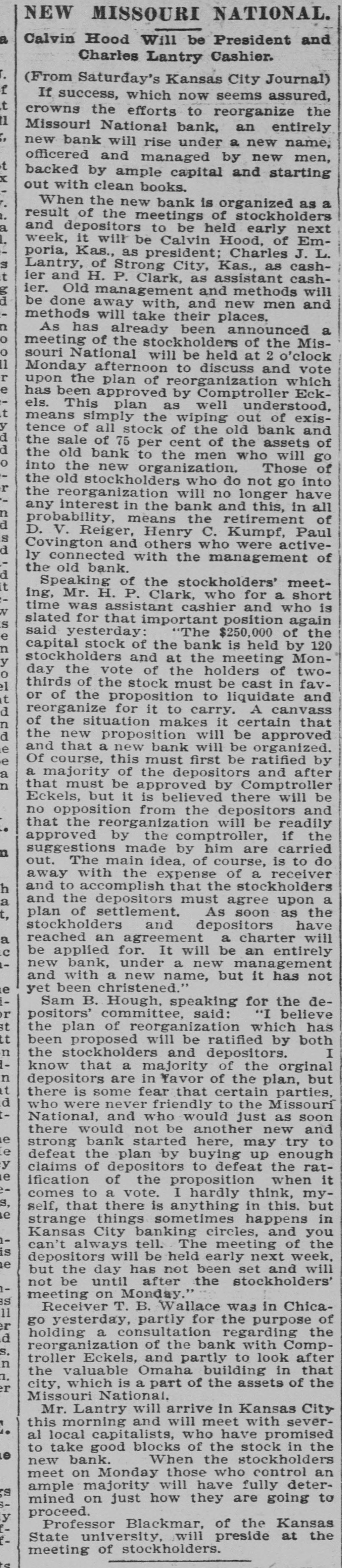 "TVNOILVN MEN 03 Calvin Hood Will be President and Charles Lantry Cashier. : (From Saturday's Kansas City Journal) J If success, which now seems assured, $1 crowns the efforts to reorganize the Il Missouri National bank, an entirely : new bank will rise under a new name, officered and managed by new men, 7 backed by ample capital and starting X out with clean books. *1 When the new bank is organized as a in result of the meetings of stockholders B and depositors to be held early next L. week, it will be Calvin Hood, of Emporia, Kas., as president; Charles J. L. 5 Lantry, of Strong City, Kas., as cash1 ier and H. P. Clark, as assistant cash00 ier. Old management and methods will p be done away with, and new men and methods will take their places. u As has already been announced a o meeting of the stockholders of the Miso souri National will be held at 2 o'clock Il Monday afternoon to discuss and vote J upon the plan of reorganization which a has been approved by Comptroller Eckels. This plan as well understood, 1 means simply the wiping out of exisA tence of all stock of the old bank and p the sale of 75 per cent of the assets of p the old bank to the men who will go 0 into the new organization. Those of the old stockholders who do not go into J the reorganization will no longer have any interest in the bank and this, in all u probability, means the retirement of p D. V. Reiger, Henry C. Kumpf, Paul S Covington and others who were activep ly connected with the management of the old bank. p Speaking of the stockholders' meet7 ing, Mr. H. P. Clark, who for a short time was assistant cashier and who is A slated for that important position again S said yesterday: "The $250,000 of the a capital stock of the bank is held by 120 u stockholders and at the meeting MonA day the vote of the holders of two0 thirds of the stock must be cast in favI or of the proposition to liquidate and 71 reorganize for it to carry. A canvass p of the situation makes it certain that u p the new proposition will be approved a and that a new bank will be organized. a Of course, this must first be ratified by B a majority of the depositors and after u that must be approved by Comptroller Eckels, but it is believed there will be no opposition from the depositors and that the reorganization will be readily . approved by the comptroller, if the suggestions made by him are carried u out. The main idea, of course, is to do away with the expense of a receiver and to accomplish that the stockholders 4 a and the depositors must agree upon a plan of settlement. As soon as the is stockholders and depositors have reached an agreement a charter will e of be applied for. It will be an entirely new bank, under a new management and with a new name, but it has not yet been christened." e Sam B. Hough, speaking for the deJ positors' committee, said: "I believe 18 the plan of reorganization which has 71 been proposed will be ratified by both u I the stockholders and depositors. know that a majority of the orginal u depositors are in Yavor of the plan, but 71 there is some fear that certain parties, p who were never friendly to the Missouri -1 National, and who would just as soon there would not be another new and e strong bank started here, may try to e) defeat the plan by buying up enough A claims of depositors to defeat the rate ification of the proposition when it comes to a vote. I hardly think, myin self, that there is anything in this. but at strange things sometimes happens in Kansas City banking circles, and you can't always tell. The meeting of the S! depositors will be held early next week, at but the day has not been set and will not be until after the stockholders' -1 meeting on Monday." SE Receiver T. B. Wallace was in ChicaII go yesterday, partly for the purpose of J holding a consultation regarding the p reorganization of the bank with Compis troller Eckels, and partly to look after u the valuable Omaha building in that n. city, which is a part of the assets of the Ja Missouri National. Mr. Lantry will arrive in Kansas City this morning and will meet with sever: or al local capitalists, who have promised to take good blocks of the stock in the et new bank. When the stockholders meet on Monday those who control an ample majority will have fully deterS mined on just how they are going to -$ proceed. A Professor Blackmar, of the Kansas