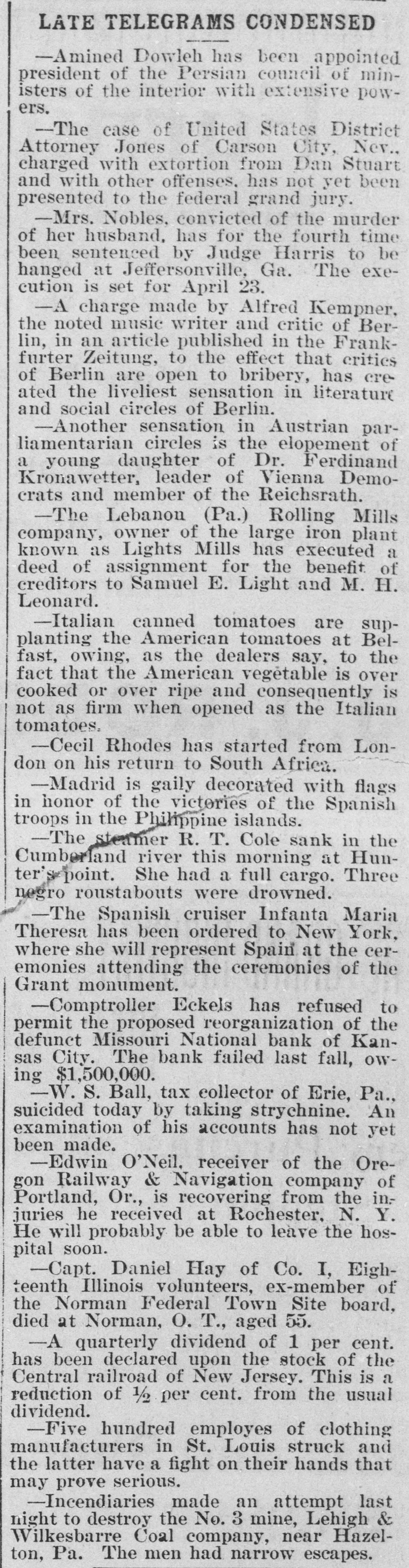 LATE TELEGRAMS CONDENSED -Amined Dowleh has been appointed president of the Persian council of ministers of the interior with extensive powers. -The case of United States District Attorney Jones of Carson City, Nev., charged with extortion from Dan Stuart and with other offenses. has not yet been presented to the federal grand jury. -Mrs. Nobles, convicted of the murder of her husband, has for the fourth time been sentenced by Judge Harris to be hanged at Jeffersonville, Ga. The execution is set for April 23. -A charge made by Alfred Kempner, the noted music writer and critic of Berlin, in an article published in the Frankfurter Zeitung, to the effect that critics of Berlin are open to bribery, has created the liveliest sensation in literature and social circles of Berlin. -Another sensation in Austrian parliamentarian circles is the elopement of a young daughter of Dr. Ferdinand Kronawetter, leader of Vienna Democrats and member of the Reichsrath. -The Lebanon (Pa.) Rolling Mills company, owner of the large iron plant known as Lights Mills has executed a deed of assignment for the benefit of creditors to Samuel E. Light and M. H. Leonard. -Italian canned tomatoes are supplanting the American tomatoes at Belfast, owing, as the dealers say, to the fact that the American vegetable is over cooked or over ripe and consequently is not as firm when opened as the Italian tomatoes. -Cecil Rhodes has started from London on his return to South Africa. -Madrid is gaily decorated with flags in honor of the victories of the Spanish troops in the Philippine islands. -The steamer R. T. Cole sank in the Cumberland river this morning at Hunter point. She had a full cargo. Three negro roustabouts were drowned. -The Spanish cruiser Infanta Maria Theresa has been ordered to New York, where she will represent Spain at the ceremonies attending the ceremonies of the Grant monument. -Comptroller Eckels has refused to permit the proposed reorganization of the defunct Missouri National bank of Kansas City. The bank failed last fall, owing $1,500,000. -W. S. Ball, tax collector of Erie, Pa., suicided today by taking strychnine. An examination of his accounts has not yet been made. -Edwin O'Neil. receiver of the Oregon Railway & Navigation company of Portland, Or., is recovering from the injuries he received at Rochester, N. Y. He will probably be able to leave the hospital soon. -Capt. Daniel Hay of Co. I, Eighteenth Illinois volunteers, ex-member of the Norman Federal Town Site board, died at Norman, O. T., aged 55. -A quarterly dividend of 1 per cent. has been declared upon the stock of the Central railroad of New Jersey. This is a reduction of ½ per cent. from the usual dividend. -Five hundred employes of clothing manufacturers in St. Louis struck and the latter have a fight on their hands that may prove serious. -Incendiaries made an attempt last night to destroy the No. 3 mine, Lehigh & Wilkesbarre Coal company, near Hazelton, Pa. The men had narrow escapes.