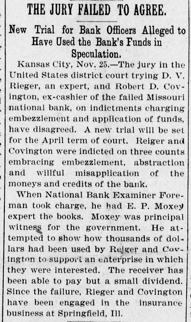 THE JURY FAILED TO AGREE. New Trial for Bank Officers Alleged to Have Used the Bank's Funds in Speculation. Kansas City, Nov. 25.-The jury in the United States district court trying D. V. Rieger, an expert, and Robert D. Covington, ex-cashier of the failed Missouri national bank, on indictments charging embezzlement and application of funds, have disagreed. A new trial will be set for the April term of court. Reiger and Covington were indicted on three counts embracing embezzlement, abstraction and willful misapplication of the moneys and credits of the bank. When National Bank Examiner Foreman took charge, he had E. P. Moxey expert the books. Moxey was principal witness for the government. He attempted to show how thousands of dollars had been used by Rejger and Covington to support an enterprise in which they were interested. The receiver has been able to pay but a small dividend. Since the failure, Rieger and Covington have been engaged in the insurance business at Springfield, Ill.