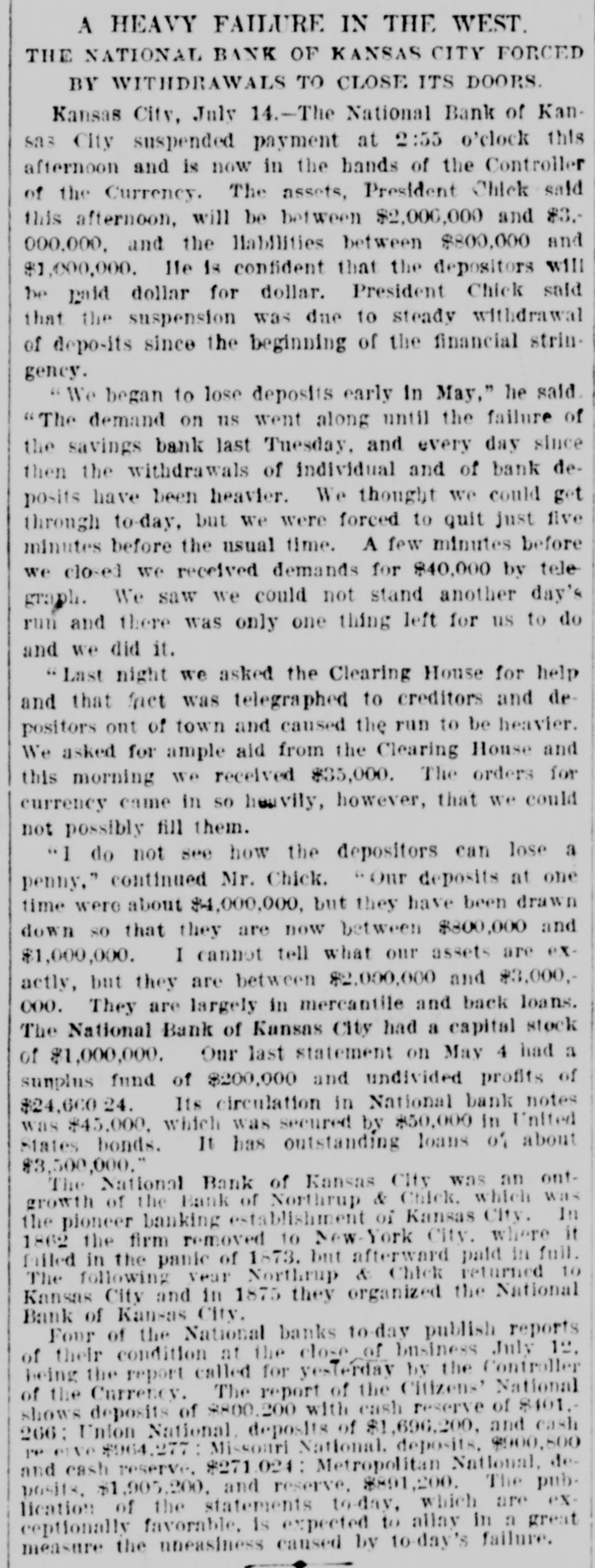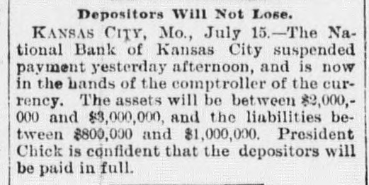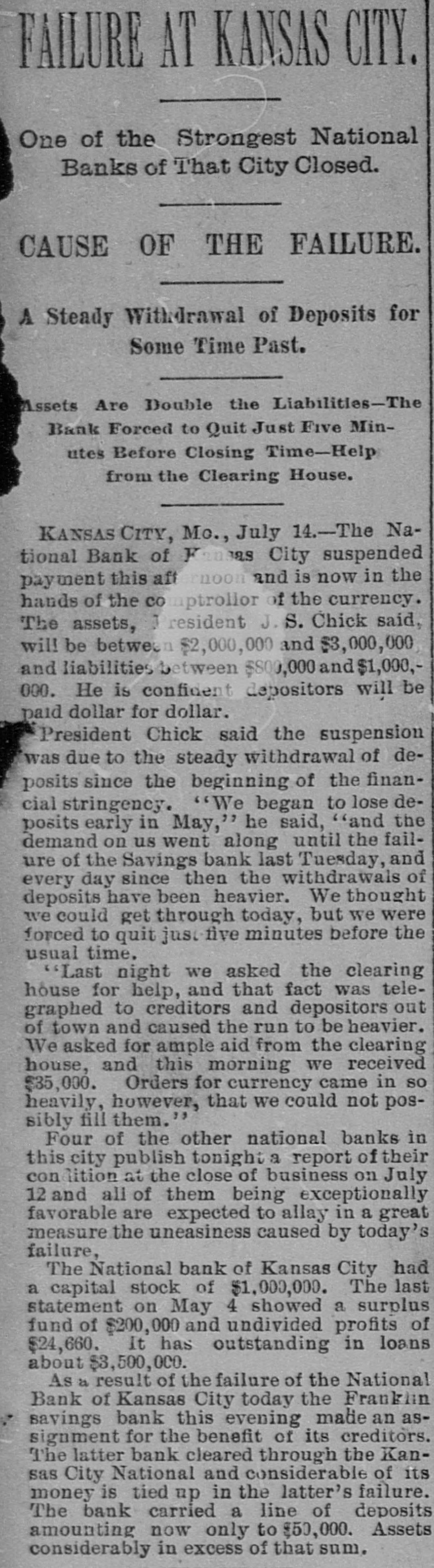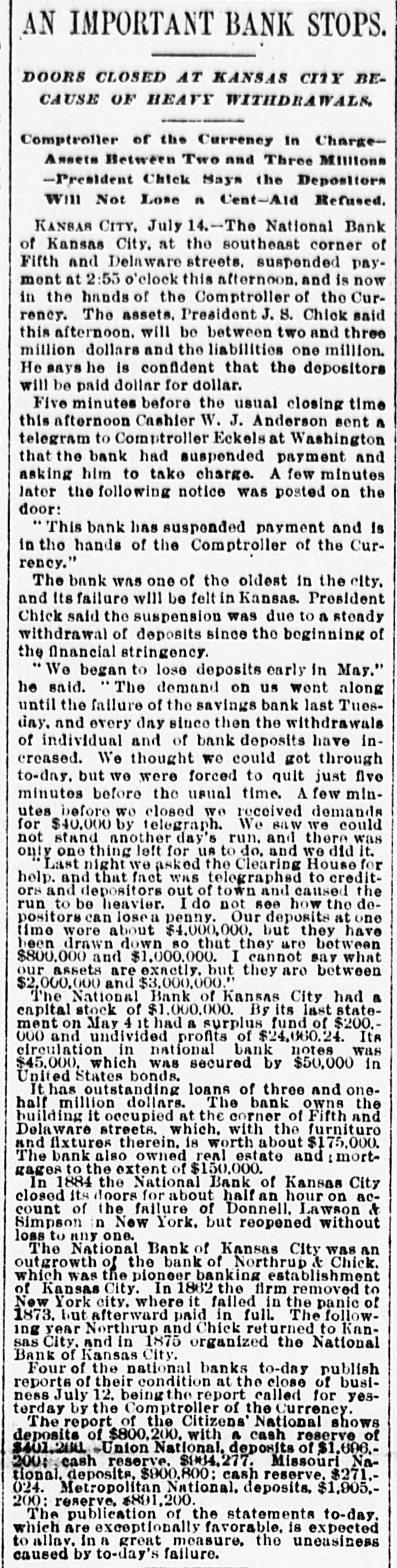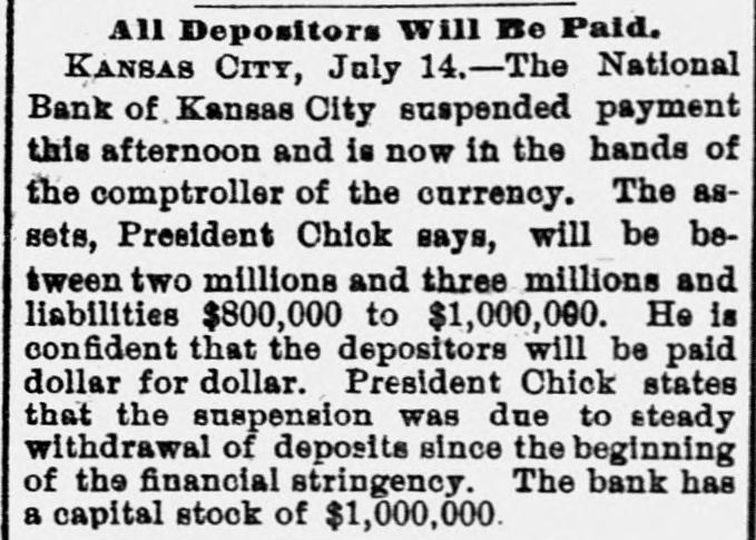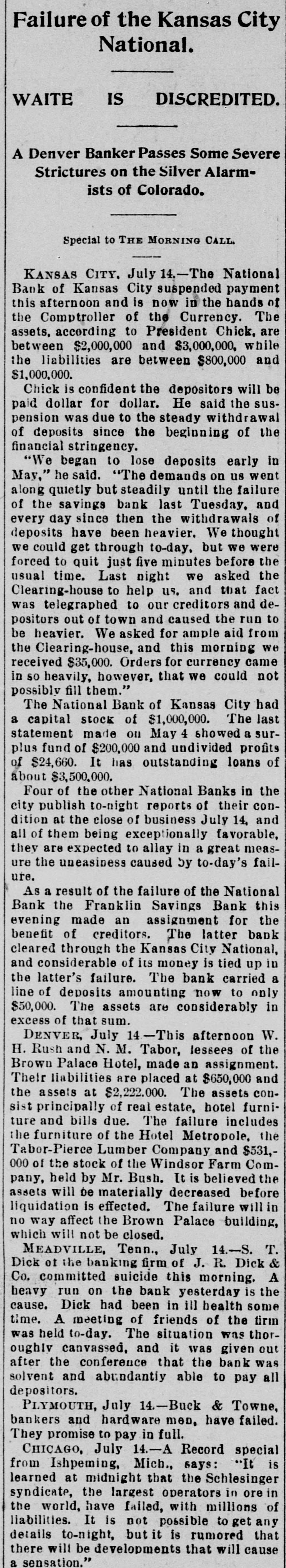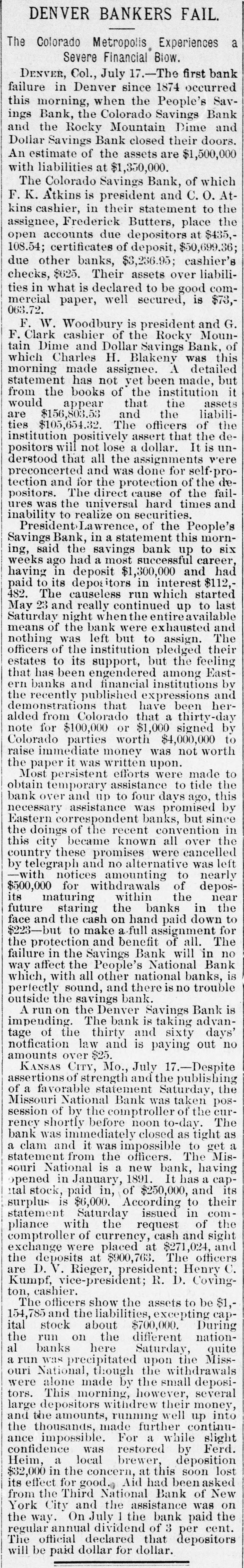 DENVER BANKERS FAIL. a The Colorado Metropolis, Experiences Severe Financial Blow. Col., July 17.-The first bank DENVER, in Denver since 1874 occurred Savfailure morning, when the Savings People's Bank this Bank, the Colorado Dime and ings the Rocky Mountain their doors. and Savings Bank closed $1,500,000 An Dollar estimate of the assets are with liabilities Colorado at Savings $1,330,000. Bank, of which o. AtF. The K. Atkins is president statement and C. to the kins cashier, Frederick in their Butters, place at the assignee, due depositors accounts $50,699.36; $435, open certificates of deposit, cashier's 108.54; other banks, $3,236.95; over liabilidue $625. Their assets good comchecks, what is declared to be is $73, ties mercial in paper, well secured, G. 063.72. F. W. Woodbury is the president Rocky and Mountain F. Clark Dime cashier and Dollar H. of Blakeny Savings was Bank, this of made been made, but morning which Charles assignee. A detailed it has not yet institution statement books of the the assets from would the appear and that the liabilithe are $156,803.53 The officers the of deinstitution ties $105,654.32 positively assert dollar. that It is unwill not lose a were derstood positors that all the was assignments done for self-pro- detection preconcerted and for and the protection cause of of the the failpositors. the The universal direct securities. hard times and ures was realize on the inability President Lawrence. to of this People's mornBank, in a up to six deposit Savings ing, weeks said ago the had savings a most $1,300,000 successful bank and career had $112, having paid Saturday 482. May means 23 to The of and its in was night the causeless depositors really bank left when continued but were the run in to entire exhausted which 'interest pledged assign. up available started to their The and last nothing of the institution but the feeling has been officers to its support, among Eastern published been estates that recently banks and engendered financial expressions institutions her- and by alded the demonstrations from Colorado that or $1,000 that have a signed thirty-day by to note for worth Colorado immediate money was raise $100,000 parties written upon. $4,000,000 not made worth to the paper it was efforts were Most persistent assistance to tide this the obtain temporary to four days ago, bank over assistance was but convention and up banks, promised since the by in Eastern of the recent all over this the doings city became known were cancelled left country these promises no alternative was nearly by telegraph and amounting of to deposwith notice for the near maturing banks $500,000 future its staring the within hand paid down in the for to the $223-but face and the to cash make and on benefit a.full assignment of all. in The no National the protection Savings Bank will Bank failure affect in the People's other national banks, trouble is way which, with sound, all and there is no is Bank perfectly outside the savings bank. Savings Arunon the The Denver bank is taking advan; days impending. and sixty tage of the and is paying over CITY, Mo., July the publishing of strength Saturday, assertions amounts notfication KANSAS law thirty $25. statement and 17.-Despite taken out pos- the no of a favorable Bank was the of by the comptroller noon to-day. rency shortly closed as to get bank was was impossible session Missouri and National immediately it before officers. of The tight Mis- cur- The as a a clam from the new bank, having in January, of $250,000, and ital stock, According in to statement Saturday the request and of surplus souri statement opened National is paid $6,000. in, is a 1891. issued It has a com- their sight cap- the its pliance with of currency, cash $271,024, and comptroller were placed at The officers exchange at $900,763. Henry C. Kumpf, are the D. deposits V. ice-president; Rieger, president; R. D. Covington, cashier. officers show the assets excepting to be cap- $1, 154,78 The and the about liabilities, $700,000. nation- During ital stock the different quite the run on here Saturday, the Missbanks was precipitated the withdrawals a run National, though the small alone morning, al ouri were made by however, money, several deposithe made further tors. large depositors This amounts, withdrew running their well continu- up into impossible. by ance and the thousands, was brewer, restored For a while deposition slight Ferd. lost confidence a local at this soon Heim, in the concern, Aid had been asked New $32,000 effect for good.e National Bank was of the Third assistance its from York and the bank paid cent. the on City On July 1 the 3 per official the annual that depositors regular way. declared dividend dollar. of The will be paid dollar for