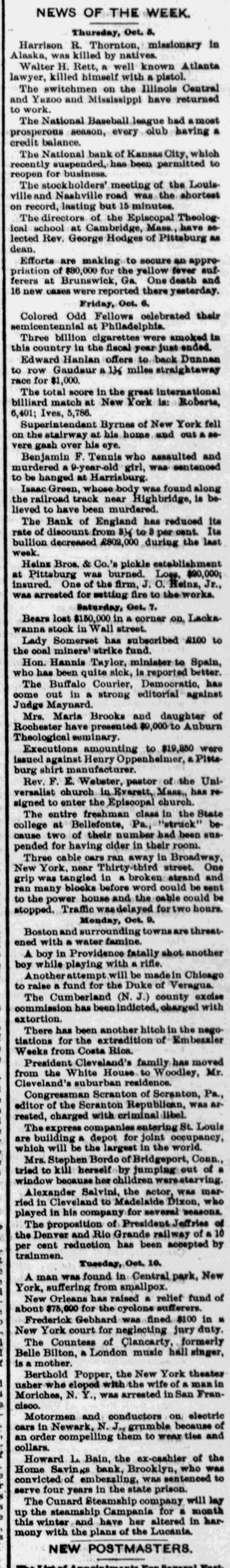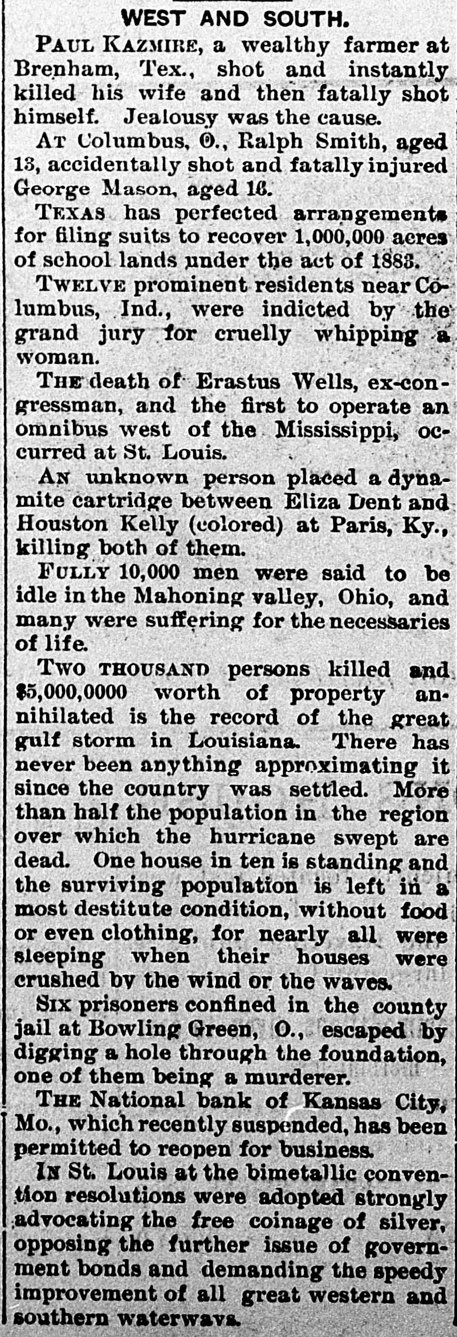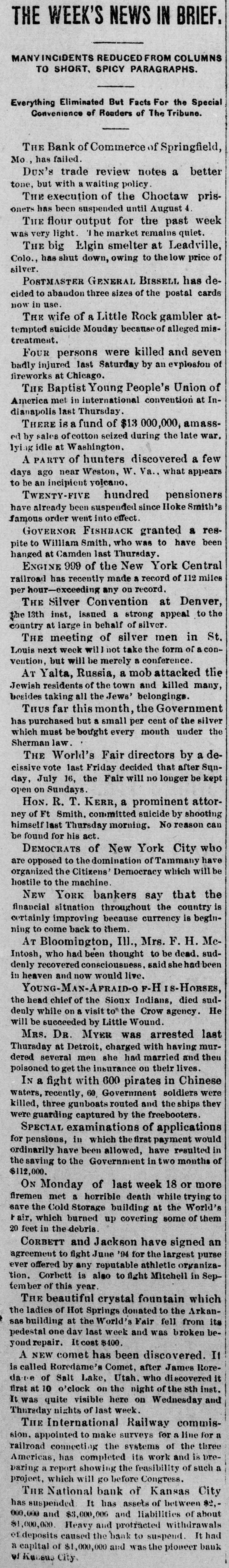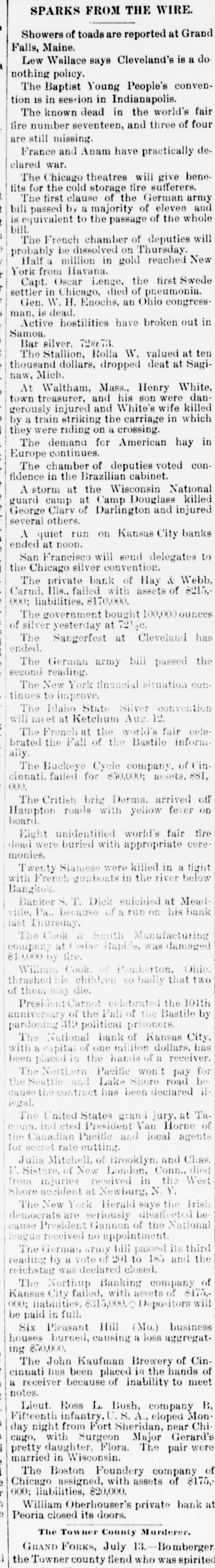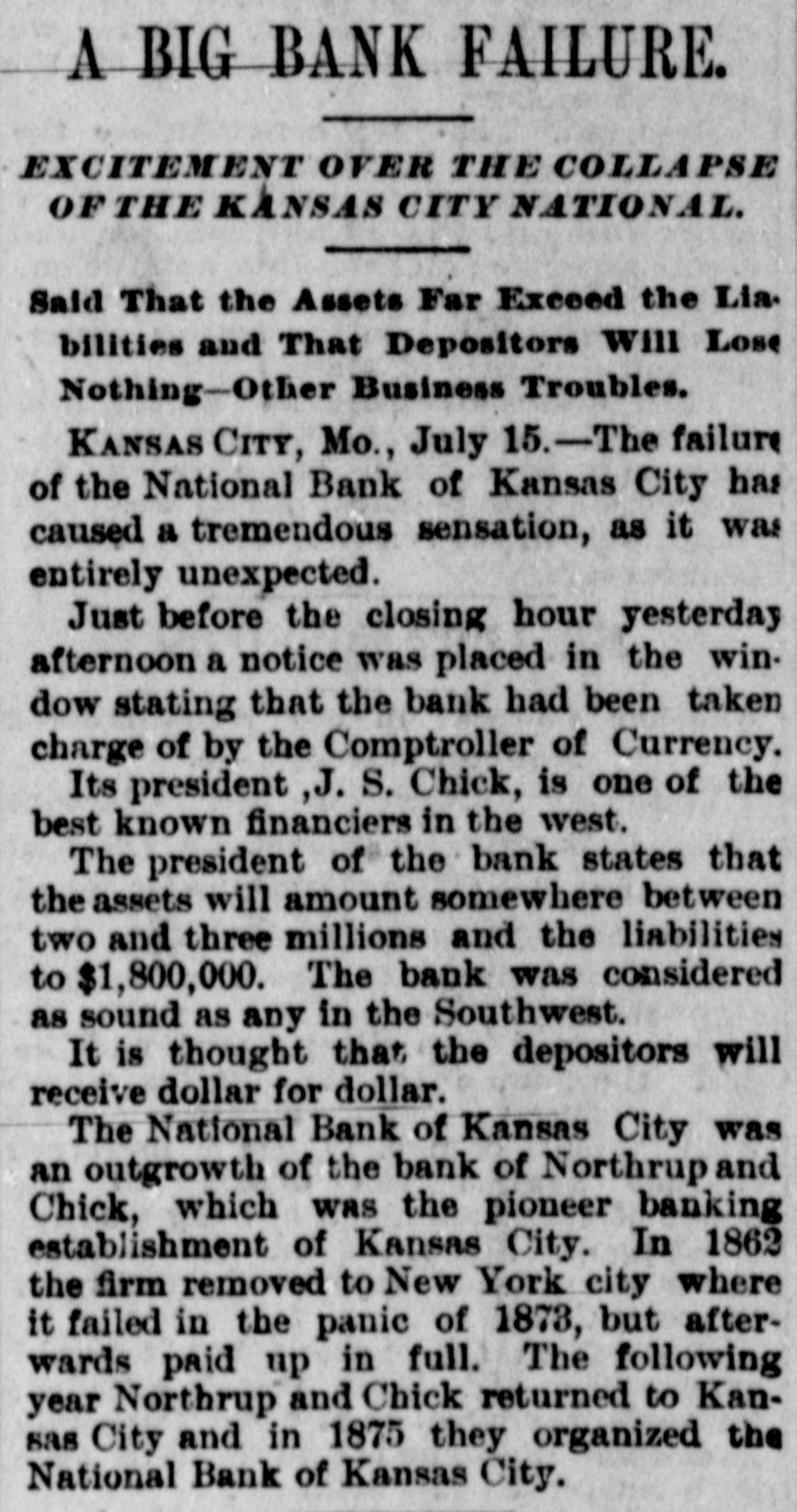 DENVER BANKERS FAIL. a The Colorado Metropolis, Experiences Severe Financial Blow. Col., July 17.-The first bank DENVER, in Denver since 1874 occurred Savfailure morning, when the Savings People's Bank this Bank, the Colorado Dime and ings the Rocky Mountain their doors. and Savings Bank closed $1,500,000 An Dollar estimate of the assets are with liabilities Colorado at Savings $1,330,000. Bank, of which o. AtF. The K. Atkins is president statement and C. to the kins cashier, Frederick in their Butters, place at the assignee, due depositors accounts $50,699.36; $435, open certificates of deposit, cashier's 108.54; other banks, $3,236.95; over liabilidue $625. Their assets good comchecks, what is declared to be is $73, ties mercial in paper, well secured, G. 063.72. F. W. Woodbury is the president Rocky and Mountain F. Clark Dime cashier and Dollar H. of Blakeny Savings was Bank, this of made been made, but morning which Charles assignee. A detailed it has not yet institution statement books of the the assets from would the appear and that the liabilithe are $156,803.53 The officers the of deinstitution ties $105,654.32 positively assert dollar. that It is unwill not lose a were derstood positors that all the was assignments done for self-pro- detection preconcerted and for and the protection cause of of the the failpositors. the The universal direct securities. hard times and ures was realize on the inability President Lawrence. to of this People's mornBank, in a up to six deposit Savings ing, weeks said ago the had savings a most $1,300,000 successful bank and career had $112, having paid Saturday 482. May means 23 to The of and its in was night the causeless depositors really bank left when continued but were the run in to entire exhausted which 'interest pledged assign. up available started to their The and last nothing of the institution but the feeling has been officers to its support, among Eastern published been estates that recently banks and engendered financial expressions institutions her- and by alded the demonstrations from Colorado that or $1,000 that have a signed thirty-day by to note for worth Colorado immediate money was raise $100,000 parties written upon. $4,000,000 not made worth to the paper it was efforts were Most persistent assistance to tide this the obtain temporary to four days ago, bank over assistance was but convention and up banks, promised since the by in Eastern of the recent all over this the doings city became known were cancelled left country these promises no alternative was nearly by telegraph and amounting of to deposwith notice for the near maturing banks $500,000 future its staring the within hand paid down in the for to the $223-but face and the to cash make and on benefit a.full assignment of all. in The no National the protection Savings Bank will Bank failure affect in the People's other national banks, trouble is way which, with sound, all and there is no is Bank perfectly outside the savings bank. Savings Arunon the The Denver bank is taking advan; days impending. and sixty tage of the and is paying over CITY, Mo., July the publishing of strength Saturday, assertions amounts notfication KANSAS law thirty $25. statement and 17.-Despite taken out pos- the no of a favorable Bank was the of by the comptroller noon to-day. rency shortly closed as to get bank was was impossible session Missouri and National immediately it before officers. of The tight Mis- cur- The as a a clam from the new bank, having in January, of $250,000, and ital stock, According in to statement Saturday the request and of surplus souri statement opened National is paid $6,000. in, is a 1891. issued It has a com- their sight cap- the its pliance with of currency, cash $271,024, and comptroller were placed at The officers exchange at $900,763. Henry C. Kumpf, are the D. deposits V. ice-president; Rieger, president; R. D. Covington, cashier. officers show the assets excepting to be cap- $1, 154,78 The and the about liabilities, $700,000. nation- During ital stock the different quite the run on here Saturday, the Missbanks was precipitated the withdrawals a run National, though the small alone morning, al ouri were made by however, money, several deposithe made further tors. large depositors This amounts, withdrew running their well continu- up into impossible. by ance and the thousands, was brewer, restored For a while deposition slight Ferd. lost confidence a local at this soon Heim, in the concern, Aid had been asked New $32,000 effect for good.e National Bank was of the Third assistance its from York and the bank paid cent. the on City On July 1 the 3 per official the annual that depositors regular way. declared dividend dollar. of The will be paid dollar for