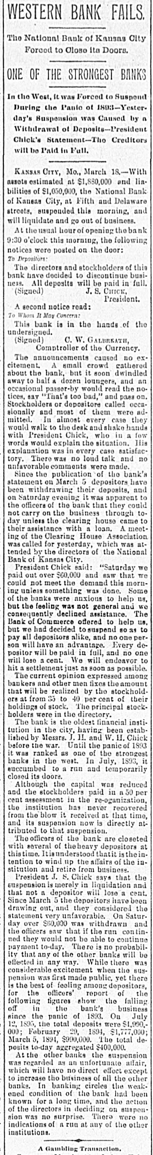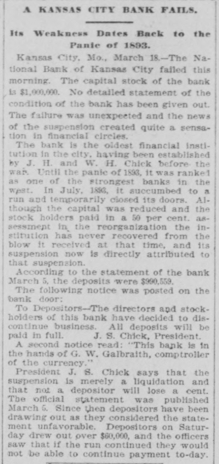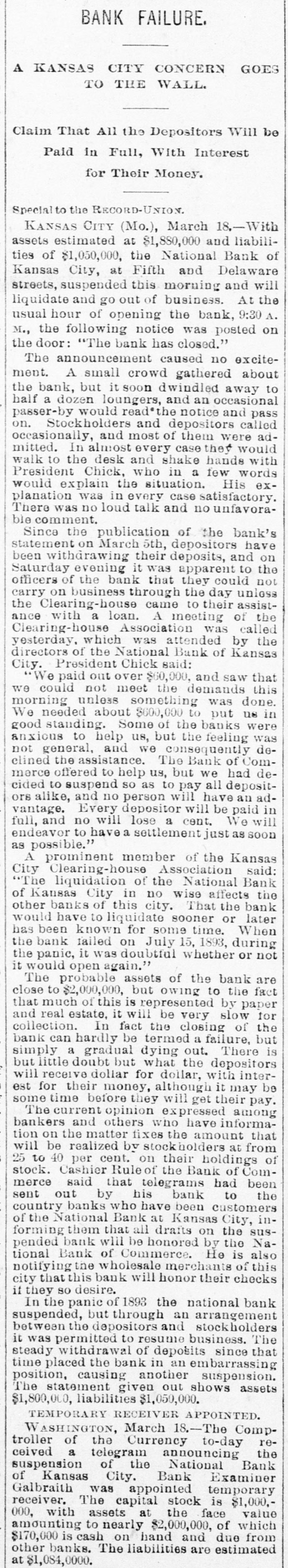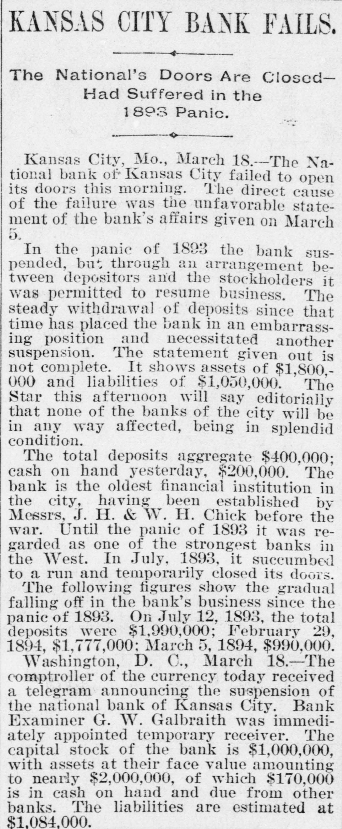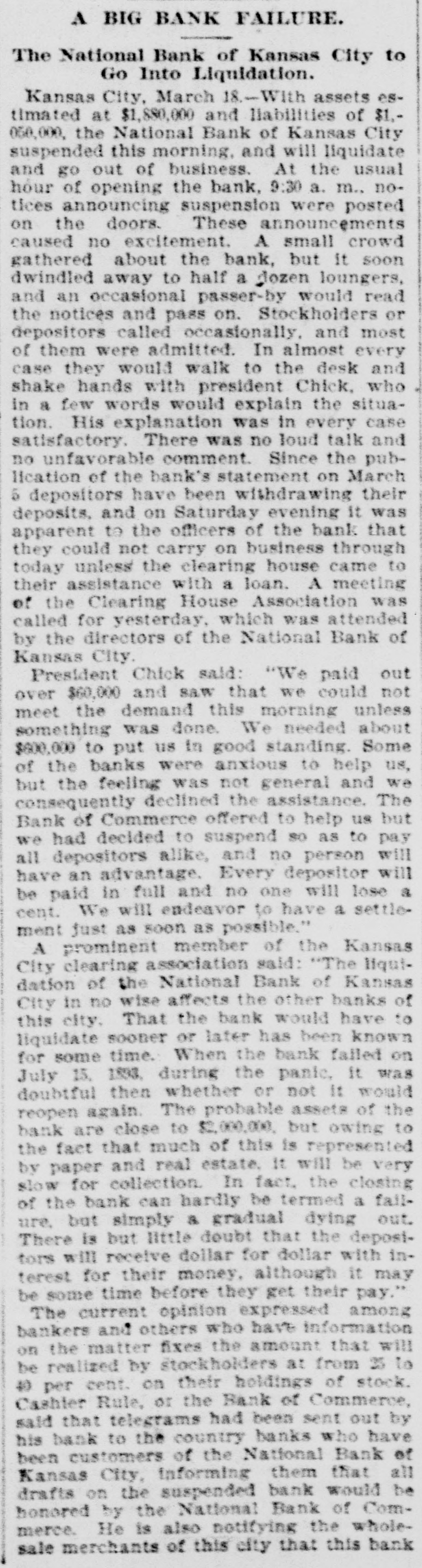 BIG BANK FAILS. National Bank of Kansas City Closes Its Doors. Steady Withdrawal of Deposits Since 1893 the Cause. SUSPENDED BEFORE. The Same Bank Closed During the Panic of '93. None of the Other Banks Will be Affected. KANSAS CITY, March 18.-The National bank of Kansas City failed to open its doors this morning. The direct cause of the failure was the unfavorable statement of bank affairs given out March 5. In the panic of 1893 the bank suspended, but through arrangements between depositors and stockholders it was permitted to resume business. The steady withdrawal of deposits since that time has placed the bank in an embarrassing position and necessitated another suspension. The statement given out is not complete. It shows assets of $1,800,000; liabilities $1,084,000. The Star this afternoon will say editorially that none of the other banks of the city will be in anyway affected, being in splendid condition. Though the bank was known to have been in a shaky condition, the failure was unexpected and the news of the suspension created quite a sensation in financial circles here. The following notices posted on the bank doors were the first intimation the public had that the bank's business had dropped off so much as to force it to close its doors: "10 depositors: The directors and stockholders of this bank have decided to discontinue business. All deposits will be paid in full. "[Signed,) J.S. CHICK, President." A second notice read: 'To W om it May Concern: "Time bank is in the hands of the unG. W. GALBREATH, dersigned. "Comptroller of the Currency." The following figuressh the gradual falling off in the bank's business since the panic of 1893: On July 12, 1893, the total deposits were $1,990,000; February 28, 1894, $1,777,000; March 5, 1895, $990,000. The total deposits aggregate $400,000; cash on hand yesterday $200,000. The bank is the oldest financialinetitution in the city, having been established by J: H. and W. H. Chick before the war. Until the panic of 1893 it was ranked as one of the strongest banks in d the west. In July, 1893, it succumbed to a run and temporarily closed its doors. n Although the capital was reduced and the stockholders paid in a 50 per cent h assessment in the reorganization, the institution has never recovered from the blow it received at that time and its suspension now is directly attributed to that suspension. The officers of the bank are closeted with several of the heavy depositors at this time. It is understood that it is the f intention to wind up the affairs of the ina stitution and retire from business. e President J. S. Chick says that the suspension is merely a liquidation and that not a depositor will lose a cent. Since March 5 the depositors have n been drawing out as they considered S the statement very unfavorable. On Saturday over $60,000 was withdrawn, and the officers saw that if the run continued, they would not be able to cone tinue payment today. f There is 110 probability that any of the other banks will be aflected in any way. t While there was considerable excitement when the suspension was first made public, yet there is the best of feeling among depositors for the officers of the failed institution.