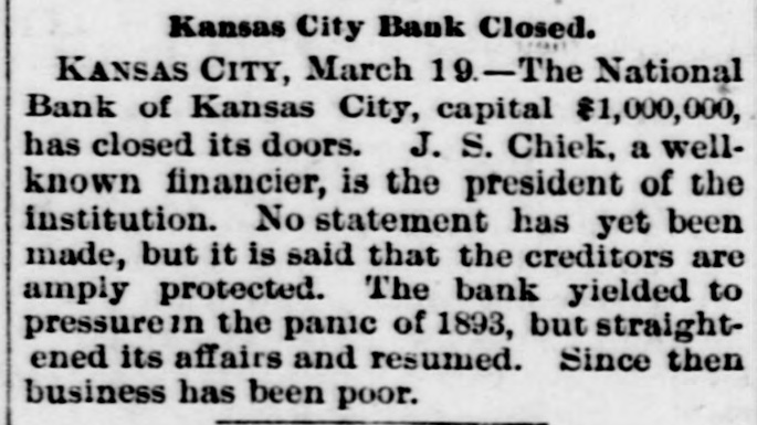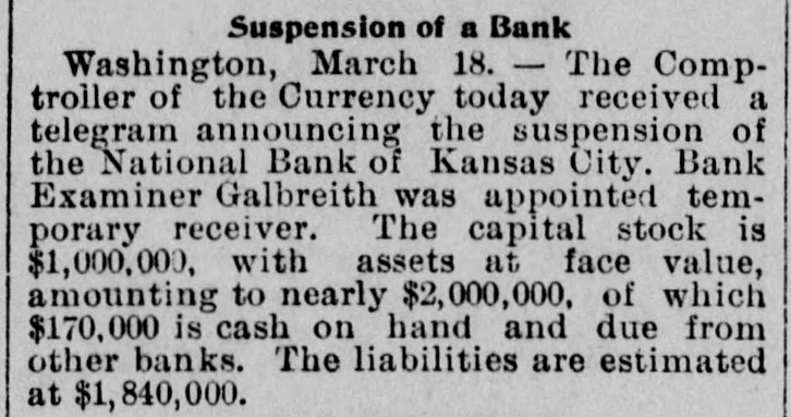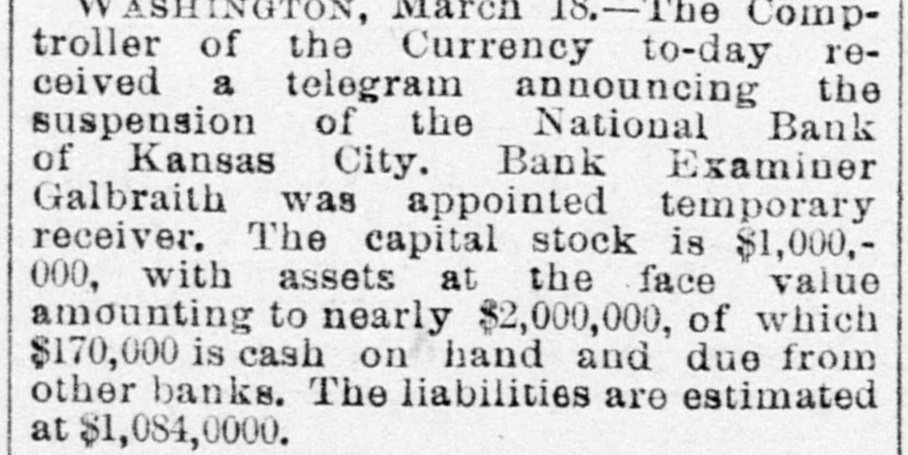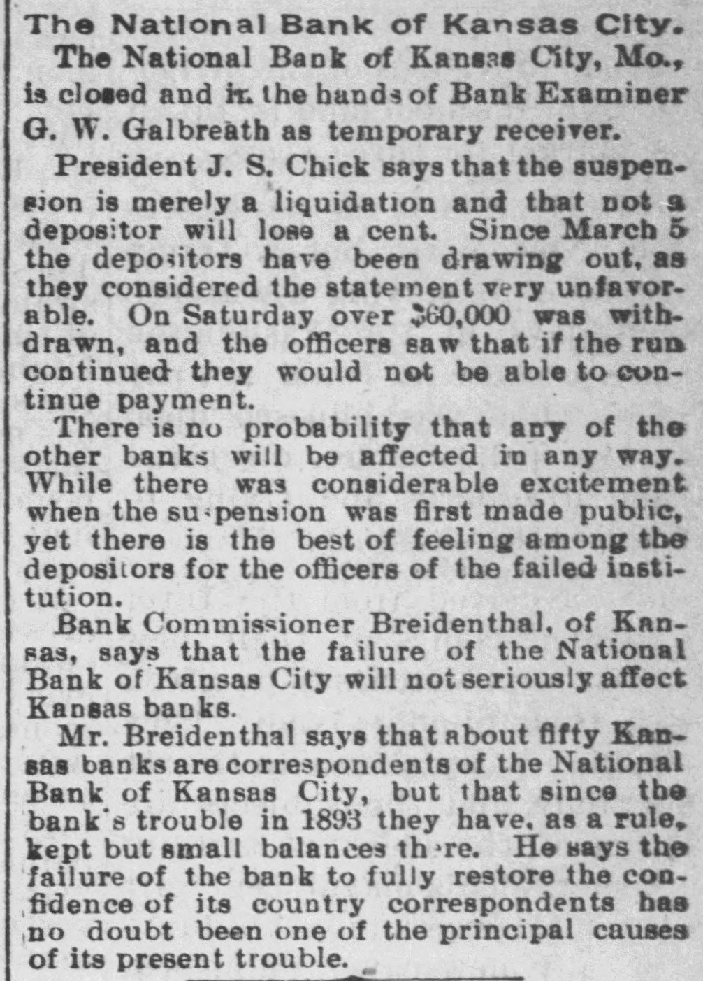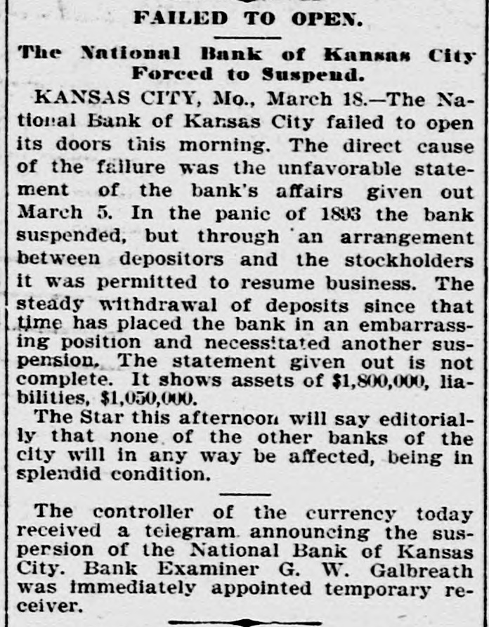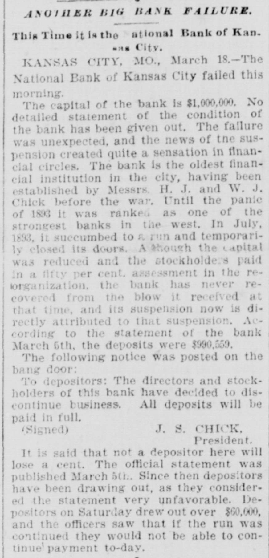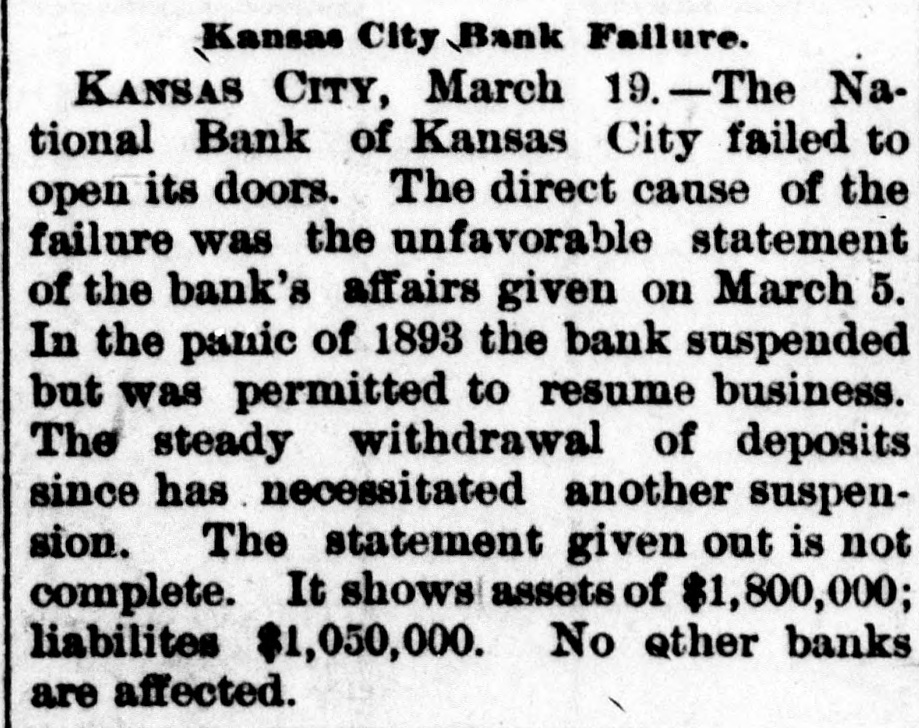 BIG BANK FAILS. National Bank of Kansas City Closes Its Doors. Steady Withdrawal of Deposits Since 1893 the Cause. SUSPENDED BEFORE. The Same Bank Closed During the Panic of '93. None of the Other Banks Will be Affected. KANSAS CITY, March 18.-The National bank of Kansas City failed to open its doors this morning. The direct cause of the failure was the unfavorable statement of bank affairs given out March 5. In the panic of 1893 the bank suspended, but through arrangements between depositors and stockholders it was permitted to resume business. The steady withdrawal of deposits since that time has placed the bank in an embarrassing position and necessitated another suspension. The statement given out is not complete. It shows assets of $1,800,000; liabilities $1,084,000. The Star this afternoon will say editorially that none of the other banks of the city will be in anyway affected, being in splendid condition. Though the bank was known to have been in a shaky condition, the failure was unexpected and the news of the suspension created quite a sensation in financial circles here. The following notices posted on the bank doors were the first intimation the public had that the bank's business had dropped off so much as to force it to close its doors: "10 depositors: The directors and stockholders of this bank have decided to discontinue business. All deposits will be paid in full. "[Signed,) J.S. CHICK, President." A second notice read: 'To W om it May Concern: "Time bank is in the hands of the unG. W. GALBREATH, dersigned. "Comptroller of the Currency." The following figuressh the gradual falling off in the bank's business since the panic of 1893: On July 12, 1893, the total deposits were $1,990,000; February 28, 1894, $1,777,000; March 5, 1895, $990,000. The total deposits aggregate $400,000; cash on hand yesterday $200,000. The bank is the oldest financialinetitution in the city, having been established by J: H. and W. H. Chick before the war. Until the panic of 1893 it was ranked as one of the strongest banks in d the west. In July, 1893, it succumbed to a run and temporarily closed its doors. n Although the capital was reduced and the stockholders paid in a 50 per cent h assessment in the reorganization, the institution has never recovered from the blow it received at that time and its suspension now is directly attributed to that suspension. The officers of the bank are closeted with several of the heavy depositors at this time. It is understood that it is the f intention to wind up the affairs of the ina stitution and retire from business. e President J. S. Chick says that the suspension is merely a liquidation and that not a depositor will lose a cent. Since March 5 the depositors have n been drawing out as they considered S the statement very unfavorable. On Saturday over $60,000 was withdrawn, and the officers saw that if the run continued, they would not be able to cone tinue payment today. f There is 110 probability that any of the other banks will be aflected in any way. t While there was considerable excitement when the suspension was first made public, yet there is the best of feeling among depositors for the officers of the failed institution.