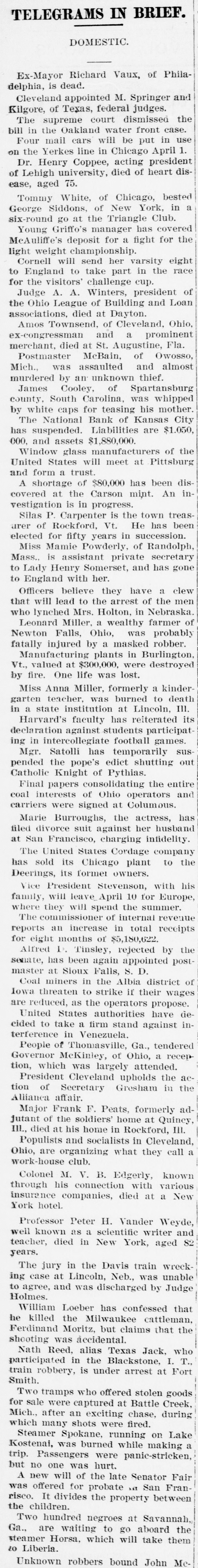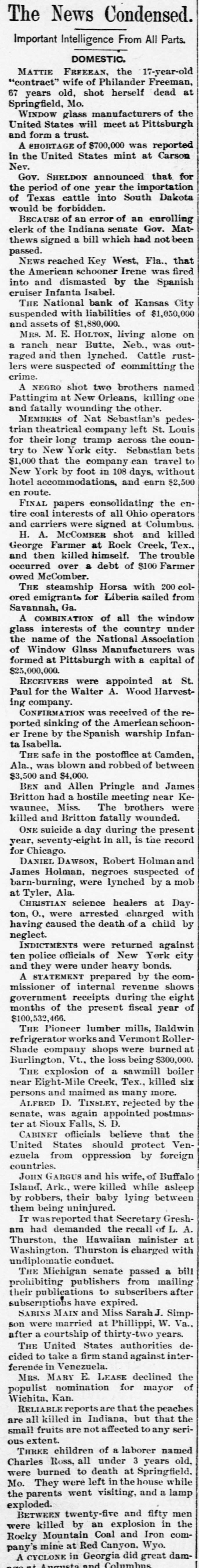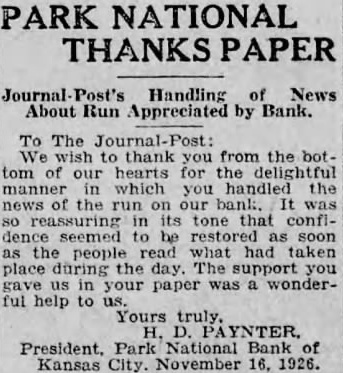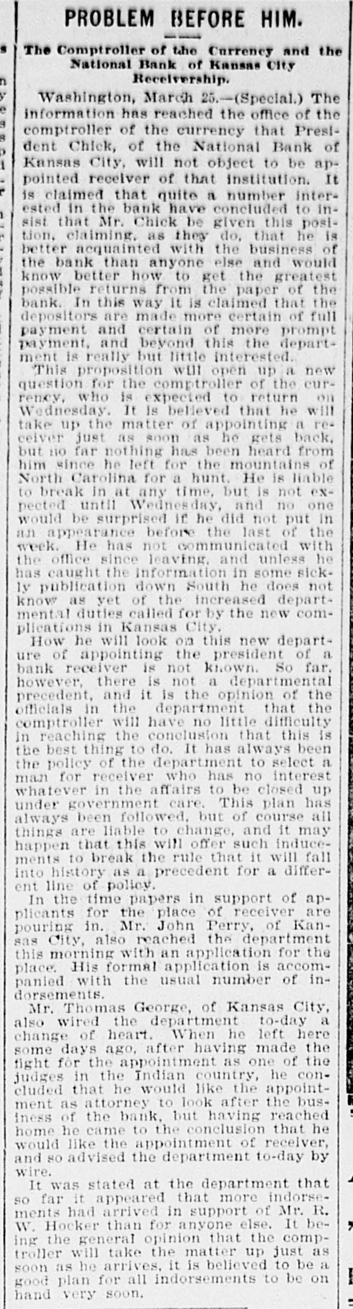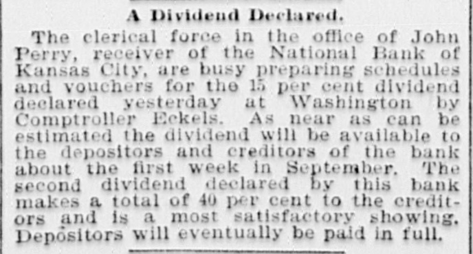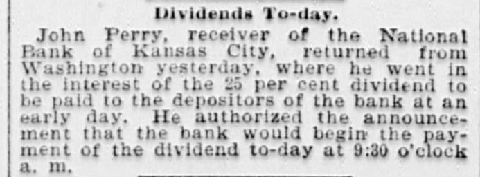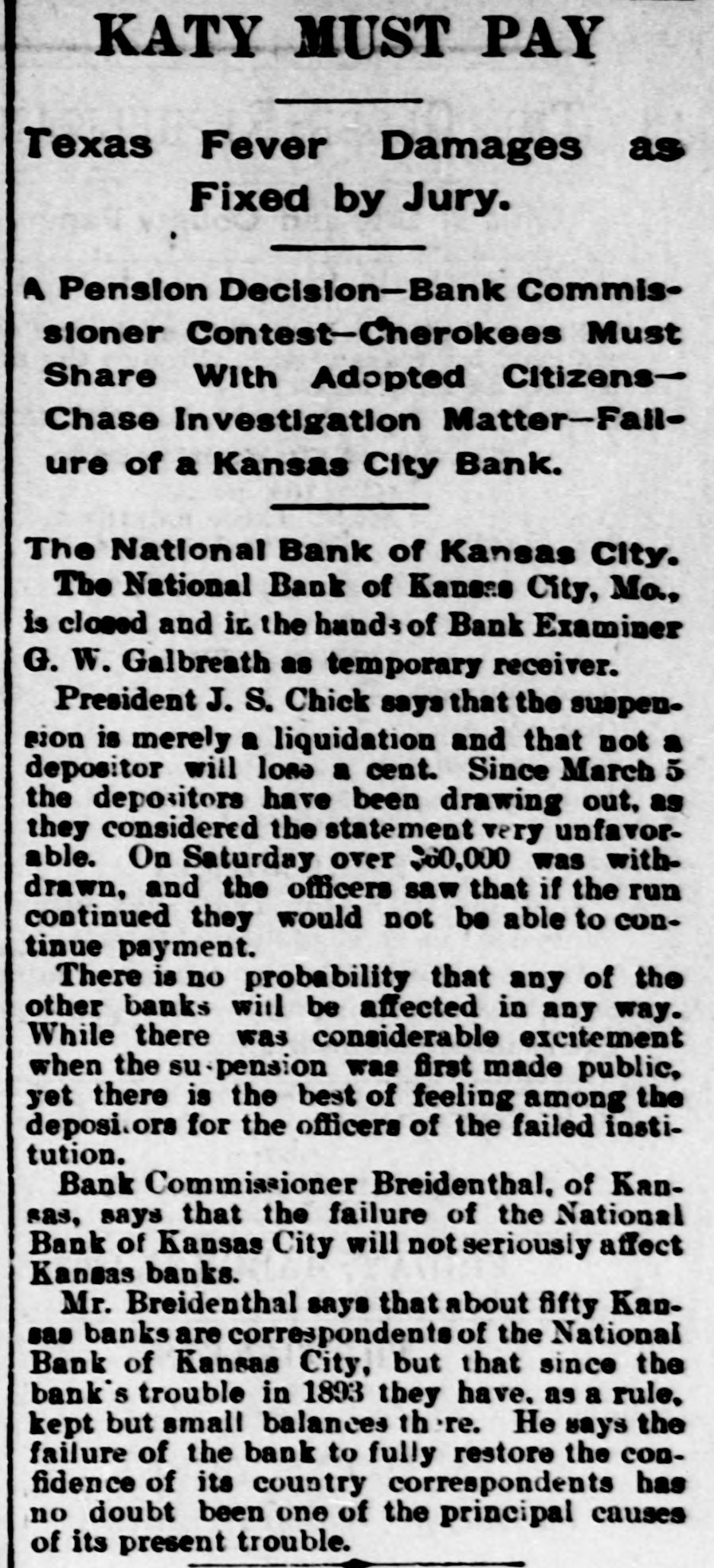 BIG BANK FAILS. National Bank of Kansas City Closes Its Doors. Steady Withdrawal of Deposits Since 1893 the Cause. SUSPENDED BEFORE. The Same Bank Closed During the Panic of '93. None of the Other Banks Will be Affected. KANSAS CITY, March 18.-The National bank of Kansas City failed to open its doors this morning. The direct cause of the failure was the unfavorable statement of bank affairs given out March 5. In the panic of 1893 the bank suspended, but through arrangements between depositors and stockholders it was permitted to resume business. The steady withdrawal of deposits since that time has placed the bank in an embarrassing position and necessitated another suspension. The statement given out is not complete. It shows assets of $1,800,000; liabilities $1,084,000. The Star this afternoon will say editorially that none of the other banks of the city will be in anyway affected, being in splendid condition. Though the bank was known to have been in a shaky condition, the failure was unexpected and the news of the suspension created quite a sensation in financial circles here. The following notices posted on the bank doors were the first intimation the public had that the bank's business had dropped off so much as to force it to close its doors: "10 depositors: The directors and stockholders of this bank have decided to discontinue business. All deposits will be paid in full. "[Signed,) J.S. CHICK, President." A second notice read: 'To W om it May Concern: "Time bank is in the hands of the unG. W. GALBREATH, dersigned. "Comptroller of the Currency." The following figuressh the gradual falling off in the bank's business since the panic of 1893: On July 12, 1893, the total deposits were $1,990,000; February 28, 1894, $1,777,000; March 5, 1895, $990,000. The total deposits aggregate $400,000; cash on hand yesterday $200,000. The bank is the oldest financialinetitution in the city, having been established by J: H. and W. H. Chick before the war. Until the panic of 1893 it was ranked as one of the strongest banks in d the west. In July, 1893, it succumbed to a run and temporarily closed its doors. n Although the capital was reduced and the stockholders paid in a 50 per cent h assessment in the reorganization, the institution has never recovered from the blow it received at that time and its suspension now is directly attributed to that suspension. The officers of the bank are closeted with several of the heavy depositors at this time. It is understood that it is the f intention to wind up the affairs of the ina stitution and retire from business. e President J. S. Chick says that the suspension is merely a liquidation and that not a depositor will lose a cent. Since March 5 the depositors have n been drawing out as they considered S the statement very unfavorable. On Saturday over $60,000 was withdrawn, and the officers saw that if the run continued, they would not be able to cone tinue payment today. f There is 110 probability that any of the other banks will be aflected in any way. t While there was considerable excitement when the suspension was first made public, yet there is the best of feeling among depositors for the officers of the failed institution.