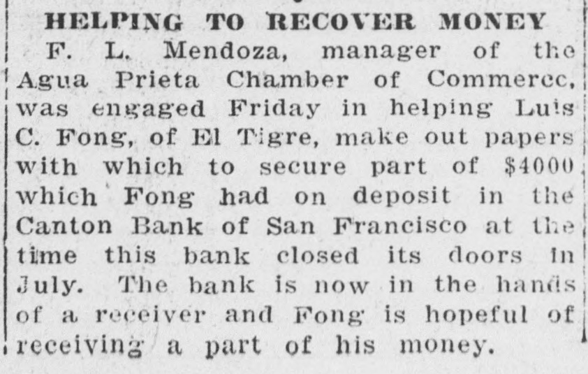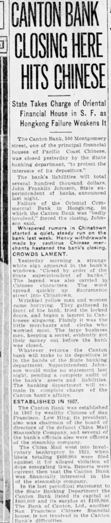 CANTON BANK CLOSING HERE HITS CHINESE State Takes Charge of Oriental Financial House in S. F. as Hongkong Failure Weakens It The Canton Bank, 500 Montgomery street, one of the principal financial houses of Pacific Coast Chinese, was closed yesterday by the State banking department, "to protect the interests of its depositors." The bank's liabilities will total several hundred thousand dollars, John Franklin Johnson, State su perintendent of banks, announced last night. Failure of the Oriental Commercial Bank in Hongkong, in which the Canton Bank was "badly involved,' forced the closing, Johnson said. Whispered rumors in Chinatown started a quiet, steady run on the bank last week. Heavy withdrawals made by cautious Chinese mer. chants hastened the bank's closing. CROWDS LAMENT Yesterday morning a strange white sign appeared in the bank's windows "Closed by order of the State superintendent of banks The legend was also carried in Chinese characters The word spread quickly up Sacramento street into Chinatown. Wrinkled yellow men and women came hurrying They gathered in front of the bank. tried the locked doors, and began lament in Can tonese singsong. Plainly was the little merchants and clerks who worried most. The large business men. keeping secret. evidently got their money out before the bank was closed. hatever returns the Canton bank will make to its depositors is in the hands of the State banking department. Superintendent Johnson would make no statement last night, pending complete audit of the bank's assets and liabilities The banking department will main in charge of the Canton affairs ESTABLISHED IN 1907. The Canton Bank was established in 1907 by wealthy Chinese of San Francisco. Lew Hing. its president, also was chairman of the board of directors of the defunct China Mail Steamship Company, and several of the bank's officials also were officers of the steamhip company The China Mail went into Involuntary bankruptcy in 1923, when libels totaling $800,000 were filed against it for alleged violation of dope smuggling laws. Reports were current then that the Canton Bank was financially interested in the of the steamship company. In its last periodical statement to the State Banking Department the Canton Bank listed its capital at $600,000 and its surplus at $100,000 The Bank of Canton, Ltd., another San Francisco Chinese financial house, not involved in the Canton Bank's difficulties