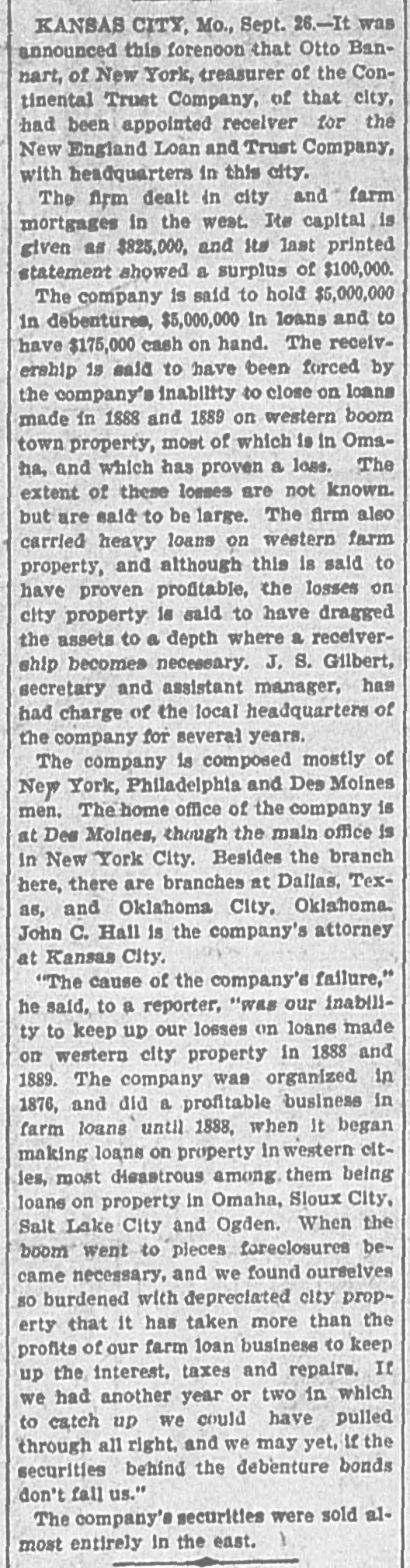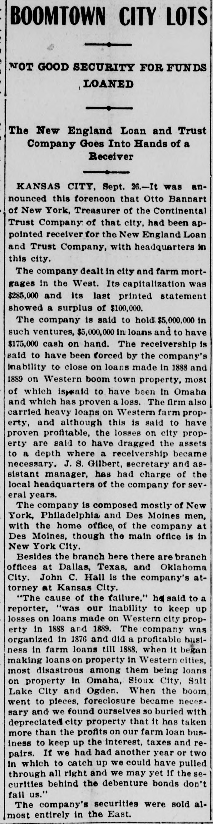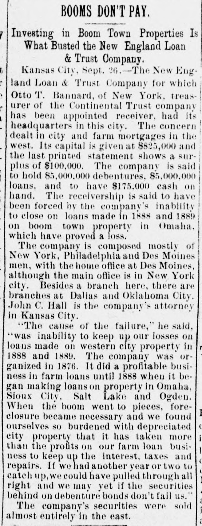 BOOMS DON'T PAY. Investing in Boom Town Properties Is What Busted the New England Loan & Trust Company. Kansas City, Sept. 26.-The New England Loan & Trust Company for which Otto T. Bannard, of New York. treasurer of the Continental Trust company has been appointed receiver. had its headquarters in this city. The concern dealt in city and farm mortgages in the west. Its capital is given at $825,000 and the last printed statement shows a surplus of $100,000. The company is said to hold $5,000,000 debentures, $5,000,000 loans. and to have $175,000 cash on hand. The receivership is said to have been forced by the company's inability to close on loans made in 1888 and 1889 on boom town property in Omaha. which have proved a loss. The company is composed mostly of New York, Philadelphia and Des Moines men, with the home office at Des Moines, although the main office is in New York city. Besides a branch here, there are branches at Dallas and Oklahoma City. John C. Hall is the company's attorney in Kansas City. "The cause of the failure, he said, was inability to keep up our losses on loans made on western city property in 1888 and 1889. The company was organized in 1876. It did a profitable business in farm loans until 1888 when it began making loans on property in Omaha, Sioux City, Salt Lake and Ogden. When the boom went to pieces, foreclosure became necessary and we found ourselves so burdened with depreciated city property that it has taken more than the profits on our farm loan business to keep up the interest, taxes and repairs. If we had another year or two to catch up, we could have pulled through all right and we may yet if the securities behind on debenture bonds don't fail us. The company's securities were sold almost entirely in the east.