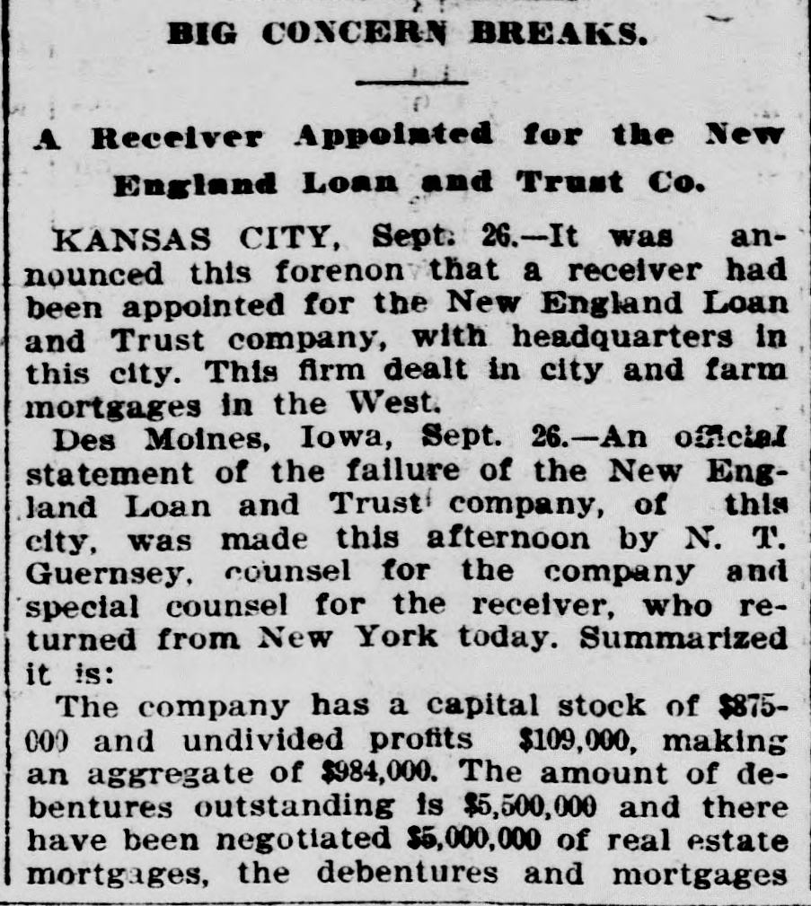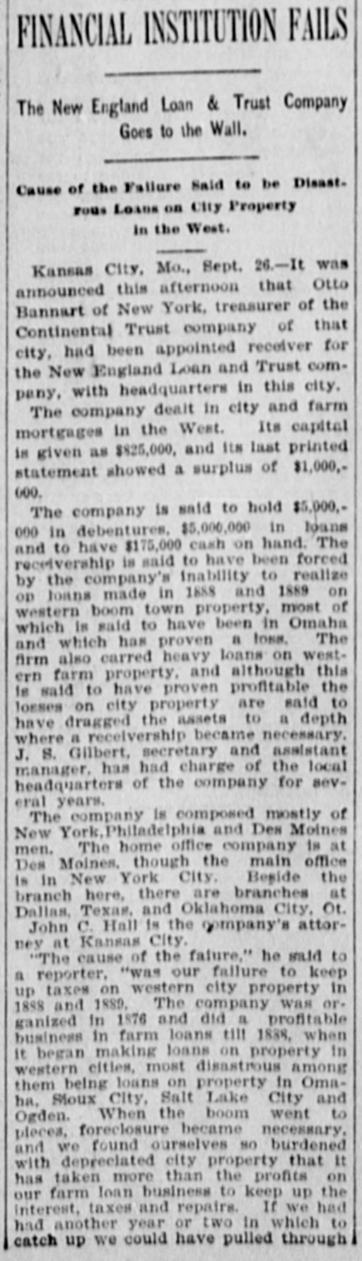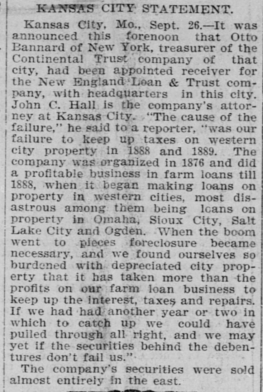 BOOMS DON'T PAY. Investing in Boom Town Properties Is What Busted the New England Loan & Trust Company. Kansas City, Sept. 26.-The New England Loan & Trust Company for which Otto T. Bannard, of New York. treasurer of the Continental Trust company has been appointed receiver. had its headquarters in this city. The concern dealt in city and farm mortgages in the west. Its capital is given at $825,000 and the last printed statement shows a surplus of $100,000. The company is said to hold $5,000,000 debentures, $5,000,000 loans. and to have $175,000 cash on hand. The receivership is said to have been forced by the company's inability to close on loans made in 1888 and 1889 on boom town property in Omaha. which have proved a loss. The company is composed mostly of New York, Philadelphia and Des Moines men, with the home office at Des Moines, although the main office is in New York city. Besides a branch here, there are branches at Dallas and Oklahoma City. John C. Hall is the company's attorney in Kansas City. "The cause of the failure, he said, was inability to keep up our losses on loans made on western city property in 1888 and 1889. The company was organized in 1876. It did a profitable business in farm loans until 1888 when it began making loans on property in Omaha, Sioux City, Salt Lake and Ogden. When the boom went to pieces, foreclosure became necessary and we found ourselves so burdened with depreciated city property that it has taken more than the profits on our farm loan business to keep up the interest, taxes and repairs. If we had another year or two to catch up, we could have pulled through all right and we may yet if the securities behind on debenture bonds don't fail us. The company's securities were sold almost entirely in the east.