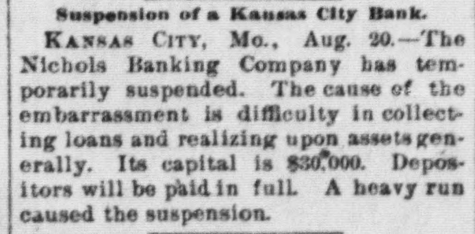 Suspension of a Kausas City Bank. KANSAS CITY, Mo., Aug. 20.-The Nichols Banking Company has temporarily suspended. The cause of the embarrassment is difficulty in collecting loans and realizing upon assetsgenerally. Its capital is $30,000. Depositors will be paidin full. A heavy run caused the suspension.