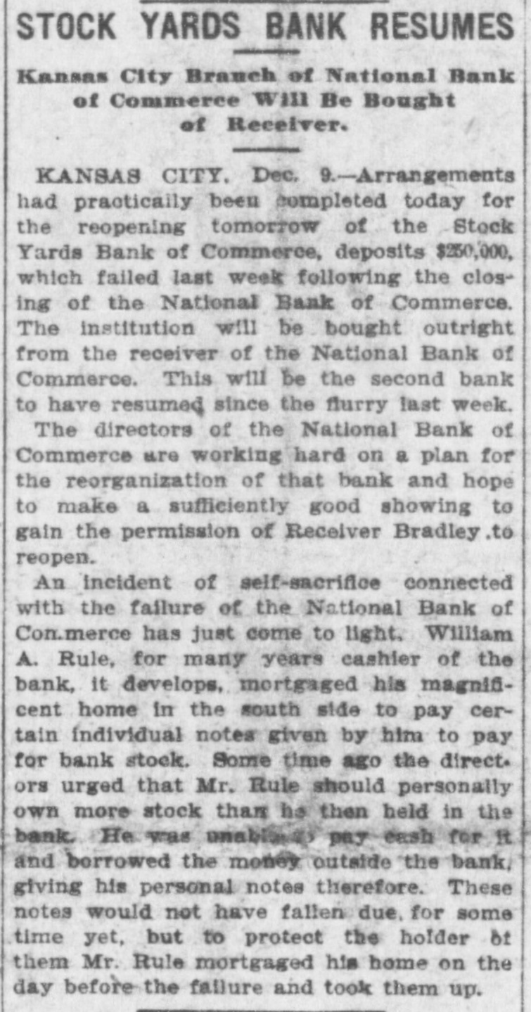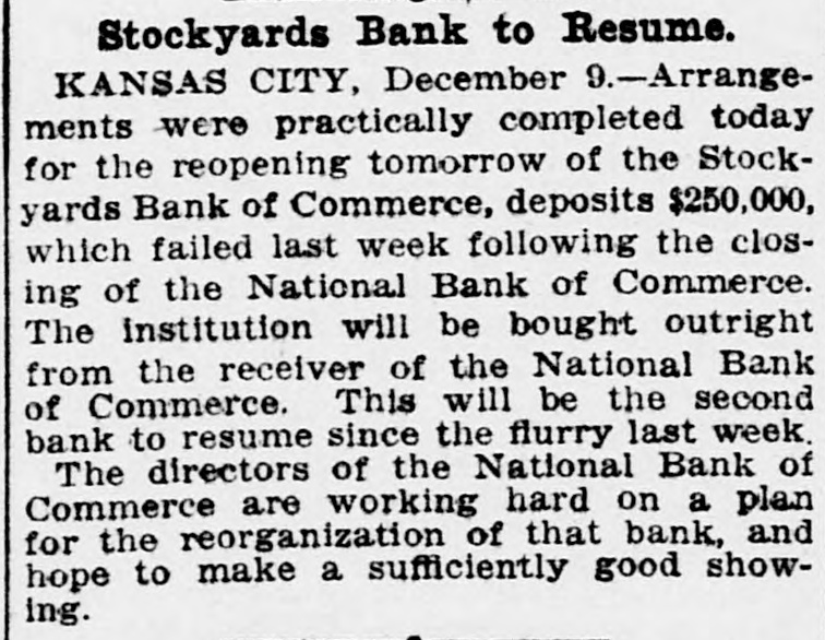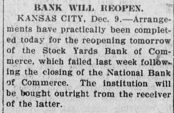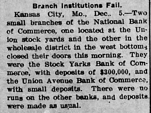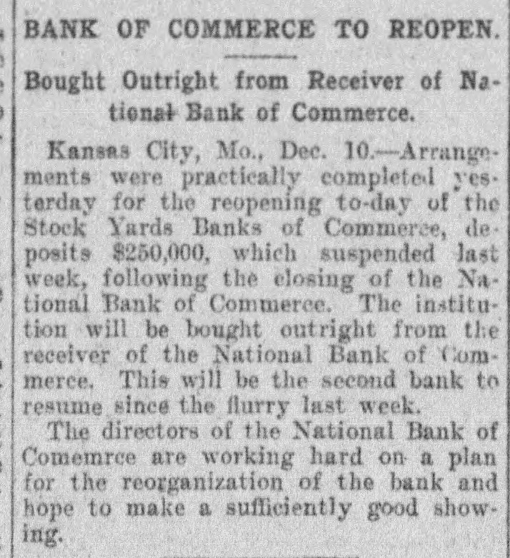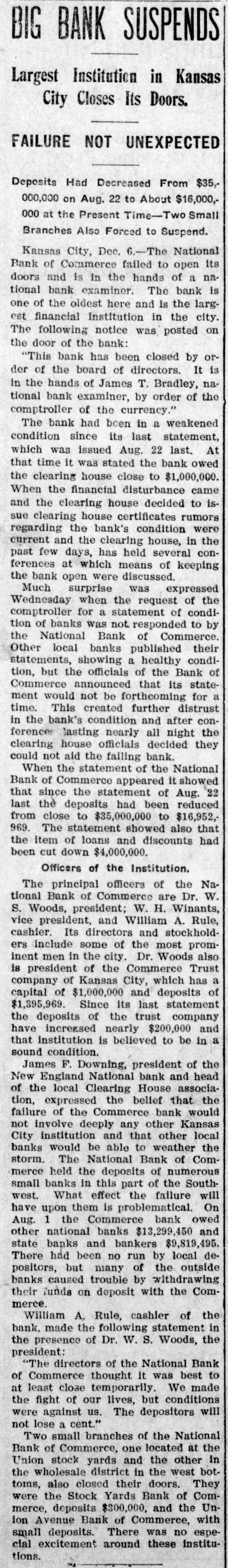 BANK FAILURE AT KANSAS CITY, MO. Large Financial Institution Is Forced to Close Its Doors. NATIONAL EXAMINER IN CHARGE News of the Failure Brings a Crowd to Bank Which Stops Street Traffic. Deposits of the Institution, the Nation. al Bank of Commerce, Have Fallen Off Heavily Other Banks Closed. Kansas City, Mo., Dec. 6.-The Na. tional Bank of Commerce of Kansas failed to open in and is in the the City, the morning, Mo., hands its doors of national bank examiner. The bank is oldest here and is larginstitution in est one financial of the the the city. The following notice was posted on of the bank at m.: the door 8:30 by a. "This bank has been closed order board of directors. It is in the of James T. hands of the Bradley, of the national bank examiner, by order comptroller of the currency." Bank in Weakened Condition. The bank has been in a weakened since its last condition statement, last. At which was issued Aug. 22, that time it was stated the bank owed the clearing house close to a million dollars. When the financial disturbance came and the clearing house decided to issue clearing house certificates, rumors regarding the bank's came, and the clearing in the past few days, condition house, has national held several conferences of other banking officials here in this connection, and means of keeping the bank open were discussed. No Response to Comptroller. Much surprise was expressed when the request of the comptroller for a of condition of was to by the statement not responded National banks Bank of Commerce. Other local banks pubtheir statements, a but of lished healthy condition, the showing officials the Commercial announced that its statement would not be forthcoming till morning. This created further distrust in the condition and after into the early bank's lasting hours conferences officials of the morning, the clearing house decided they could not aid the failing bank. Heavy Reduction in Deposits. the statement of the of Commerce the Bank When appeared that National in since morning papers it showed the statement of Aug. 22. last, the deposits had been reduced from close to $35,000,000 to $16,952,969. The statealso, that the item of discounts had been loans ment and showed, showing cut down $4,000,000. Its statement the off in deposits drew a of depositors to as big heavy crowd failing evidently the bank intent early as 9 o'clock, withdrawing their money. More excitement followed bank had been upon that or less the closed, the and news the crowd gradually grew in size until it stopped traffic. Depositors Will Not Lose. William A. Rule, cashier of the bank, made the following statement the in the presence of Dr. W. S. Woods, president: "The directors of the National Bank Commerce thought it was best to at of least close temporarily. We made the fight of our lives, but conditions were against us. The depositors will not lose cent." Dr. Woods acquiesced in what the cashier said and added: "You may also say that the Commerce Trust company is absolutely all right. Yesterday's statement showed 60 per cent of its cash on hand." Branch Banks Close. small branches of the Two located the National at Bank of Commerce, one the Union Stock Yards and the other in wholesale district in the west bottoms, also closed their doors during the morning. They were the Stock Yards Bank of Commerce, deposits. $300,000. Union Avenue Bank of Comwith small merce, and the deposits. around There was no especial excitement these institutions. The failure of these banks failed to cause a run on any of the other banks in this city. The State bank of Argentine, Kan., suburb, with small deposits, closed fola its doors early in the afternoon lowing run. Statement of Comptroller. Washington, Dec. 6. The comptrolcurrency, in a statement rethe failure of the Commerce of garding ler Bank of of the Kansas National City, says: bank is one of the largest in and in September of the about "This west $34,000,000 deposits. last Some- had due like $22,000,000 of this was thing other banks. The failure is doubt- made less to due to calls which have been National Bank of Commerce for banking to realize on their on ability these the balances them. and assets their quick- inly enough to meet "It is hoped that the bank will be be found solvent, so the depositors can paid in full if the bank is not able to resume."