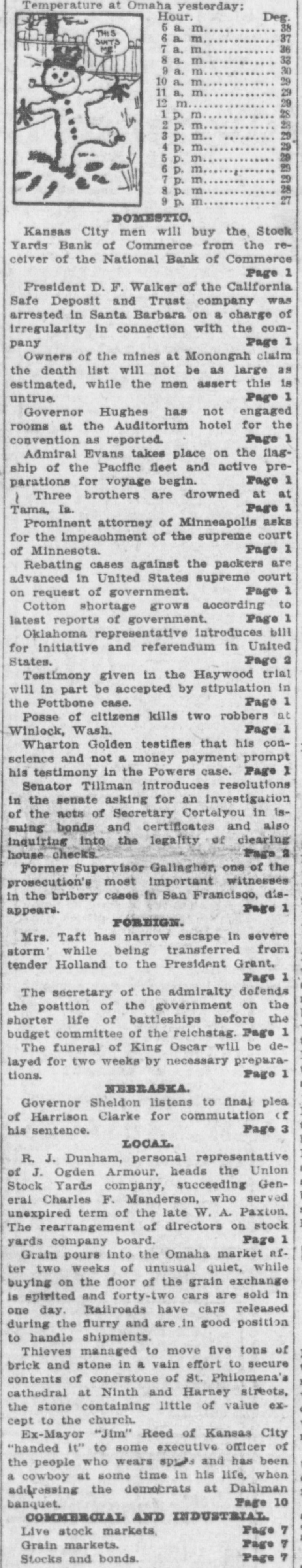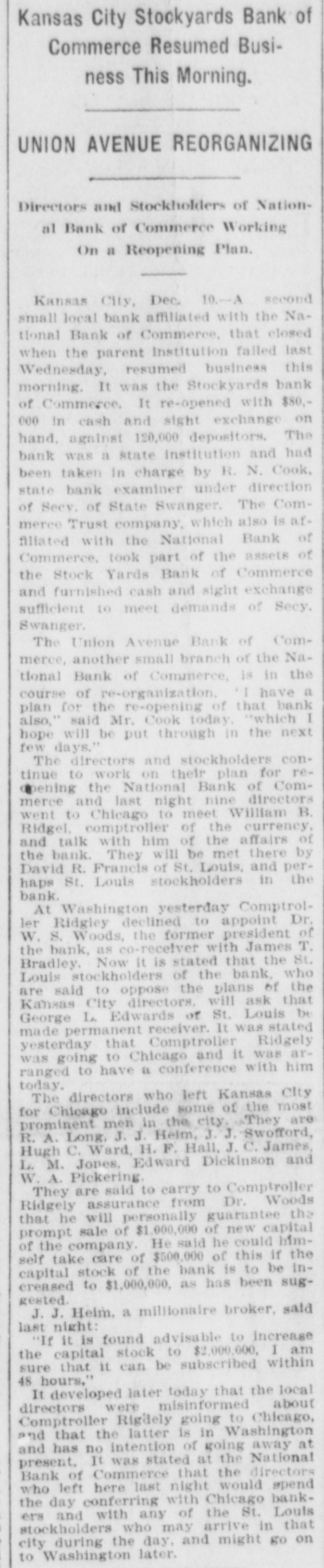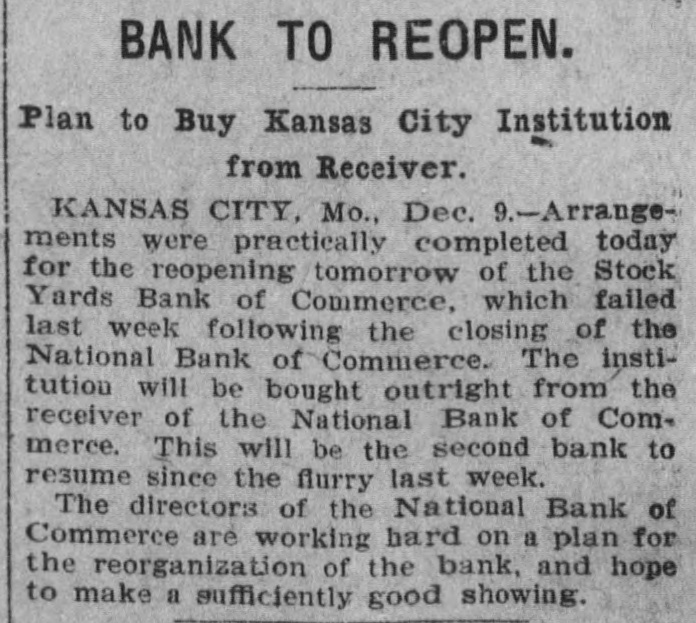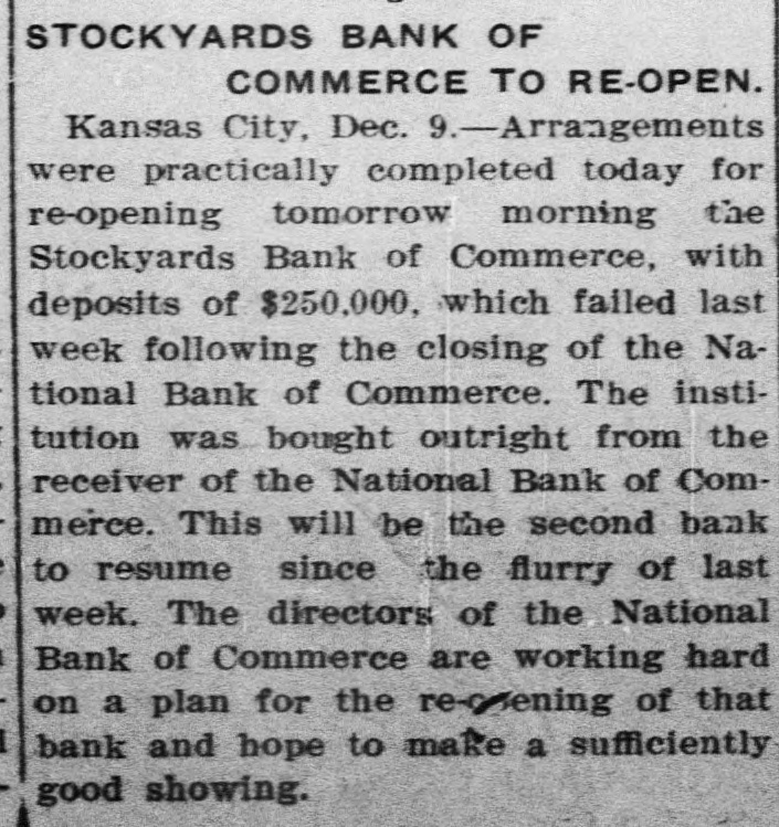 BANK FAILURE AT KANSAS CITY, MO. Large Financial Institution Is Forced to Close Its Doors. NATIONAL EXAMINER IN CHARGE News of the Failure Brings a Crowd to Bank Which Stops Street Traffic. Deposits of the Institution, the Nation. al Bank of Commerce, Have Fallen Off Heavily Other Banks Closed. Kansas City, Mo., Dec. 6.-The Na. tional Bank of Commerce of Kansas failed to open in and is in the the City, the morning, Mo., hands its doors of national bank examiner. The bank is oldest here and is larginstitution in est one financial of the the the city. The following notice was posted on of the bank at m.: the door 8:30 by a. "This bank has been closed order board of directors. It is in the of James T. hands of the Bradley, of the national bank examiner, by order comptroller of the currency." Bank in Weakened Condition. The bank has been in a weakened since its last condition statement, last. At which was issued Aug. 22, that time it was stated the bank owed the clearing house close to a million dollars. When the financial disturbance came and the clearing house decided to issue clearing house certificates, rumors regarding the bank's came, and the clearing in the past few days, condition house, has national held several conferences of other banking officials here in this connection, and means of keeping the bank open were discussed. No Response to Comptroller. Much surprise was expressed when the request of the comptroller for a of condition of was to by the statement not responded National banks Bank of Commerce. Other local banks pubtheir statements, a but of lished healthy condition, the showing officials the Commercial announced that its statement would not be forthcoming till morning. This created further distrust in the condition and after into the early bank's lasting hours conferences officials of the morning, the clearing house decided they could not aid the failing bank. Heavy Reduction in Deposits. the statement of the of Commerce the Bank When appeared that National in since morning papers it showed the statement of Aug. 22. last, the deposits had been reduced from close to $35,000,000 to $16,952,969. The statealso, that the item of discounts had been loans ment and showed, showing cut down $4,000,000. Its statement the off in deposits drew a of depositors to as big heavy crowd failing evidently the bank intent early as 9 o'clock, withdrawing their money. More excitement followed bank had been upon that or less the closed, the and news the crowd gradually grew in size until it stopped traffic. Depositors Will Not Lose. William A. Rule, cashier of the bank, made the following statement the in the presence of Dr. W. S. Woods, president: "The directors of the National Bank Commerce thought it was best to at of least close temporarily. We made the fight of our lives, but conditions were against us. The depositors will not lose cent." Dr. Woods acquiesced in what the cashier said and added: "You may also say that the Commerce Trust company is absolutely all right. Yesterday's statement showed 60 per cent of its cash on hand." Branch Banks Close. small branches of the Two located the National at Bank of Commerce, one the Union Stock Yards and the other in wholesale district in the west bottoms, also closed their doors during the morning. They were the Stock Yards Bank of Commerce, deposits. $300,000. Union Avenue Bank of Comwith small merce, and the deposits. around There was no especial excitement these institutions. The failure of these banks failed to cause a run on any of the other banks in this city. The State bank of Argentine, Kan., suburb, with small deposits, closed fola its doors early in the afternoon lowing run. Statement of Comptroller. Washington, Dec. 6. The comptrolcurrency, in a statement rethe failure of the Commerce of garding ler Bank of of the Kansas National City, says: bank is one of the largest in and in September of the about "This west $34,000,000 deposits. last Some- had due like $22,000,000 of this was thing other banks. The failure is doubt- made less to due to calls which have been National Bank of Commerce for banking to realize on their on ability these the balances them. and assets their quick- inly enough to meet "It is hoped that the bank will be be found solvent, so the depositors can paid in full if the bank is not able to resume."