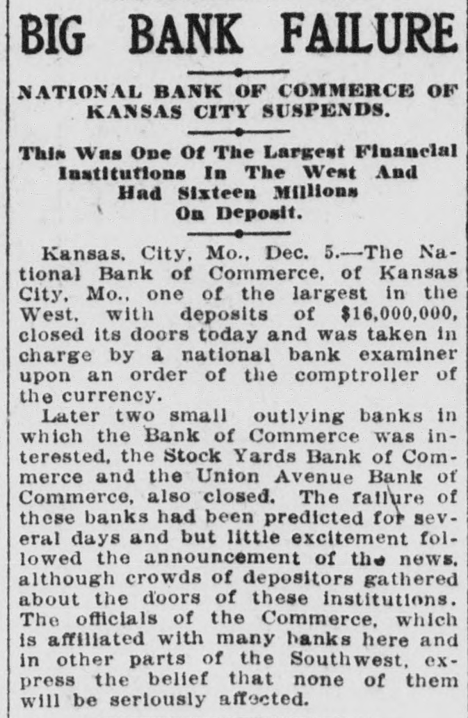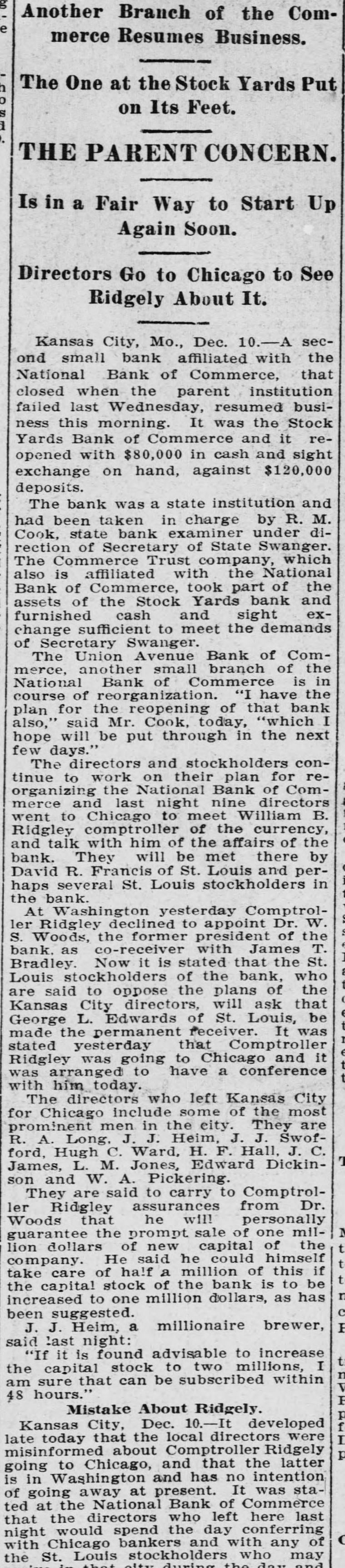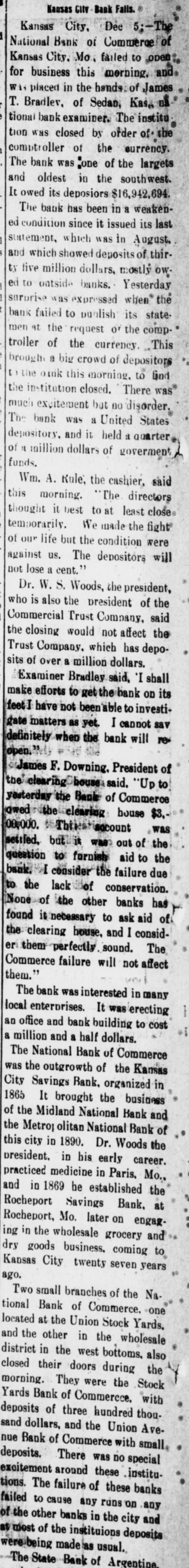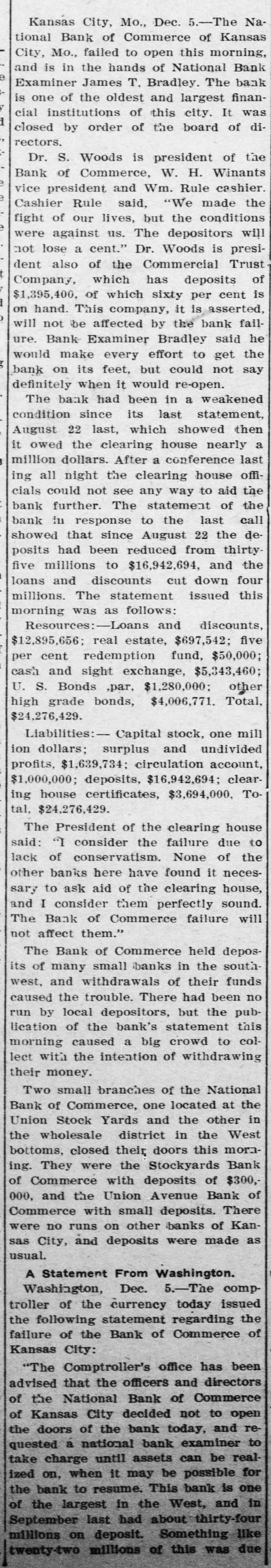 Kansas City, Mo., Dec. 5.-The National Bank of Commerce of Kansas City, Mo., failed to open this morning, and is in the hands of National Bank Examiner James T. Bradley. The bank is one of the oldest and largest finanI cial institutions of this city. It was closed by order of the board of directors. Dr. S. Woods is president of the Commerce, W. H. Winants and Wm. vice Bank president of Rule cashier. the Cashier Rule said, "We made fight of our lives, but the conditions were against us. The depositors will not lose a cent." Dr. Woods is president also of the Commercial Trust t Company, which has deposits of $1,395,400, of which sixty per cent is on hand. This company, it is asserted, will not be affected by the bank failure. Bank Examiner Bradley said he would make every effort to get the bank on its feet, but could not say definitely when it would re-open. The bank had been in a weakened condition since its last statement, August 22 last, which showed then it owed the clearing house nearly a After a million dollars. conference house last offiing all night the clearing cials could not see any way to aid the bank further. The statement of the bank in response to the last call showed that since August 22 the deposits had been reduced from thirtyfive millions to $16,942,694, and the loans and discounts cut down four millions. The statement issued this morning was as follows: Resources:-Loa and discounts, $12,895,656 real estate, $697,542; five per cent redemption fund, $50,000; cash and sight exchange, $5,343,460; U. S. Bonds ,par, $1,280,000; other high grade bonds, $4,006,771. Total, $24,276,429. Liabilities:- Capital stock, one mill ion dollars; surplus and undivided profits, $1,639,734; circulation account, $1,000,000; deposits, $16,942,694; clearing house certificates, $3,694,000. Total. $24,276,429. The President of the clearing house said: "I consider the failure due to lack of conservatism. None of the other banks here have found it necessary to ask aid of the clearing house, and I consider them perfectly sound. The Bank of Commerce failure will not affect them." The Bank of Commerce held deposits of many small banks in the southwest, and withdrawals of their funds caused the trouble. There had been no run by local depositors, but the publication of the bank's statement this morning caused a big crowd to collect with the intention of withdrawing their money. Two small branches of the National Bank of Commerce, one located at the Union Stock Yards and the other in the wholesale district in the West bottoms, closed their doors this morning. They were the Stockyards Bank of Commerce with deposits of $300, 000, and the Union Avenue Bank of Commerce with small deposits. There were no runs on other banks of Kansas City, and deposits were made as usual. A Statement From Washington. Washington, Dec. 5.-The comptroller of the currency today issued the following statement regarding the failure of the Bank of Commerce of Kansas City: "The Comptroller's office has been advised that the officers and directors of the National Bank of Commerce of Kansas City decided not to open the doors of the bank today, and requested a national bank examiner to take charge until assets can be realized on, when it may be possible for the bank to resume. This bank is one of the largest in the West, and in September last had about thirty-four millions on deposit. Something like twenty-two millions of this was due