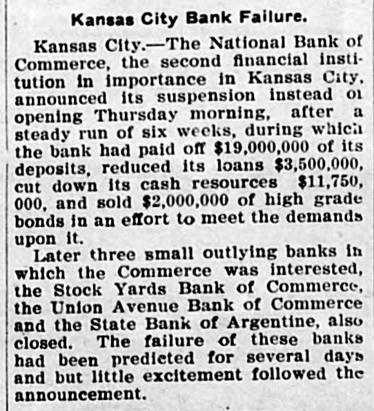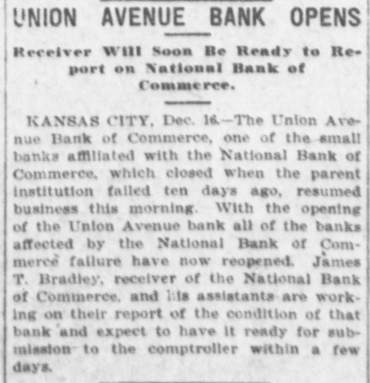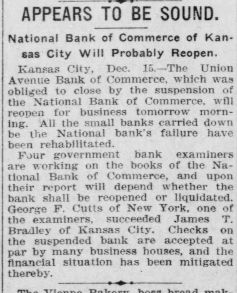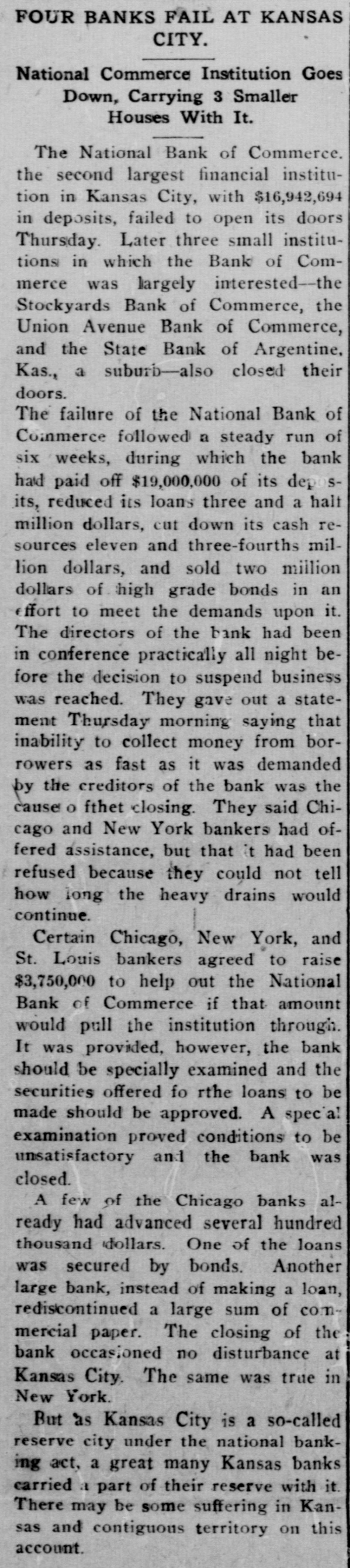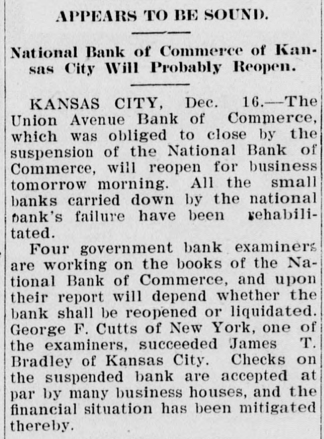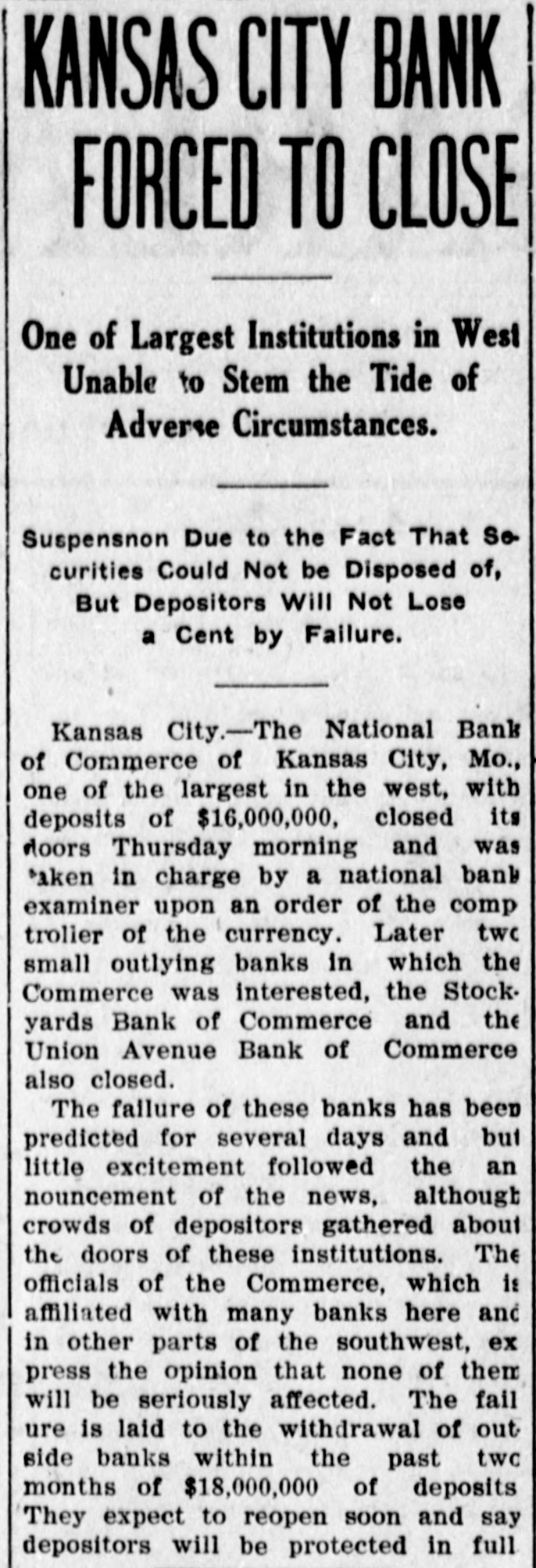 Kansas City, Mo., Dec. 5.-The National Bank of Commerce of Kansas City, Mo., failed to open this morning, and is in the hands of National Bank Examiner James T. Bradley. The bank is one of the oldest and largest finanI cial institutions of this city. It was closed by order of the board of directors. Dr. S. Woods is president of the Commerce, W. H. Winants and Wm. vice Bank president of Rule cashier. the Cashier Rule said, "We made fight of our lives, but the conditions were against us. The depositors will not lose a cent." Dr. Woods is president also of the Commercial Trust t Company, which has deposits of $1,395,400, of which sixty per cent is on hand. This company, it is asserted, will not be affected by the bank failure. Bank Examiner Bradley said he would make every effort to get the bank on its feet, but could not say definitely when it would re-open. The bank had been in a weakened condition since its last statement, August 22 last, which showed then it owed the clearing house nearly a After a million dollars. conference house last offiing all night the clearing cials could not see any way to aid the bank further. The statement of the bank in response to the last call showed that since August 22 the deposits had been reduced from thirtyfive millions to $16,942,694, and the loans and discounts cut down four millions. The statement issued this morning was as follows: Resources:-Loa and discounts, $12,895,656 real estate, $697,542; five per cent redemption fund, $50,000; cash and sight exchange, $5,343,460; U. S. Bonds ,par, $1,280,000; other high grade bonds, $4,006,771. Total, $24,276,429. Liabilities:- Capital stock, one mill ion dollars; surplus and undivided profits, $1,639,734; circulation account, $1,000,000; deposits, $16,942,694; clearing house certificates, $3,694,000. Total. $24,276,429. The President of the clearing house said: "I consider the failure due to lack of conservatism. None of the other banks here have found it necessary to ask aid of the clearing house, and I consider them perfectly sound. The Bank of Commerce failure will not affect them." The Bank of Commerce held deposits of many small banks in the southwest, and withdrawals of their funds caused the trouble. There had been no run by local depositors, but the publication of the bank's statement this morning caused a big crowd to collect with the intention of withdrawing their money. Two small branches of the National Bank of Commerce, one located at the Union Stock Yards and the other in the wholesale district in the West bottoms, closed their doors this morning. They were the Stockyards Bank of Commerce with deposits of $300, 000, and the Union Avenue Bank of Commerce with small deposits. There were no runs on other banks of Kansas City, and deposits were made as usual. A Statement From Washington. Washington, Dec. 5.-The comptroller of the currency today issued the following statement regarding the failure of the Bank of Commerce of Kansas City: "The Comptroller's office has been advised that the officers and directors of the National Bank of Commerce of Kansas City decided not to open the doors of the bank today, and requested a national bank examiner to take charge until assets can be realized on, when it may be possible for the bank to resume. This bank is one of the largest in the West, and in September last had about thirty-four millions on deposit. Something like twenty-two millions of this was due