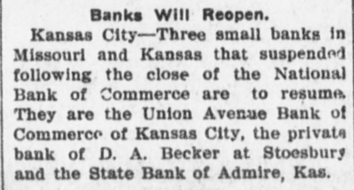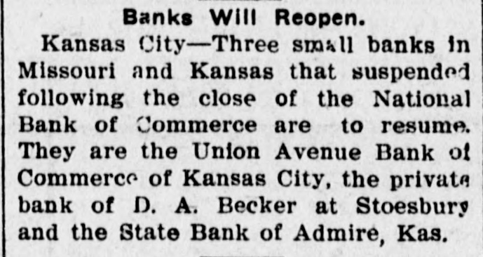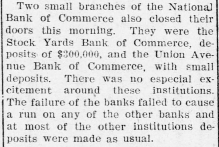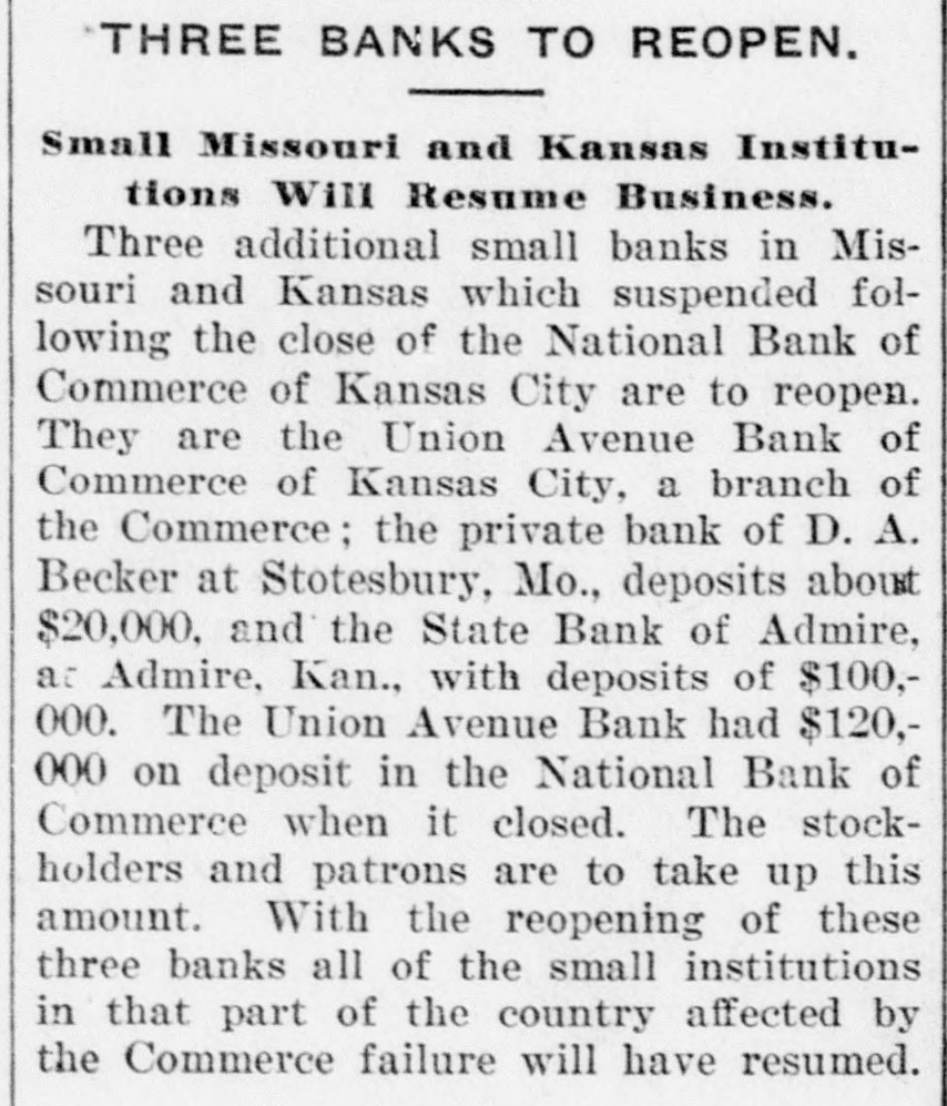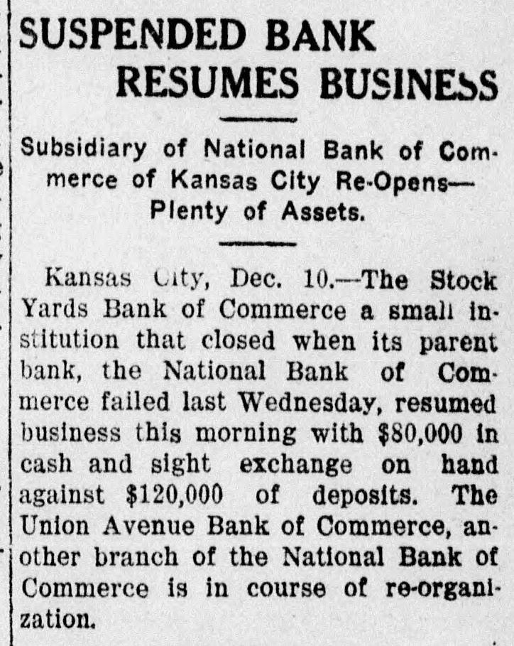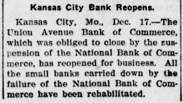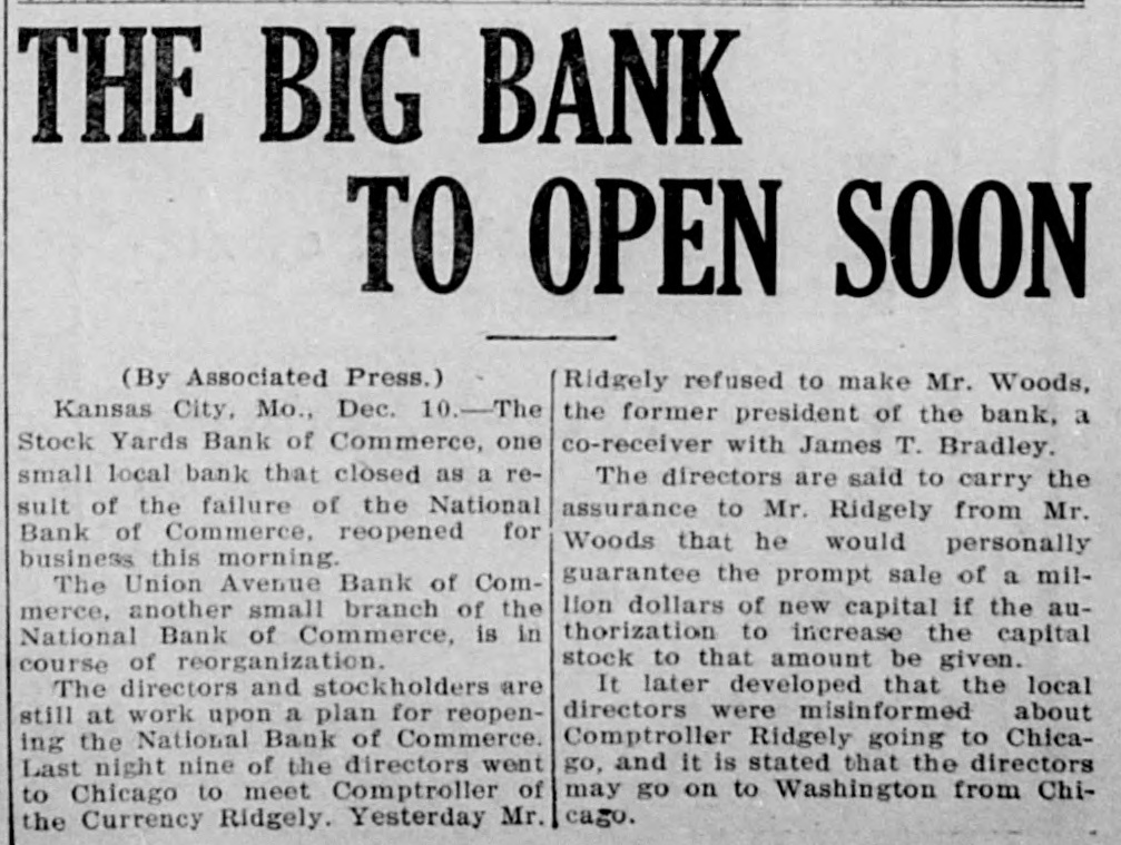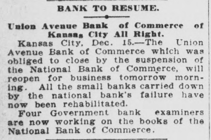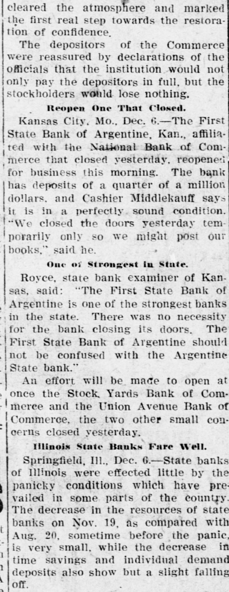 Kansas City, Mo., Dec. 5.-The National Bank of Commerce of Kansas City, Mo., failed to open this morning, and is in the hands of National Bank Examiner James T. Bradley. The bank is one of the oldest and largest finanI cial institutions of this city. It was closed by order of the board of directors. Dr. S. Woods is president of the Commerce, W. H. Winants and Wm. vice Bank president of Rule cashier. the Cashier Rule said, "We made fight of our lives, but the conditions were against us. The depositors will not lose a cent." Dr. Woods is president also of the Commercial Trust t Company, which has deposits of $1,395,400, of which sixty per cent is on hand. This company, it is asserted, will not be affected by the bank failure. Bank Examiner Bradley said he would make every effort to get the bank on its feet, but could not say definitely when it would re-open. The bank had been in a weakened condition since its last statement, August 22 last, which showed then it owed the clearing house nearly a After a million dollars. conference house last offiing all night the clearing cials could not see any way to aid the bank further. The statement of the bank in response to the last call showed that since August 22 the deposits had been reduced from thirtyfive millions to $16,942,694, and the loans and discounts cut down four millions. The statement issued this morning was as follows: Resources:-Loa and discounts, $12,895,656 real estate, $697,542; five per cent redemption fund, $50,000; cash and sight exchange, $5,343,460; U. S. Bonds ,par, $1,280,000; other high grade bonds, $4,006,771. Total, $24,276,429. Liabilities:- Capital stock, one mill ion dollars; surplus and undivided profits, $1,639,734; circulation account, $1,000,000; deposits, $16,942,694; clearing house certificates, $3,694,000. Total. $24,276,429. The President of the clearing house said: "I consider the failure due to lack of conservatism. None of the other banks here have found it necessary to ask aid of the clearing house, and I consider them perfectly sound. The Bank of Commerce failure will not affect them." The Bank of Commerce held deposits of many small banks in the southwest, and withdrawals of their funds caused the trouble. There had been no run by local depositors, but the publication of the bank's statement this morning caused a big crowd to collect with the intention of withdrawing their money. Two small branches of the National Bank of Commerce, one located at the Union Stock Yards and the other in the wholesale district in the West bottoms, closed their doors this morning. They were the Stockyards Bank of Commerce with deposits of $300, 000, and the Union Avenue Bank of Commerce with small deposits. There were no runs on other banks of Kansas City, and deposits were made as usual. A Statement From Washington. Washington, Dec. 5.-The comptroller of the currency today issued the following statement regarding the failure of the Bank of Commerce of Kansas City: "The Comptroller's office has been advised that the officers and directors of the National Bank of Commerce of Kansas City decided not to open the doors of the bank today, and requested a national bank examiner to take charge until assets can be realized on, when it may be possible for the bank to resume. This bank is one of the largest in the West, and in September last had about thirty-four millions on deposit. Something like twenty-two millions of this was due
