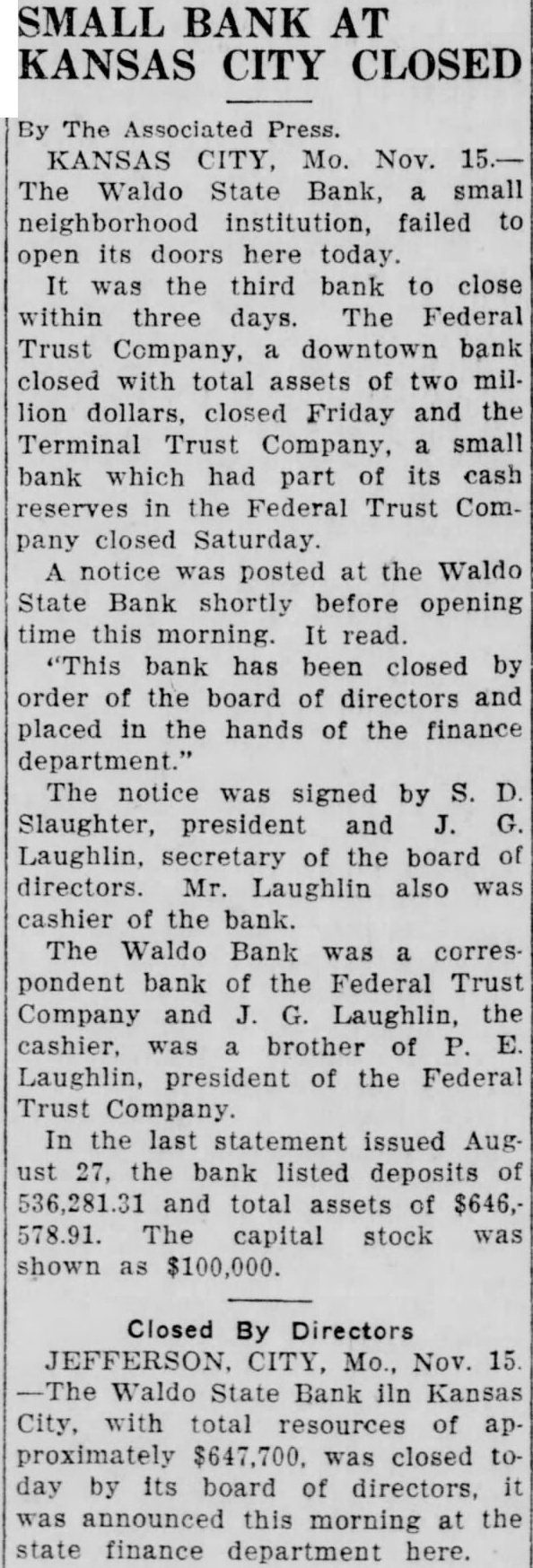 and John Laughlin, cashier. The notice: This bank has been closed by order the board and placed in the hands of the department of finance. Drawn blinds on all the windows and doors the bank greeted early arrivals. When the sign was about thirty most depositors, were in front of the bank building Vincent E. Murphy is vice of the bank. Directors in the institution Mr. Laughlin was the bank's largest 180 while president of the closed Federal Trust company, owned 150 shares. Mr. Laughlin, cashier of the bank. brother the president of the Federal Trust company. which closed Friday following heavy withdrawals. The Waldo bank was not member the Kansas City Clearing House as. sociation. W. Heyde and R. E. Shelby, deputy state finance commissioners, were placed in charge of the bank. With the closing the Federal Trust bank Friday, Mr. Heyde, representing the state finance department. began an examination of the Waldo bank. The institution carried $135,000 funds on deposit the time the This deposit secured by bonds Decision to close the bank was not reached until o'clock this at director's meeting, although three previous had been held yesterday and last night in an effort to avoid closing Had Deposit in Federal Like the Kansas City Terminal Trust which was forced close doors Saturday of the fear run precipitated by the closing the Federal Trust the Waldo bank had cash on deposit in Federal Trust company. This not the chief contributfactor closing the Waldo financial institution, however, directors said today. The heavy run Saturday fear another today brought decision to close. George Croner. grocer in Waldo and director of the bank. said Saturday depleted the bank's cash The cash required be the banking is per cent of the deposits Reopening Move Hinted. Mr. Croner said he convinced the bank and will pay out full. He even indicated there might move to reopen within the period alloted. The bank does not hold bad paper, he said. Organized 1920. the bank began business with capital of its was composed largely Waldo men merchants. last financial statement the bank was issued August total deposits to be $536,The statement: RESOURCES fixtures sight drafts Total assets LIABILITIES profits Total Full Predicted. The Waldo bank will pay 100 cents on the dollar, only but stockholders as well, director declared. Not more than $10,000 to $15,000 of paper was held in the bank the closing, the tor This will be more off. the the bank building. which by the bank and which at least in excess the $55,000 value which carried on the bank books. the director He announced plans already under consideration for reopening the because such an institution needed the Waldo not be absorbed by another bank, the director believes.
