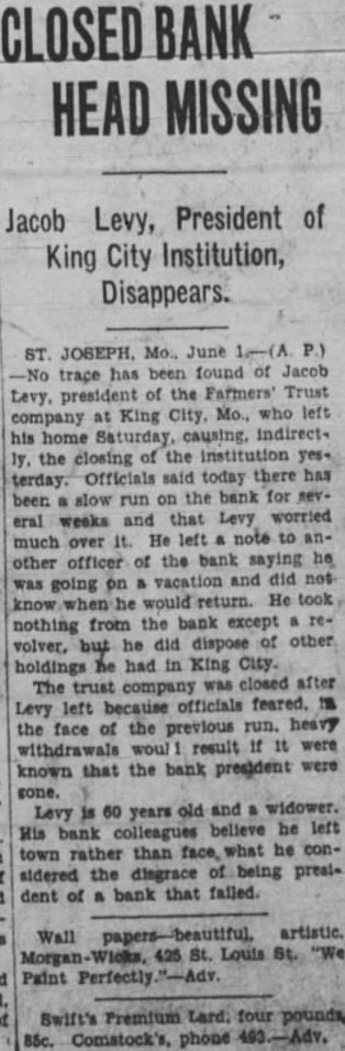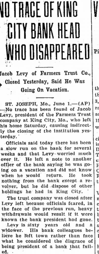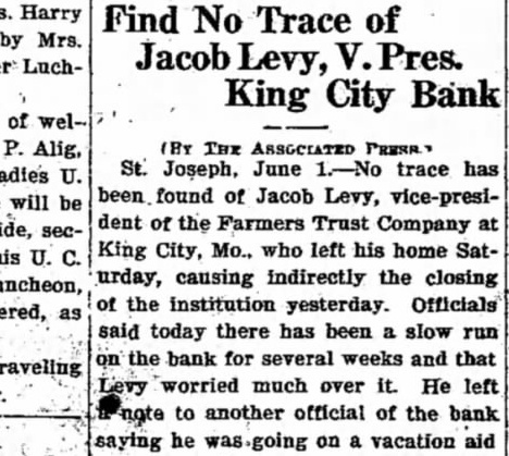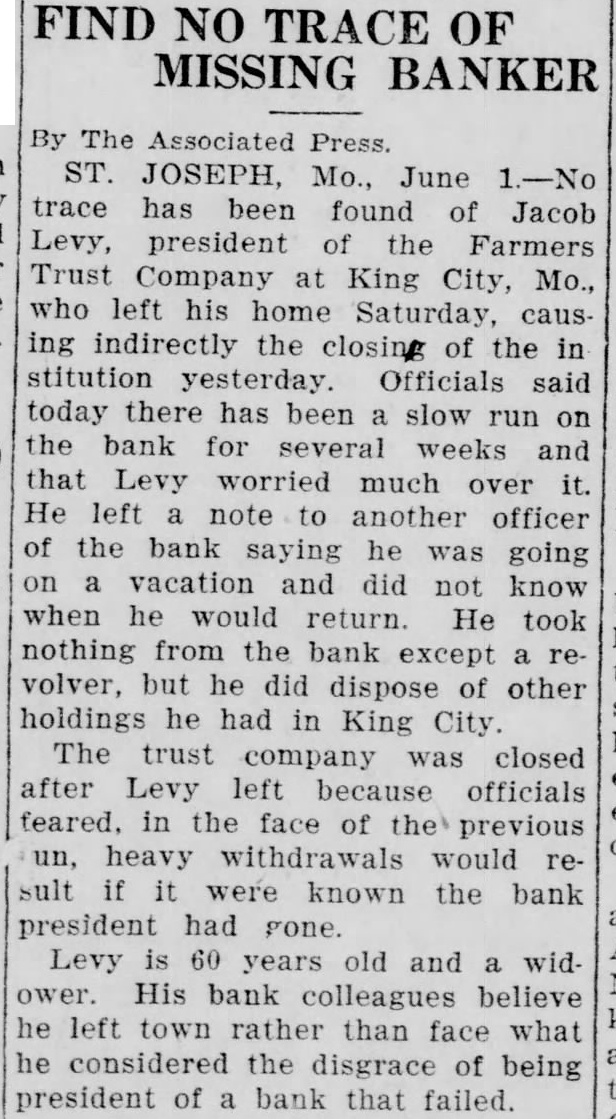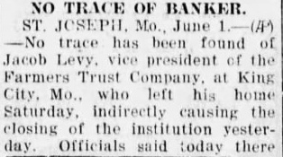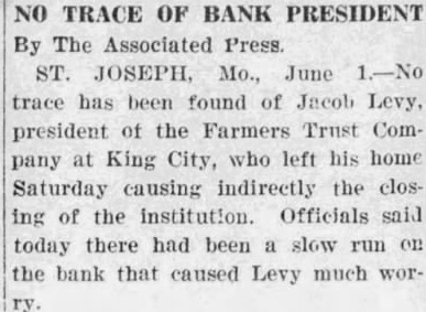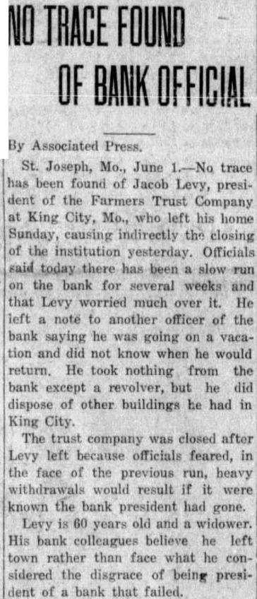 St. Joseph, Mo., June 1.-No trace has been found of Jacob Levy, president of the Farmers Trust Company at King City, Mo., who left his home Sunday, causing indirectly the closing of the institution yesterday. Officials said today there has been a slow run on the bank for several weeks and that Levy worried much over it. He left a note to another officer of the bank saying he was going on a vacation and did not know when he would return. He took nothing from the bank except a revolver, but he did dispose of other buildings he had in King City. The trust company was closed after Levy left because officials feared, in the face of the previous run, heavy withdrawals would result if it were known the bank president had gone. Levy is 60 years old and a widower. His bank colleagues believe he left town rather than face what he considered the disgrace of being president of a bank that failed.