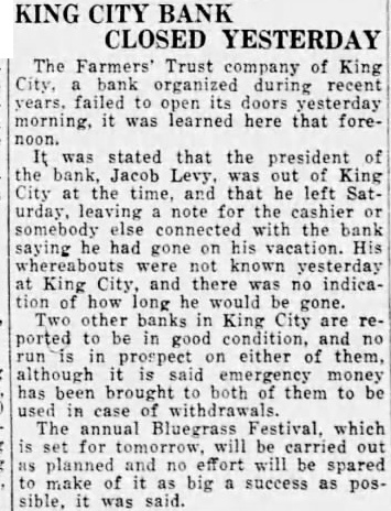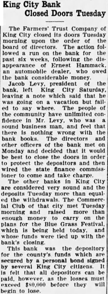 The Farmers' Trust Company King City closed its doors Tuesday morning upon order of board directors. The action lowed on bank for the past weeks, following disappearance Ernest Hammack. automobile dealer. owed the bank considerable money. Jacob Levy. of the left King City Saturday, leaving note which said that going but failsay where. The people of community have unlimited fidence in Levy, was sound business man, and feel that there nothing wrong with the bank books. The directors and other officers of the bank Monday and that would be best close the doors in order protect the depositors and then wired the state finance commissioner come and take charge. The other banks in King very sound and the deposits Tuesday more than equalthe The Club that city met Tuesday morning and raised more than enough money the plans for Blue Grass being held and funds tied up with the closing. This bank was the depository for the county's funds which secured by personal bond signed King City citizens. that all can the losses must before they will begin to lose.