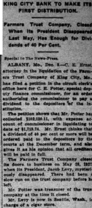 (By the Associated Press) St. Joseph, June trace has been found of Jacob Levy, vice president of the Farmers Trust Co., at King City, Mo., who left his home Saturday, causing indirectly the closing of the institution yesterday. Officials said today there has been a slow run on the bank for several weeks and that Levy worried much over it. He left a note to another officer of the bank saying he was going on vacation and did not know when he would return. He took nothing from the bank except a revolver but he did dispose of other holdings in King City. The Trust company closed after Levy left because officials feared in the face of the previous run that heavy withdrawals would result if it were known that the bank president had gone. Levy is 60 years old and a widower, His bank colleagues believe he left town rather than face what he considered the disgrace of being president of a bank that failed. free." "The gates of America are wide open to industry," he said "and it is up to each individual person to decide definitely what course he will follow and the importance of it is that he keep in that path. "Religion, morality and knowledge are the essential ideals of a true American. Will you, as citizens of America, with mentality and ability to progress, uphold these ideals or will you tear them down for the socalled socialism being practiced by many today? "Loyalty to the constitution of the United States and the enforcement of its laws, should be observed by every true American citizen." Mr. Hyde complimented the class members for having had the opportunity to complete their work in such a college as Ozark Wesleyan, which he stated sets forth a vision and an ideal for religion, morality and knowledge. The Rev. J. C. Gilbreath of Sedalia, member of the board of trustees of Ozark Wesleyan, read group of resolutions passed and adopted during the session of the board yesterday, written in appreciation of the work accomplished during the last year and praising those who were instrumental in bringing about Ozark Wesleyan success. Dean Reser Presents Classes The graduates in the two departments of the college receiving diplomas were presented by Dean L. Reser. The 17 academic graduates, wearing gray caps and gowns took their places on the platform first. The 54 college students followed, in black caps and gowns. This group included students receiving diplomas in the departments science, education and fine arts. Teachers' certificates were also awarded at this time. The diplomas were presented by President King, who spoke to the students, urging that they not drop their education and college life now that they had completed the junior college work, but that they return to Ozark Wesleyan next year for the other two years' work. The Rev. Gilbreath of Sedalia,