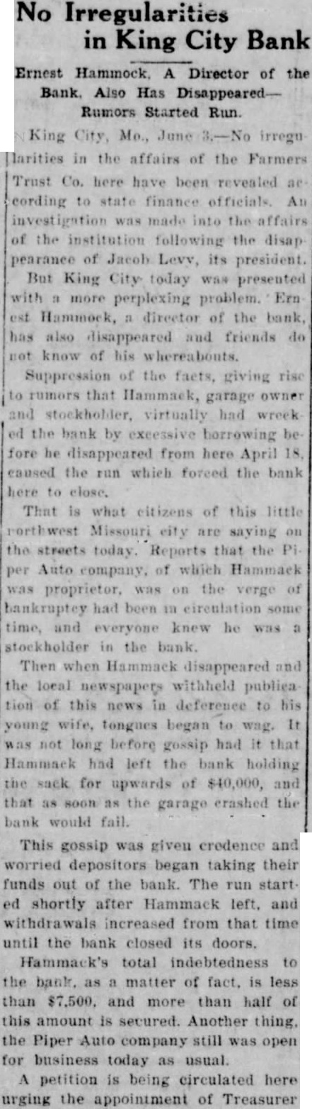 King City, Mo., June 3.-No irregu larities in the affairs of the Farmers Trust Co. here have been revealed ae cording to state finance officials. An investigation was made into the affairs of the institution following the disap pearance of Jacob Levy, its president. But King City today was presented with a more perplexing problem. Ern est Hammock, a director of the bank, has also disappeared and friends do not know of his whereabouts. Suppression of the facts, giving rise to rumors that Hammack, garage owner and stockholder, virtually had wreek ed the bank by excessive borrowing be fore he disappeared from here April 18 caused the run which forced the bank here to close. That is what citizens of this little rorthwest Missouri city are saying on the streets today. Reports that the Piper Auto company, of which Hammaek was proprietor, was on the verge of bankruptcy had been in circulation some time, and everyone knew he was a stockholder in the bank. Then when Hammack disappeared and the local newspapers withheld publica tion of this news in deference to his young wife, tongues began to wag. It was not long before gossip had it that Hammack had left the bank holding the sack for upwards of $40,000, and that as soon as the garage crashed the bank would fail.