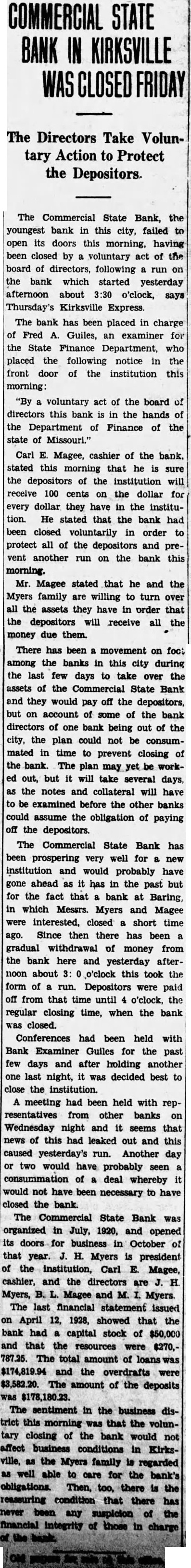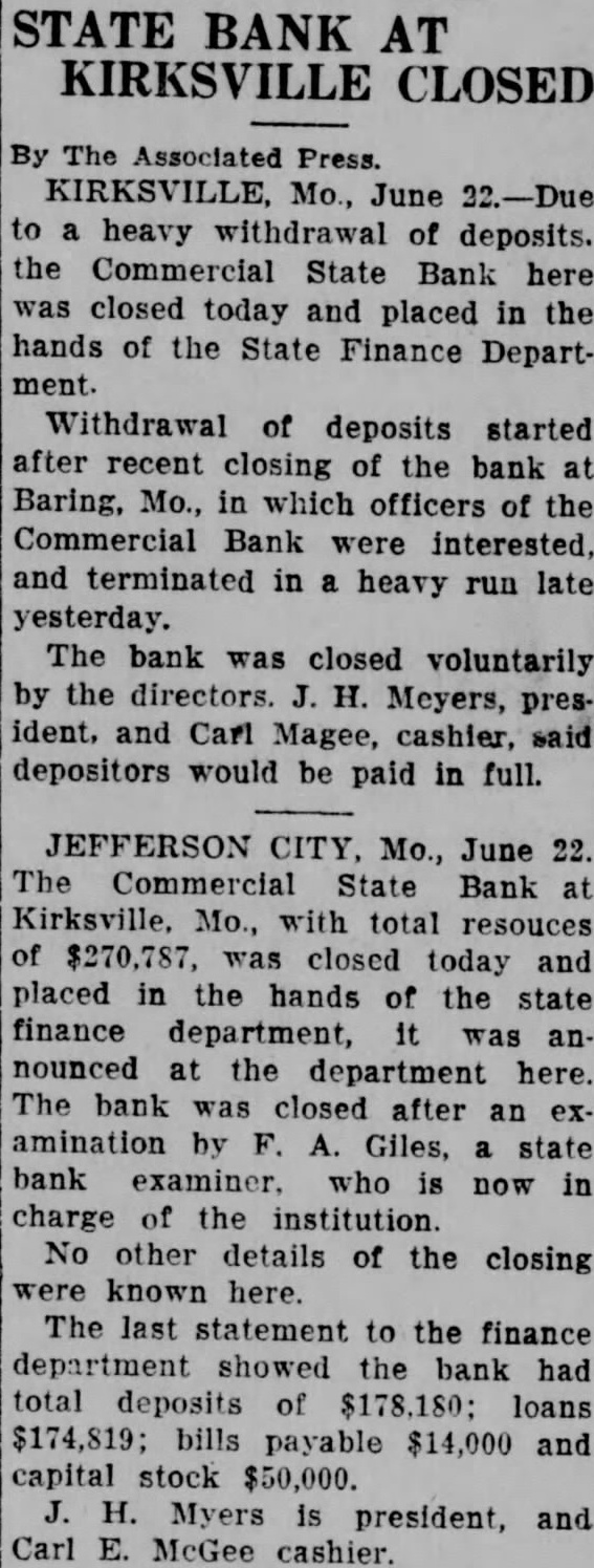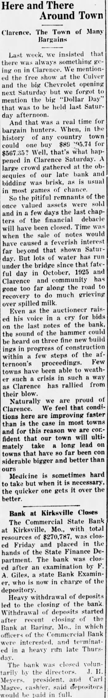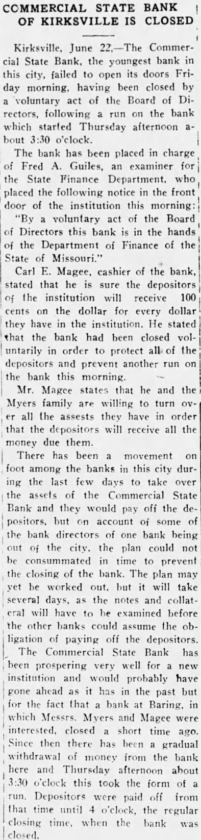 Mr. and Mrs. Roy Ratliff and son of Jefferson City are visiting friends and relatives in Kirksville. Mr. and Mrs. S. W. Arnold and daughter, Miss Alyce, and sor, Sam, returned Friday morning from New York City, where they attended the graduation of Miss Dorothy from the DamroschSchóol of Music. She is now in France where she is continuing her musical studies. Mrs. Thelma Campbell, of this city, a delegato at large to the Democratic convention at Houston had her pocket book stolen last Wednesday at the Rice Hotel The pocket book contained $60 in cash, a delegate's badge and other articles. The pocket book was found iater, but thedelegate's badge and all the money but 2 cents had been taken. Mrs. Campbell left her pocket book lying on the table and went into another room for a moment, and when she roturned the pocket book was gone. The Commorcial State Bank failed to open its doors for business Friday morning. It had been closed by a voluntary act of the board of directorsr and has been placed in the hands of Fred A. Guiles, an examiner for the State Finance Department. Since the failure of the bank at Baring in which Mr. Myers, president of the Commercial Bank, and Carl E. McGee, cashier, owned a majority of the stock, there h a d been a quiet withdrawal of deposits from heCommercial Bank. Late Thursday afternoon there was a run on the bank and the directors voluntarily closed the doors to prevent a further run Friday morning. Nothing has been given out by the bank examiner in charge, but in winding up the bank's affairs, if no money is wasted, there will be more topay off the depositors and several thousand dollars to spare, It will take about $190,000 to square the bank's liabilities. The capital stock of $50,000 and unencumbered real estate at a low valuation and the notes due the bank aremore than sufficient 10 cover all deposits, after allowing a large amount for the bad notes.