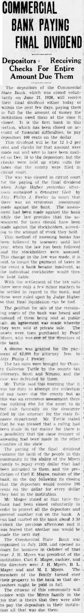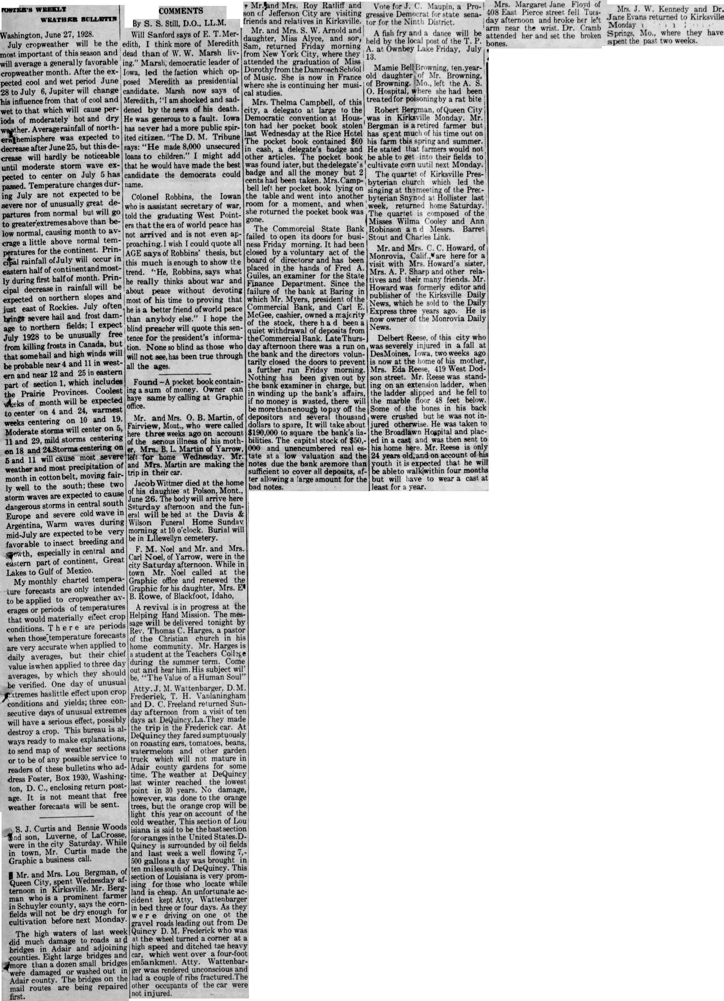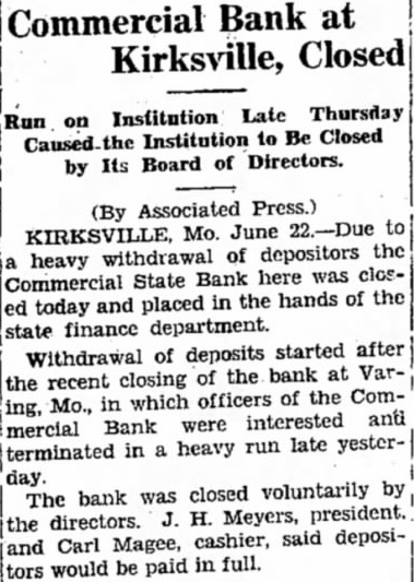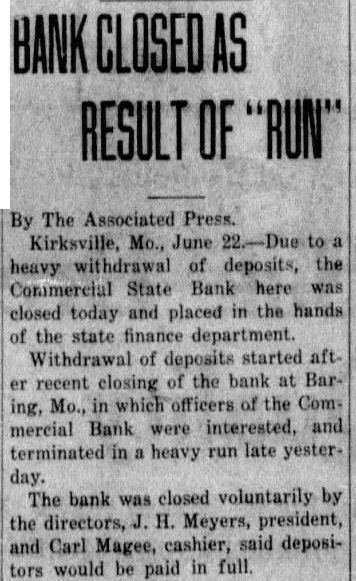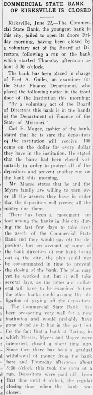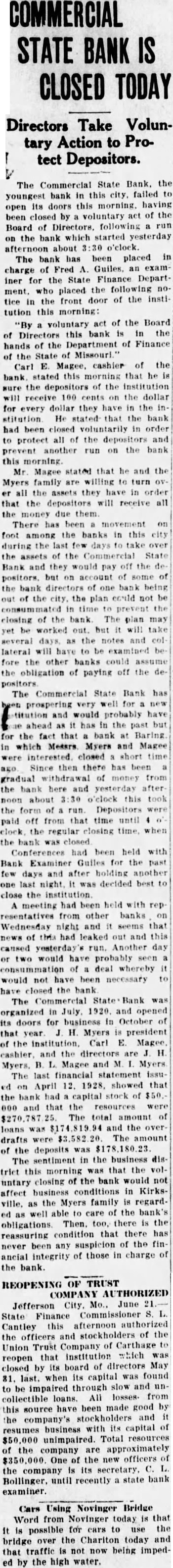 Mr. and Mrs. Roy Ratliff and son of Jefferson City are visiting friends and relatives in Kirksville. Mr. and Mrs. S. W. Arnold and daughter, Miss Alyce, and sor, Sam, returned Friday morning from New York City, where they attended the graduation of Miss Dorothy from the DamroschSchóol of Music. She is now in France where she is continuing her musical studies. Mrs. Thelma Campbell, of this city, a delegato at large to the Democratic convention at Houston had her pocket book stolen last Wednesday at the Rice Hotel The pocket book contained $60 in cash, a delegate's badge and other articles. The pocket book was found iater, but thedelegate's badge and all the money but 2 cents had been taken. Mrs. Campbell left her pocket book lying on the table and went into another room for a moment, and when she roturned the pocket book was gone. The Commorcial State Bank failed to open its doors for business Friday morning. It had been closed by a voluntary act of the board of directorsr and has been placed in the hands of Fred A. Guiles, an examiner for the State Finance Department. Since the failure of the bank at Baring in which Mr. Myers, president of the Commercial Bank, and Carl E. McGee, cashier, owned a majority of the stock, there h a d been a quiet withdrawal of deposits from heCommercial Bank. Late Thursday afternoon there was a run on the bank and the directors voluntarily closed the doors to prevent a further run Friday morning. Nothing has been given out by the bank examiner in charge, but in winding up the bank's affairs, if no money is wasted, there will be more topay off the depositors and several thousand dollars to spare, It will take about $190,000 to square the bank's liabilities. The capital stock of $50,000 and unencumbered real estate at a low valuation and the notes due the bank aremore than sufficient 10 cover all deposits, after allowing a large amount for the bad notes.