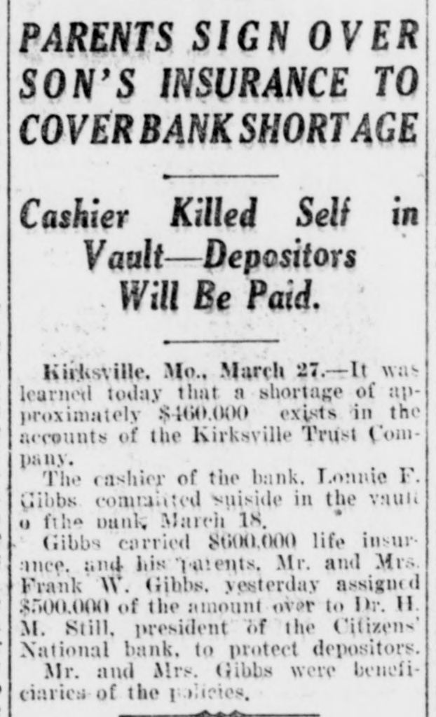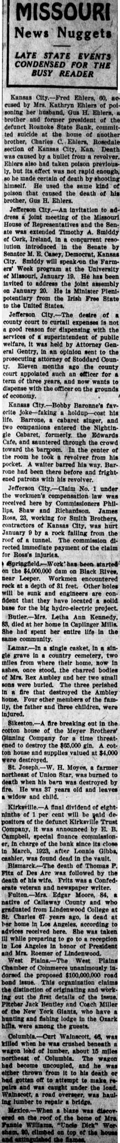 Kansas Ehlers, 60, cused by Kathryn Ehiers soning her husband, Gus brother former the defunct Roanoke State Bank, committed suicide at the home of another brother, Charles Ehiers, Rosedale section of Kansas City, Kan. Death caused by bullet from revolver. Ehlers also had taken poison previously, but Its effect was not he made certain of death by shooting himself. He used the same kind poison that caused the death of his brother, Gus H. Ehlers. Jefferson invitation dress meeting of the Missouri House of Representatives and the Senate was extended Timothy Smiddy of Cork, Ireland, in conçurrent resolution introduced in the Senate by Senator Casey, Democrat, Kansas City. Smiddy will the Farmers' Week program at the University Missouri, January 19. He has been invited to address the joint assembly January 20. He is Minister Plenipotentiary from the Irish Free State the United States. Jefferson desire of county court to curtail expenses is not good reason for dispensing with the services of of public welfare, was held by Attorney General Gentry, in an opinion sent to the prosecuting attorney of Stoddard County. Eleven months ago the county court appointed such an officer for term of three years, and now wants to dispense with the officer on the grounds economy. Kansas Baronne's favorite his life. Barrone, cabaret singer, and two companions entered the Nightingle Cabaret, formerly. the Edwards Cafe, and sauntered through the crowd toward the barroom. In the center of the room he took revolver from his pocket. waiter barred his Barrone had been there before and frightened patrons with his revolver. Jefferson No. under the workmen's compensation law was received here by Commissioners Phillips, Shaw and Richardson. James Ross, 23, working for Smith Brothers, contractors of Kansas City, was hurt January by rock falling from the roof of tunnel. The commission rected immediate payment of the claim for Ross's injuries. on the $4,000,000 dam on Black Rivew, near Leeper. Workmen encountered rock depth of feet. holes will be sunk and engineers are confident that they have located solid base for the big project. Letha Ann Kennedy, died at her home in Caplinger Mills. She had spent her entire life in the same community. single casket, In single grave in country cemetery, two miles from where their home. now in ashes, once stood, the charred bodies Mrs. Rex Ambley and her two small sons were burled. The three perished fire that destroyed the Ambley home. Four other members of the famIly, the father and three children, were injured. fire breaking out in the cotton house of the Meyer Brothers' Ginning Company for time threatened to destroy the $65,000 gin. ton house and supplies valued $4,000 were destroyed. H. Moyes, farmer northeast of Union Star, was burned to death when his barn was destroyed by fire. He was old and leaves years widow and child. dividend of eightninths of per cent will be paid depositors of the defunct Kirksville Trust Company, It was announced by Campbell, special finance commissioncharge of the bank since its close in March, 1923, after Lonnie Gibbs, cashier, was found dead in the vault. death of Thomas Fitz of Des Are was followed by the death of his wife. Fritz was Confederate veteran and writer. Edgar Moore, 84, native of Callaway County and who graduated from Lindenwood College St. Charles 67 years ago, is dead at her home in Los Angeles, according to advices received here. She was taken while preparing to reception Los Angeles in honor of President and Mrs. Roemer of Lindenwood. West West Plains Chamber of Commerce unanimously indorsed the proposed $100,000,000 road bond issue. This organization claims the distinction of originating and workout the first details of the issue. Pitcher Jack Bentley and Coach Miller the New York who have hunting and fishing lodge in the Ozark hills, among the guests.