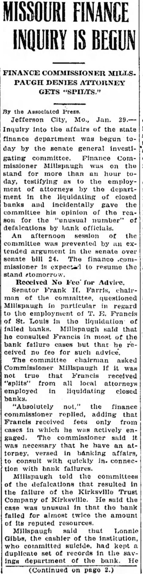 FINANCE INQUIRY MILLS. PAUGH DENIES ATTORNEY GETS the Associated Press. Jefferson City, Mo., Jan. Inquiry the of the state finance department was begun by the senate general investigating committee. Finance Commissioner Millspaugh was on the stand than an hour day, testifying the employment of attorneys by the department liquidating of closed banks and incidentally gave the committee his opinion the for the "unusual number" of by bank officials. An afternoon session of the committee was prevented by tended argument in senate over senate bill 24. The finance missioner expected to resume the stand Received No for Advice. Senator Frank H. Farris, man of the committee, questioned Millspaugh in particular regard the employment Francis of Louis liquidation failed banks. Millspaugh that consulted Francis most of the bank failure cases but that he no for advice. committee chairman asked Commissioner Millspaugh WAS not true that Francis received from all local employed in liquidating closed banks. "Absolutely the finance commissioner replied, adding that Francis received fees only from cases which he actively gaged. The commissioner necessary that have an versed banking affairs, to consult with quickly tion with bank failures. Millspaugh told the committees the defalcations that resulted the failure the Kirksville Trust Company Kirksville. He suld the unusual that the bank falled for almost twice the amount reputed resources. Millspaugh that Lonnie Gibbs, of the institution, committed had kept duplicate of records the department of the bank.