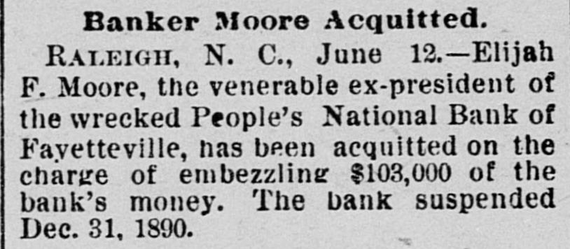 THE PEOPLE'S NATIONAL BANK CLOSE FOR $80,000. Grady Arrested for the Murder of HisWife-Seven Negro Children Roaster d Alive- War of Words Between Editors. North Carolina News. RALEIGH. N. C., Dec. [Special. A special from Fayetteville to-night announces that the People's National Ban OF that city closed its doors to-day on account of a heavy run made upon it. The run was caused by the failnee of the former president of the bank, E. F Moore, who recently resigned, and whose affairs are in bad condition. Th. liabilities are stated at $80,000. and the as sets $200,000. It is claime that the deposi tors will be paid dellar for dollar. and that the bank was closed so'ely 01 account of a run, which for a while looked paricky. The closing of the bank resulted in the failure of G.W. Ingram, J. L Taarm, and George Rosenthal, merchants of Fayetteville A NEW YEAR WEDDING To-morrow afternoon. in Edenton Street M E. chureb, in this city. Rev. J. D. Arnold of the faculty of Asheville Female College. of the most prominent ministers in the is estern North Carolina Conference. will be united in marriaze to Miss Nannie Clark of this city, sister of Associate Justice Walter Clark, of the North Carolina Supreme Court bench. GOVERNOR FOWLE IN HIS NEW HOME Governor Fowle to-day begun moving into the new Governor's Mansion, on Blount street, which is now completed. and which has been turned over to him by the State Public Buildi g Committee. WAR OF WORDS BETWEEN EDITORS. Editor Fairbrother of the Durbam Daily Globe, to-day replied to the attack made upon him vesterday by Josephus Daniels editor of the State Chronicle, in which Daniels referred to him as a coward and blackguard. Fairbrother's reply is very abusive of Daniels, and closes with in iting him t a personal settlement if he desires it, as be said, as his editorial intimates. KNIGHTS OF PYTHIAS BANQUET Last night the Knights of Pythias of this city held a grand banquet at which covers were laid for 125. After re'reshments were served speeches were made by his Honor A.A. Thompson. Captain E. R. Stamps, Grandsire C. M. Busbee, Joseph J. Bernard, Esq., Rev. George 1 underlid, George H. Snow, Esq.. and others. Mr. Hal W. Aver, late city editor of the Daily Chronicle of this city, left to-day for Washington, where be goes to take the position of private secretary to Colonel L. 1. Polk. president of the National Farmers' Alliance. DEPUTY COLLECTOR HAWKINS' SUCCESSOR E. A. White, collector of internal rever nue for the Eastern district of North Carolina, has appointed Benjamin Hawkins deputy collector of Vance, Franklin, and Warren counties, to succeed his father General Phil. B. Hawkins, who has resigned on account of illness. SEVEN CHILDREN ROASTED ALIVE A special from Bay boro, in Pamlico county, brings the blood-curdling news of the burning alive of seven negro children near that place Sunday night. A colored man named Scott Thompson, his wife and oldest child, who live five miles below Bayboro, went to church Sun. day night, leaving seven children, tive of them his own and two of them his grandchildren at home, their ages ranging from infancy to above tifteen years of age. Before the services were concluded it was discovered that their home was on fire, and the congregation made a rush for it. On nearing the scene of the conflagration the agonizing screams of the children could be plainly heard. but when the place was reached the building had fallen in, and every one of the inmates had perished in the flames. It is supposed that the tire aught in some way from the chimney, and spread rapidly, and all the children being sound asleep, did not awaken until the flames had cut off all egress. CHARGED WITH HIS WIFE'S MURDER Tilla J. Grady and his daughter-in-law were brought here to-day from Millbrook, in this county, and committed to jail, charged with the murder of Grady's wife by poisoning last week. Grady is about sixty years old and his daughterin-law is about twenty-two, and has a child only a few months old. Grady and wife have not lived happily together for many years. and she has Ire. quently had Grady arrested and before courts for squalt and battery upon ber. Since her son married he and his wife have been alivingwith Gradv The elder Mrs.Grady has imagined that her husband and her daughted-in-law saw too much of each other, and this has caused Tilla Grady's of wife to become intensely jealous her husband and her daughter-inlaw. On Monday of last week the four in family took breakfast together, and very soon atterwards Mrs. Tilla Grady was taken violently ill with symptoms that indicated menical poisoning and died in four hours. Her husband had left home as soon as be finished break. fast, and was not there when his wife died. The deceased declared from the time she was taken ill till she died that her husb and and daughter had poisoned her by putting something in the coffee which she drank. The coroner has for sev. eral days been holding an inquest, and the evidence was found to be sufficient for to hold the accused parties action by the grand jury. The body of Mrs. Grady has not been exbumed, but will be, and a post-mortem examination will be held at once. The family are well-known, and the affair creates great interest.