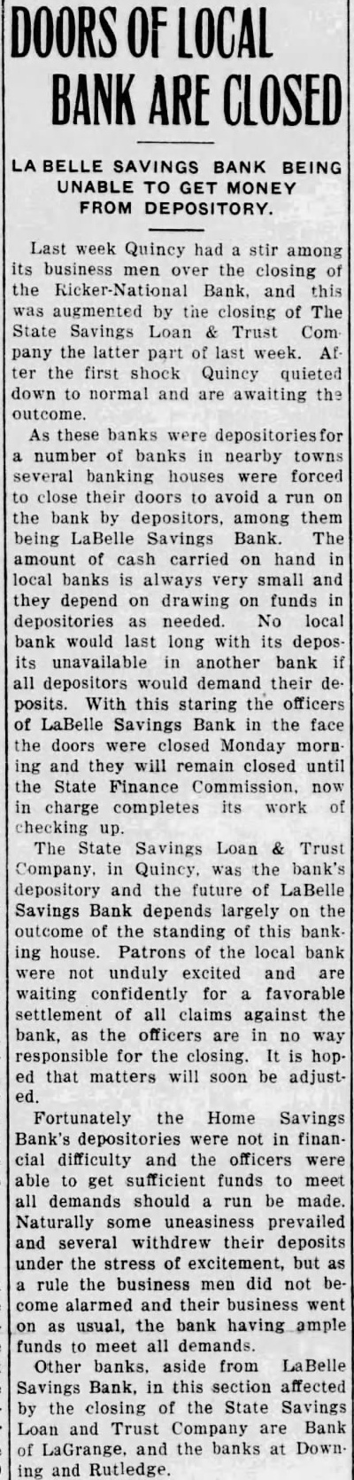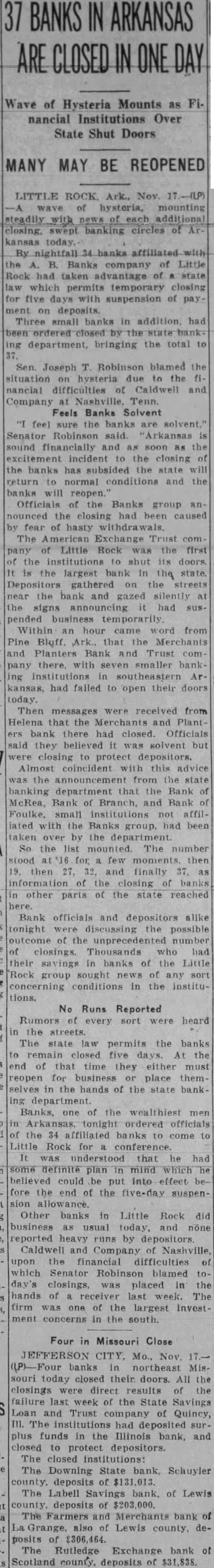 37 BANKS IN ARKANSAS CLOSED ONE DAY Wave of Hysteria Mounts as Financial Institutions Over State Shut Doors MANY MAY BE REOPENED LITTLE Ark., Nov. of mounting banking circles of By nightfall 34 banks affiliated Banks company of Little Rock had taken advantage of which permits temporary closing five days suspension of pay. on deposits. Three small banks in addition had ordered closed the state bank department, bringing the total Sen. Joseph Robinson blamed the hysteria due the nancial difficulties Caldwell and Company Nashville, Tenn. Feels Banks Solvent feel sure the banks solvent," Senator Robinson said. "Arkansas sound financially and soon the excitement the closing the banks has subsided the state return normal conditions and the reopen. Officials the Banks group nounced the closing had been caused fear of hasty withdrawals. The American Exchange Little the first the institutions shut its doors is the largest bank the state Depositors gathered the streets the bank and gazed silently at the announcing had suspended temporarily Within hour from Pine Bluff. the Merchants and Planters Bank and Trust company there. smaller banking institutions southeastern kansas, had failed to open their doors today. Then messages received from Helena that the Merchants Plant ers bank there had closed. Officials said they was solvent but closing protect depositors. coincident this advice the announcement from the department that the Bank McRea, Bank of Branch, and Bank Foulke, small affillated with the Banks group, had taken by the So the list The for few 19. then 27, 32, finally 37. of the closing other parts of the state reached Bank officials and depositors alike tonight the possible outcome of number of closings. Thousands who had their savings in banks of the Rock group any sort conditions in the institutions. No Runs Reported Rumors heard in the The state law permits the banks to five the end of that time they either reopen for place themselves in the hands of the state bank. ing Banks, one of the wealthiest men officials the 34 affiliated banks come Little Rock for that he had definite plan mind which could be put into effect before the end of the five-day suspenOther banks in Little Rock did business as usual today, and reported runs by depositors. Caldwell and Company of Nashville, difficulties of which Senator blamed today's closings, was placed in the hands of receiver week. The firm was one of the largest investin the south. Four in Missouri Close JEFFERSON CITY. Mo., Nov. banks northeast Mis. souri today closed their doors. All the closings were direct results the failure last week of the State Savings Loan and Trust company of Quincy, III. The institutions had deposited plus funds in the Illinois bank, and closed protect depositors. The closed institutions: The Downing State bank, Schuyler deposits of The Labell Savings bank, of Lewis deposits of The Farmers and Merchants bank of Grange, Lewis county, deposits The Rutledge Exchange bank of Scotland county. deposits of